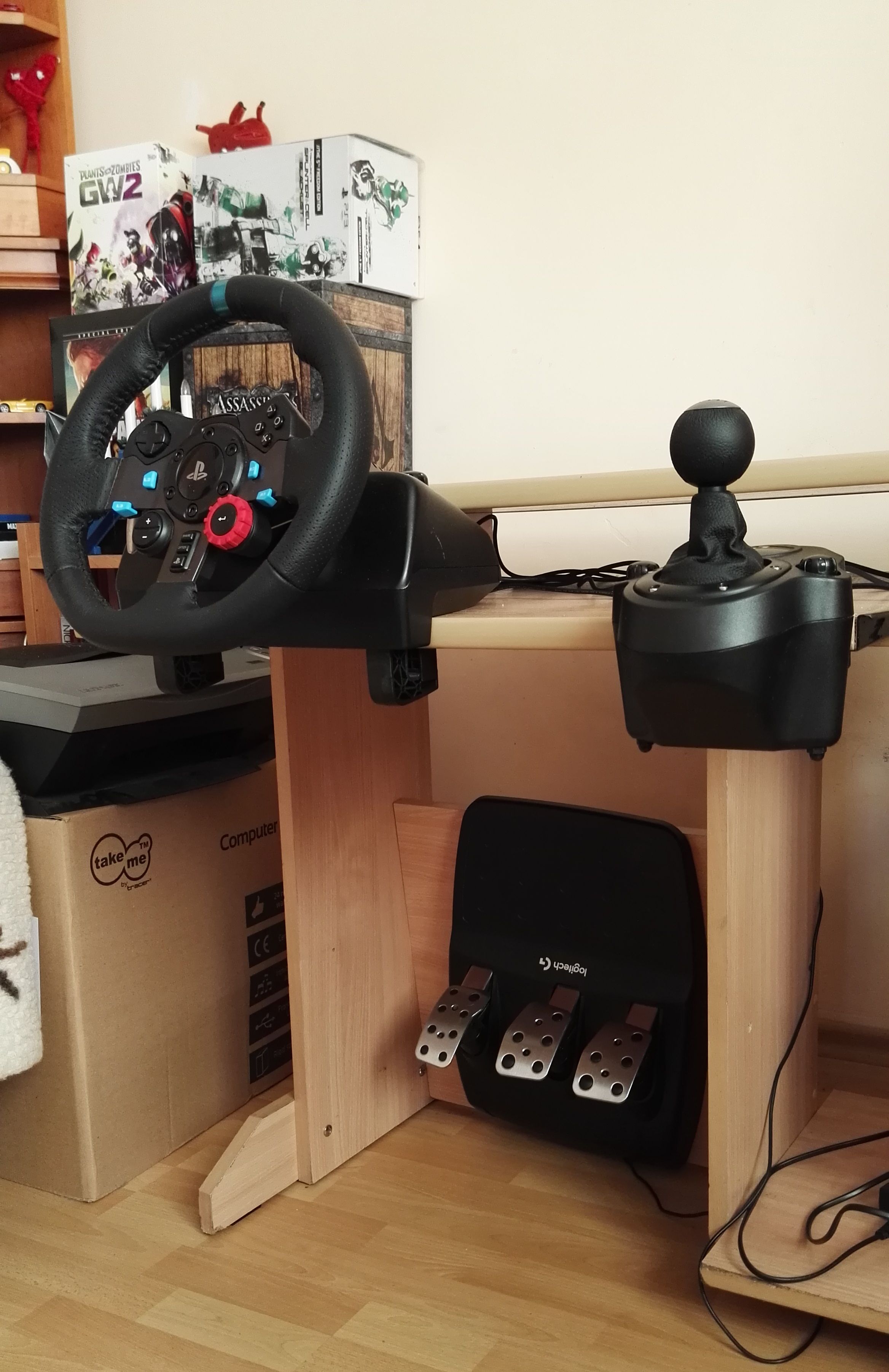 Pierwszym miłym zaskoczeniem przy podłączaniu była dla mnie organizacja kabli, które podpinamy do serca kierownicy. Wszystkie cztery gniazda znajdują się pod spodem, do tego w podstawce wycięte są specjalne rowki, w których umieszczamy kabelki. Dzięki temu wszystkie kable mamy ładnie zorganizowane za kierownicą i nic nam luźno nie wisi. Kolejnym miłym zaskoczeniem jest dla mnie „imadłowe” mocowanie kierownicy do blatu. Po obu stronach podstawki mamy takie dwa zaczepy w kształcie litery „L”. Na nich są dwie śruby, którymi dokręcamy kierownice do blatu, po dokręceniu możemy także zablokować te nakrętki, aby przypadkiem nic nam się nie poluzowało. W podobny sposób montujemy skrzynie biegów do blatu. Będąc jeszcze przy mocowaniu, to warto podkreślić, że podstawka z pedałami ma taki fajny, wysuwany zaczep z ząbkami, dzięki którym pedały nie przesuwają się po dywanie.
