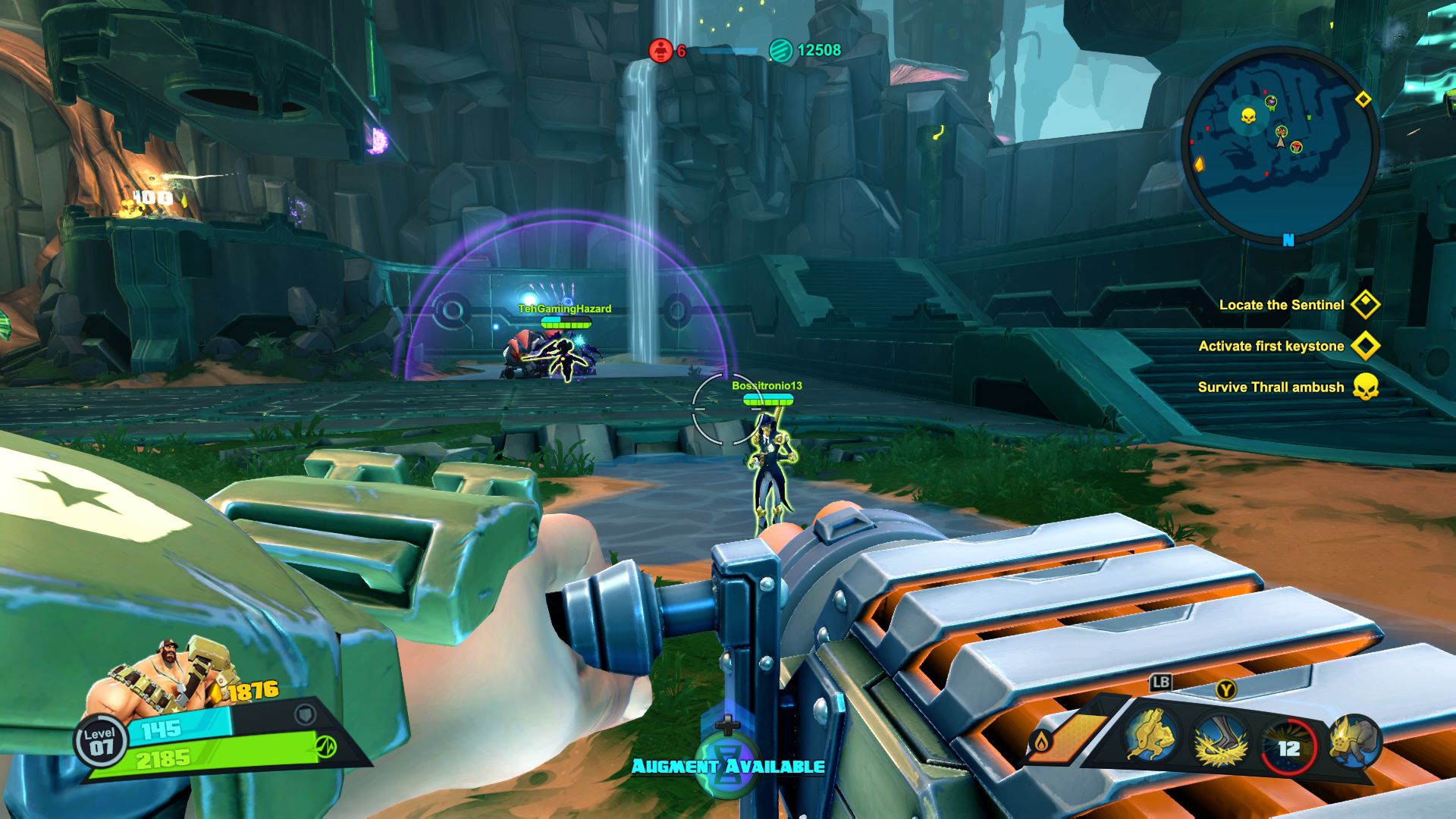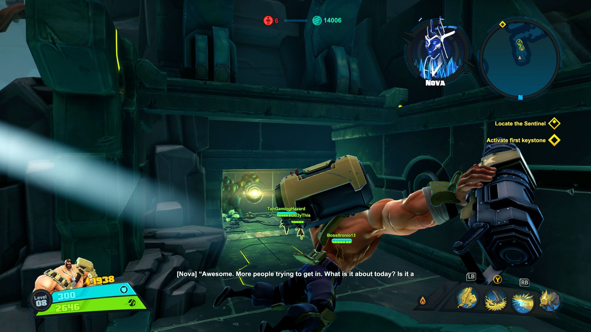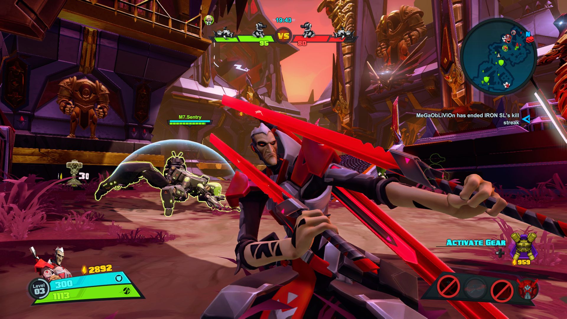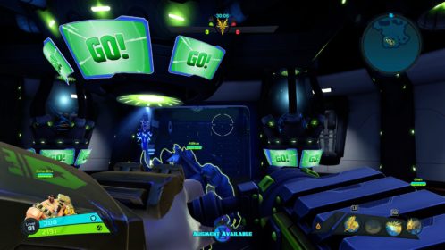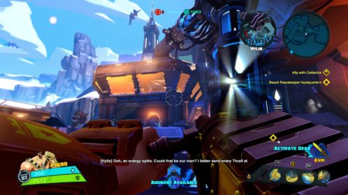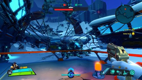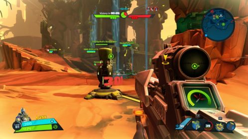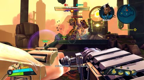 Nie jest tak różowo, jeśli chodzi o dostępne tryby gry. Mamy dostęp do story i trzech trybów wieloosobowych, tyle. W story możemy grać samotnie lub z czwórką kompanów online. W trybach gracz kontra gracz możemy grać z żywymi ludźmi lub prywatnie z botami. Do tego dochodzi opcja gry na podzielonym ekranie, coś rzadko spotykanego, wielkie brawa. Story daje do dyspozycji 9 misji, są one monotonne i nieciekawe. Opierają się na prostym schemacie, przemy przed siebie zabijając masy wrogów, ulepszamy postacie, wykupujemy wieżyczki i wykonujemy jakiś cel. Jest ich tylko kilka, mamy ochronę jądra systemu, eskortę dużego robota-robaka i zabijanie bossów. Wszystko kręci się wokół tego. Oczywiście grając online jest ciekawiej, mniej biegania i gra się raźniej. Gra potrafi się też wysypać po 40 minutach misji przez utratę połączenia zostawiając nas z niczym. Jeśli inny gracz wyjdzie lub zostanie rozłączony misja jest kończona w niepełnym składzie, co też potrafiło prowadzić do porażki. Ba, nawet jeśli gracz się rozłączy podczas wyboru postaci ruszamy w niepełnym składzie. Mimo wszystko gonitwa po poziomie czy to w piątkę czy mniejszej ekipie sprawia dużo radochy. Wszędzie porozrzucane są power-upy dające punkty, czasowe przyspieszenie postaci, pancerz itd. Możemy też znaleźć odłamki pełniące rolę waluty w meczu. Kupujemy za nie wieżyczki, których jest kilka rodzai, stacje leczące, przyspieszające czy też pomocne w innych trybach minionki. Część wieżyczek możemy ulepszać na kolejne poziomy. Wszystko to daje dużo możliwości i potencjału, ale jednak coś nie zagrało, projekt story jest po prostu nudny. Rozmowy między bohaterami potrafią wywołać uśmiech, postacie rzucają one-linerami doskonale puentując rozmowy. Robią to z humorem, który znamy z innych gier Gearbox. Jednak tu brakuje mi ekspozycji wydarzeń, wszystko dzieje się w tle, głównie na bazie rozmów przez radio.
