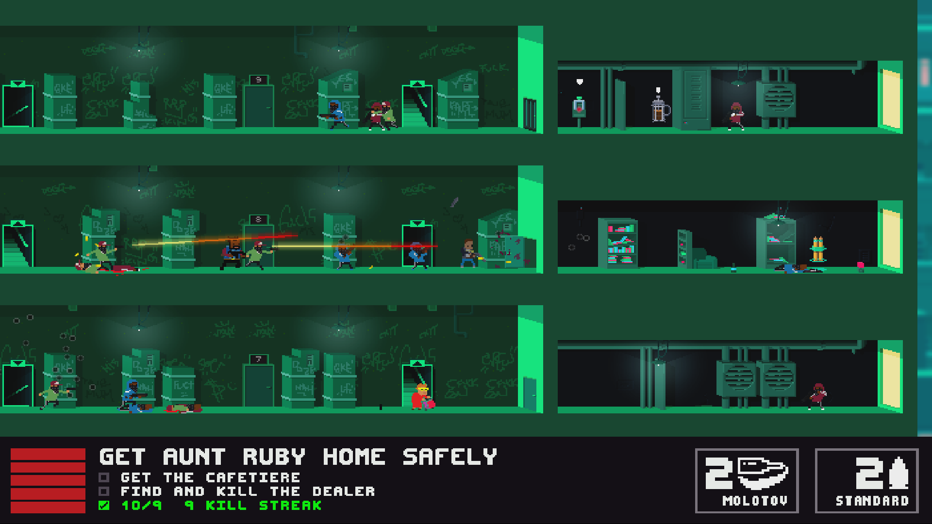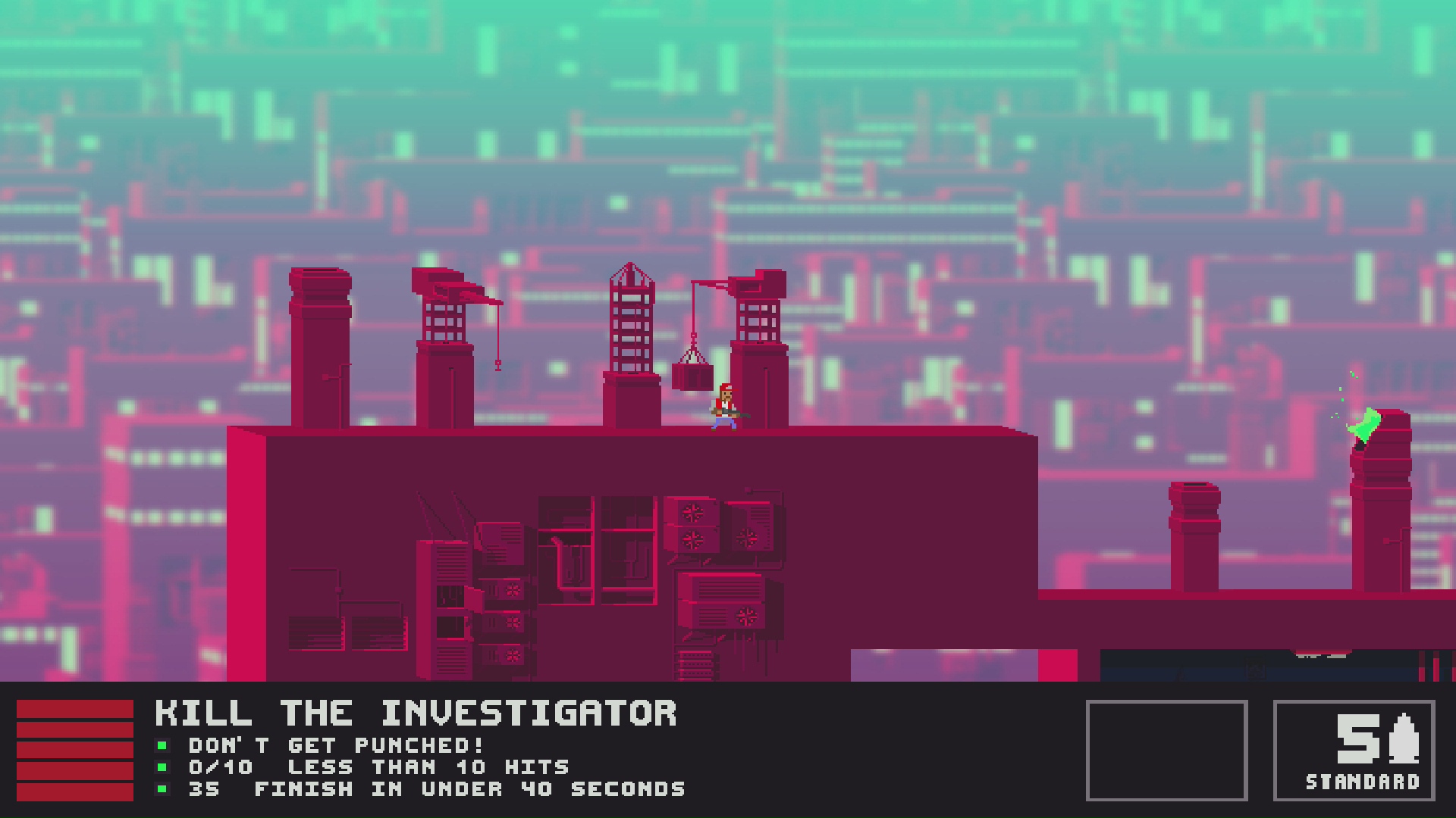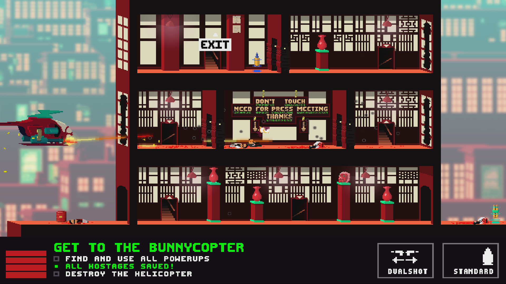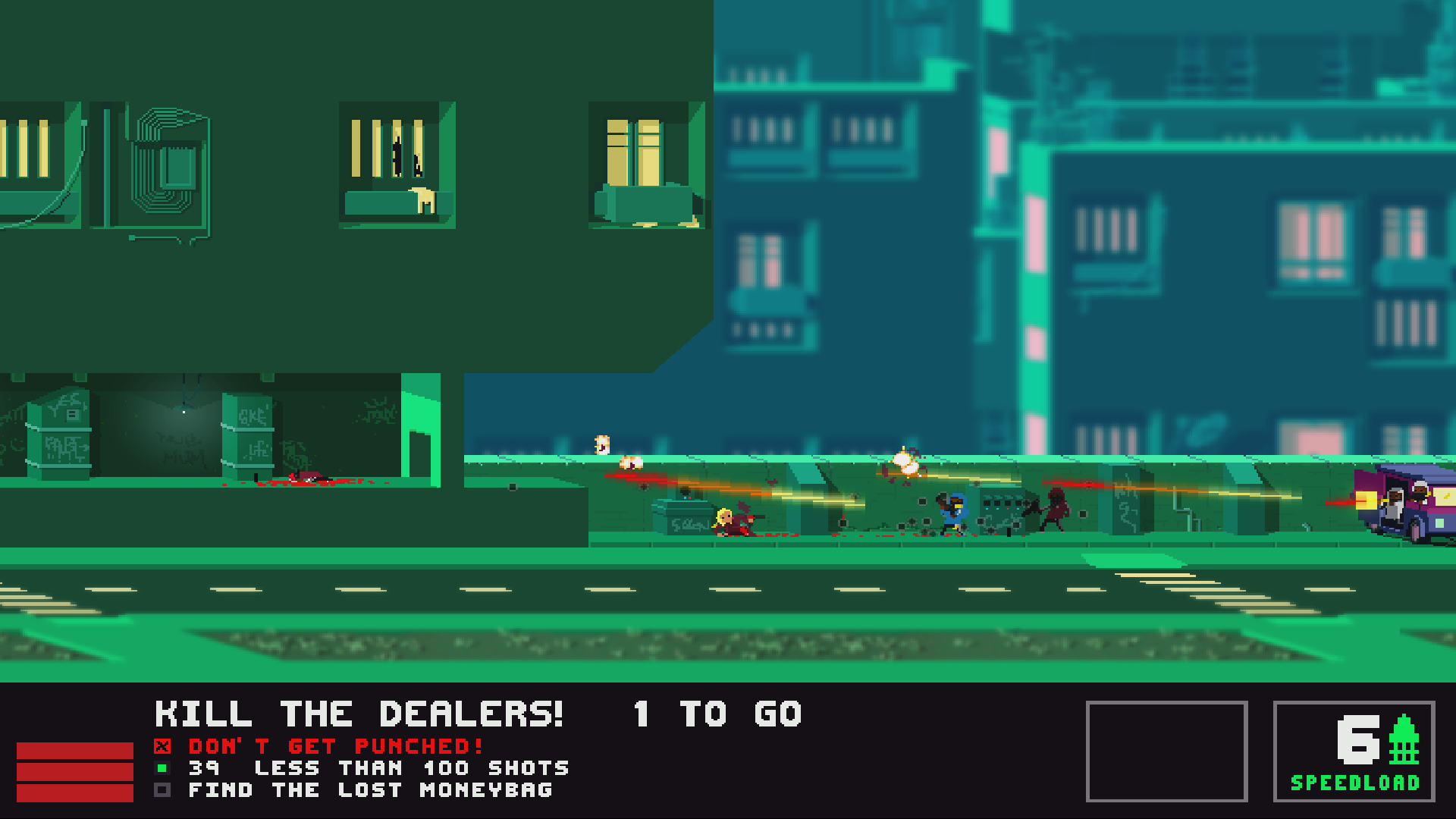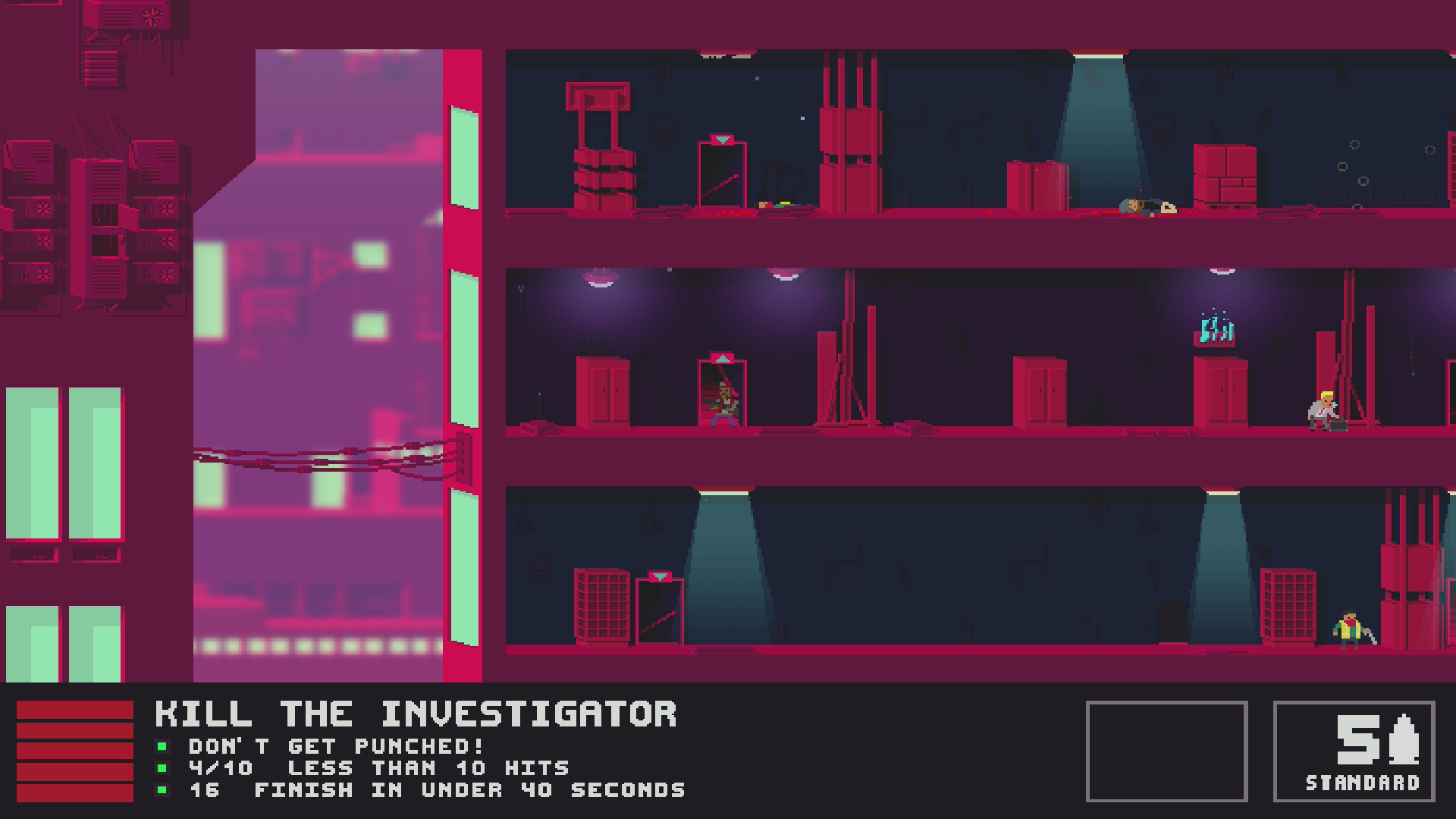 Pierwsze co przyszło mi do głowy po uruchomieniu tej gry do Hotline Miami. Oczywiście widok jest trochę inny. W Miami widzimy akcję od góry, tutaj zaś z boku, ale sama koncepcja jest podobna. Sterujemy bohaterem, który uzbrojony w broń musi przedostać się przez kolejne poziomy.