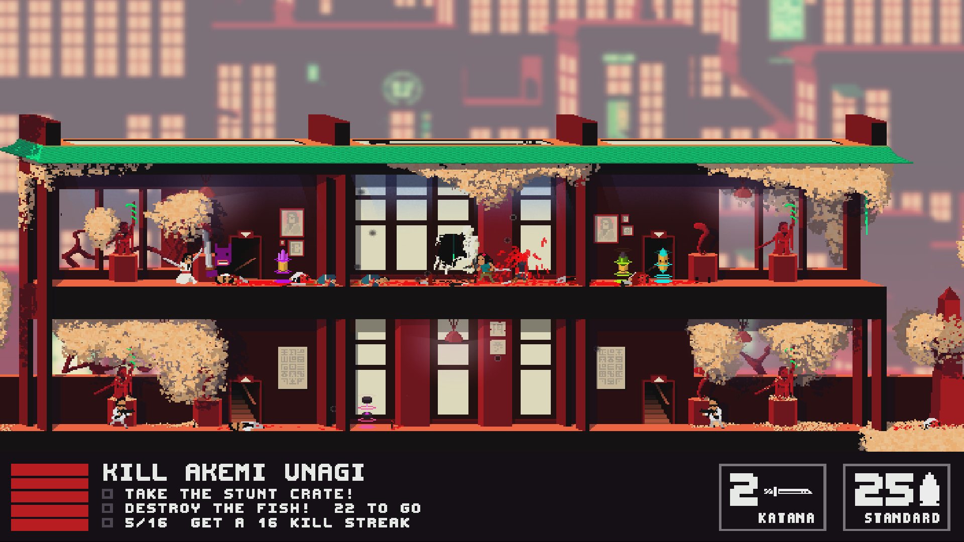 Na początku porównałem tytuł do Hotline Miami, ale nie wszystko jest tutaj takie same. Przede wszystkim poziom zaczynamy już uzbrojeni, nie możemy też podnosić broni po przeciwnikach. Czasami z któregoś przeciwnika wypadnie amunicja specjalna czy granaty, ale jak zaczęliśmy poziom postacią z pistoletem, to cały poziom przechodzimy właśnie z takim orężem.