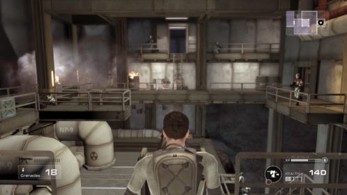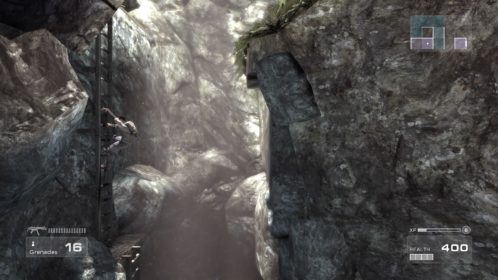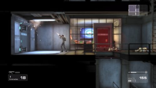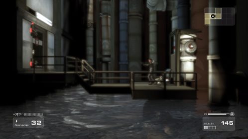 Co nią jest wyjaśnię za chwilę. Aby to zrobić, muszę wspomnieć Wam, że pozycja jest klasycznym przykładem labiryntówki czyli metroidvani. Nazwa ta pochodzi od największych klasyków tego gatunku, czyli serii Metroid oraz Castlevani. Przemierzamy więc tytułowy kompleks za pomocą mapy zbudowanej z kwadratów. Dzięki niej łatwo znajdziemy drogę do aktualnego celu (droga jest zaznaczona) i nie zgubimy w labiryncie pomieszczeń oraz korytarzy. Budowa gier tego typu oznacza, że przemieszczamy się większość czasu po tych samych lokacjach (backtracking). Jak wygląda to w praktyce? Dostajemy się z punktu A do punktu B. Następnie musimy udać się do punktu C, jednak aby to zrobić, wracamy tą samą trasą z punktu A do B. Aby nie było to śmiertelnie nudne, dobra labiryntówka musi posiadać bardziej lub mniej poukrywane skróty. Większość z nich oparta jest na nowych umiejętnościach lub broniach, które zdobywamy w trakcie zabawy. W Shadow Complex odnajdujemy dodatki do broni – granaty, rakiety, pianka (dzięki której unieruchomimy urządzenia), czy linka z hakiem. Tego, gdzie możemy użyć danej broni dowiemy się dzięki latarce. Po podświetleniu danego obiektu świeci się on różnymi kolorami w zależności od potrzebnej broni (np. czerwony to rakiety, zielony – granaty). Dodajmy do tego jeszcze zbroję, którą rozbudowujemy o nowe właściwości (szybkie bieganie, możliwość podlatywania). W trakcie rozgrywki nasza postać zbiera doświadczenie, dzięki czemu zwiększa się jej celność, wytrzymałość itp. Działa to jednak automatycznie i nie mamy na to żadnego wpływu. Szkoda.