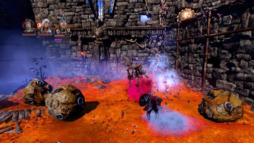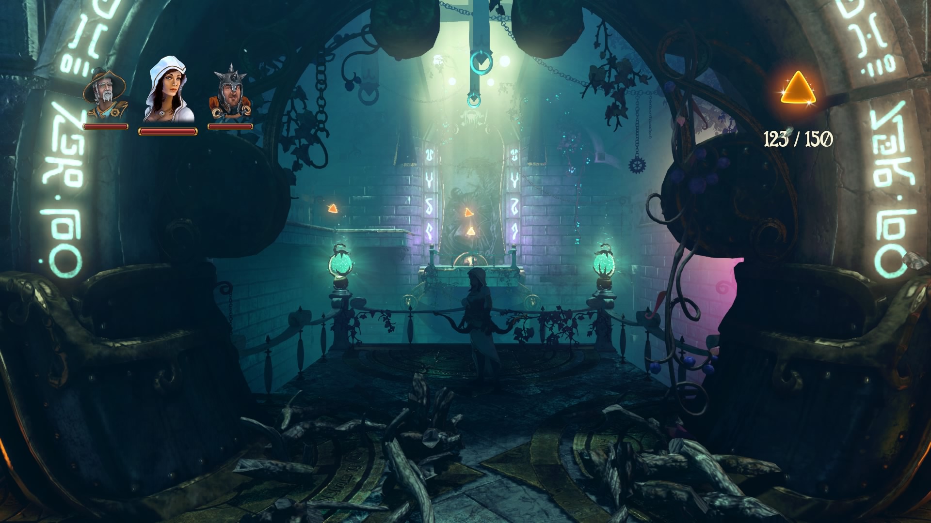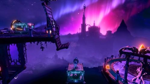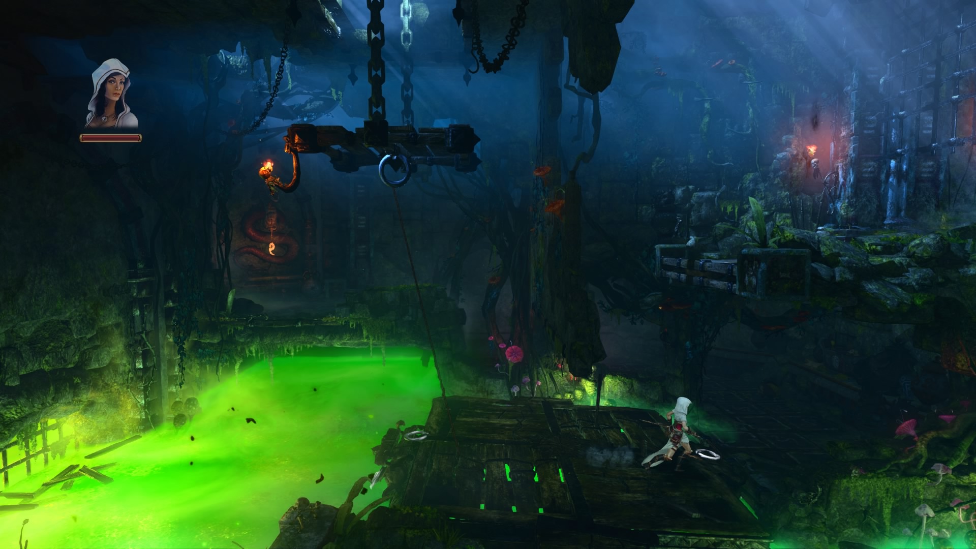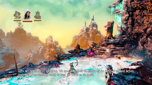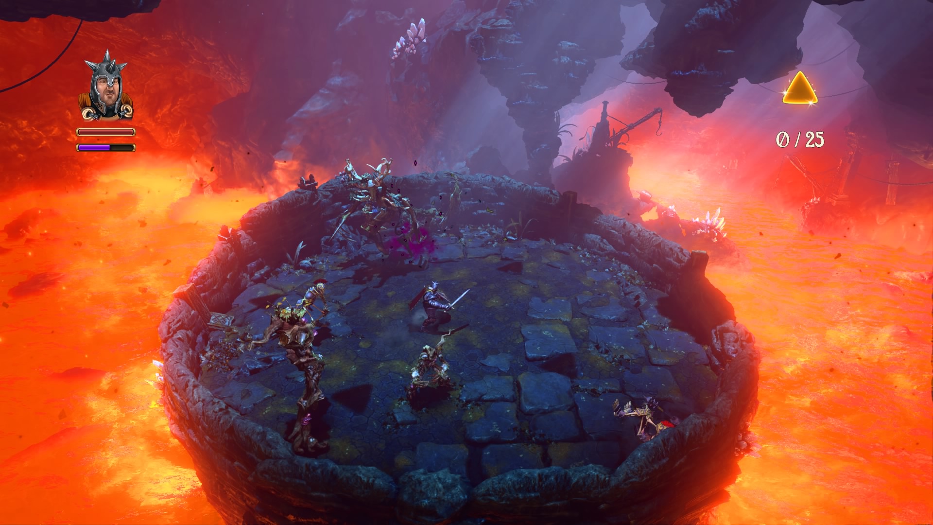 Pozostając w temacie poziomów zostały one podzielone na wprowadzenie postaci, poziomy fabularne i mniejsze dodatkowe. Poziomy fabularne są standardowymi długimi planszami. Teraz po przejściu możemy zaliczać ich konkretne fragmenty, w których pominęliśmy trójkąty. Dodatkowo mamy też mniejsze poziomy, które polegają na rozwiązaniu prostej zagadki, zwykłym przejściu lub też bywają standardowymi killroomami. Tu jest właśnie pies pogrzebany, zawartości w tej grze brakuje na każdym kroku. Przejście całości to zaledwie 5 godzin. Wyzbieranie wszystkiego zajmuje kolejną godzinę, maks dwie. Już nie wspominając jak ekipa z Frozenbyte postanowiła zakończyć tę “część”. Nic się nie rozwiązuje, a my dostajemy prosty przekaz – do zobaczenia. I to podany w sposób jak byśmy faktycznie zobaczyli 1/3 całego produktu.