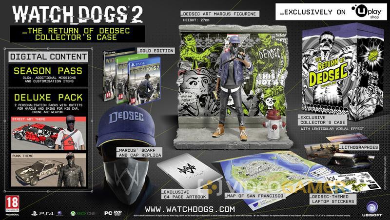 • The return of DedSec Collector’s Pack – gra, pakiet Gold, replika szalika oraz czapki Marcusa, figurka, 64 stronicowy artbook, litografie, mapa San Francisco, nalepki na laptopa