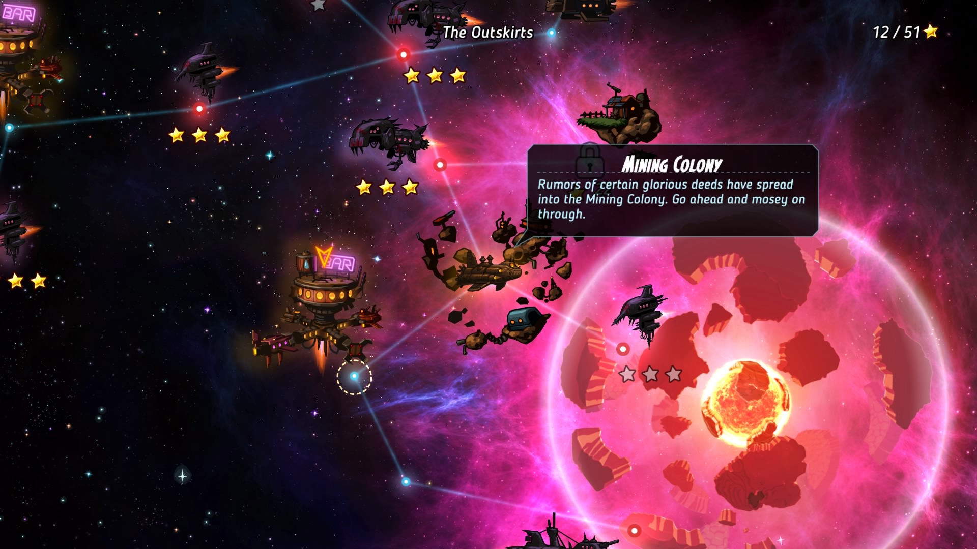 Cała jej moc leży w turowej rozgrywce. Wybieracie nową misję z mapy 2D (ewentualnie któryś z barów gdzie można rekrutować nowych członków załogi oraz zakupić przedmioty/broń) i ruszacie do akcji. W zadaniu bierze udział od 1 do 4 członków waszej drużyny. W każdej rundzie możecie wykonać ruch na określoną odległość oraz wykonać akcję – oddać strzał lub skorzystać z umiejętności specjalnej (np. leczenie). Cała siła tkwi w tym, iż strzał musicie najpierw odpowiednio wymierzyć na dwuwymiarowej planszy. Nie jest to wcale takie proste. Tym bardziej, że kula może rykoszetować od ścian lub innych przeszkód. Jest to równie często przeszkodą, jak i ułatwieniem, ponieważ równie dobrze można celowo strzelić pod kątem, aby przeciwnik oberwał kulą odbitą wcześniej od sufitu. Satysfakcja nie do opisania. Niektóre z broni posiadają laserowy wskaźnik, co bardzo ułatwia celne rykoszetowanie. Oprócz walki na losowo generowanych planszach zdobywacie worki lub skrzynki z ciekawymi przedmiotami. Na ogół jest to woda (waluta w grze), nowe bronie oraz przedmioty takie jak pancerze, czy kapelusze. Tak, dobrze czytacie – kapelusze. Możecie je kupować lub (jeśli jakiś przeciwnik ma interesujące was nakrycie głowy) zestrzelić mu go z metalowej czaszki! Kapelusze nie mają żadnych właściwości. Chodzi o czyste zbieractwo.