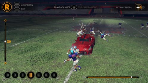 Rozgrywka to najważniejszy element w większości gier. Tu niestety pojawiają się pierwsze zgrzyty. Dla nowych graczy nie zaznajomionych z pływającym modelem jazdy i księżycową fizyką znaną z serii prowadzenie pojazdów możne okazać się trudnym orzechem do zgryzienia. Jest niedzisiejsze. Sam musiałem poświęcić kilka minut, żeby się przyzwyczaić do prowadzenia samochodów, a ostatnią styczność z Carmageddonem miałem stosunkowo niedawno, przy okazji zaliczania wersji na Androida. Wyścigi nadal są wypełnione rozjeżdżaniem ludzi rozpadających się na kawałki przy akompaniamencie tryskającej wszędzie krwi. Radosna destrukcja pochłania wszystko, a wzmagają ją różnego rodzaju dopalacze. Tak jak kiedyś mamy kilka rodzajów beczek, swoistych bonusów o bardzo różnym działaniu. Jedne wpływają na przechodniów, inne na samochód a jeszcze inne na fizykę. Mamy tu zmiany grawitacji, nasz samochód może się zrobić niezniszczalny, mieć miny, wielkie sprężyny wyrzucające oponentów, promienie zamrażające i wiele innych. Są też zabawne bonusy dotyczące pieszych – mogą oni nagle oślepnąć, celowo wbiegać pod nasz samochód, czy wpaść w szał tańca,. Ba, nawet krowy mają własny krok taneczny. Właśnie masa małych elementów, detali, które zauważa się po godzinach grania budują tu tak świetny klimat. Niestety są to bardzo często elementy tylko pod fanów serii, świeżym graczom nie sprawi to dużej satysfakcji.