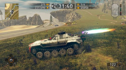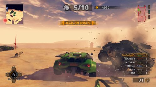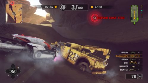 Jednym z najważniejszych elementów w grze są pojazdy. Wraca tu stara zgraja świrów w swoich wymyślnych stalowych potworach. Znajdziemy tu wszystko: od najeżonych kolcami samochodów sportowych przez karawan, samochód do drag racingu aż do tira, czy potężnego spychacza, a to i tak wierzchołek góry lodowej. Pojazdów mamy 31 i każdy z nich określony jest 4 statystykami. Są to prędkość maksymalna, waga, przyśpieszenie i siła uderzenia. Możemy je także ulepszać, z postępem w story odblokowujemy części. Musimy zbierać tokeny porozrzucane na planszach, żeby móc je zainstalować. Każdy samochód rozwijamy osobno, więc powodów do eksploracji nie brakuje. Ulepszenia rozkładają się tak jak kiedyś, na trzy kategorie: pancerz, moc silnika i siłę uderzenia. Zostając przy pojazdach możemy płynnie przejść do modelu zniszczeń. Tu jest naprawdę co pochwalić, jest to jeden z najlepszych modeli jaki można spotkać na rynku. Niszczyć i urywać możemy z samochodów elementy karoserii, wszelkie dodatki a la noże, kolce, czy piły, a także, co najważniejsze, koła. Co ciekawsze, możemy przeciąć nasze, jak i inne pojazdy horyzontalnie i wertykalnie na pół. Co lepsze, taką połówką możemy coś nadal ugrać. Dodatkowo możemy się naprawiać w każdym momencie za kredyty jak i cofać na ostatni bezpieczny grunt, niezależnie od tego jaką harmonijką się staliśmy. Przydaje się to nie tylko jak spadamy w przepaść, ale też gdy widzimy, że przeciwnik pcha nas na ścianę, co skończy się naszym zgonem.