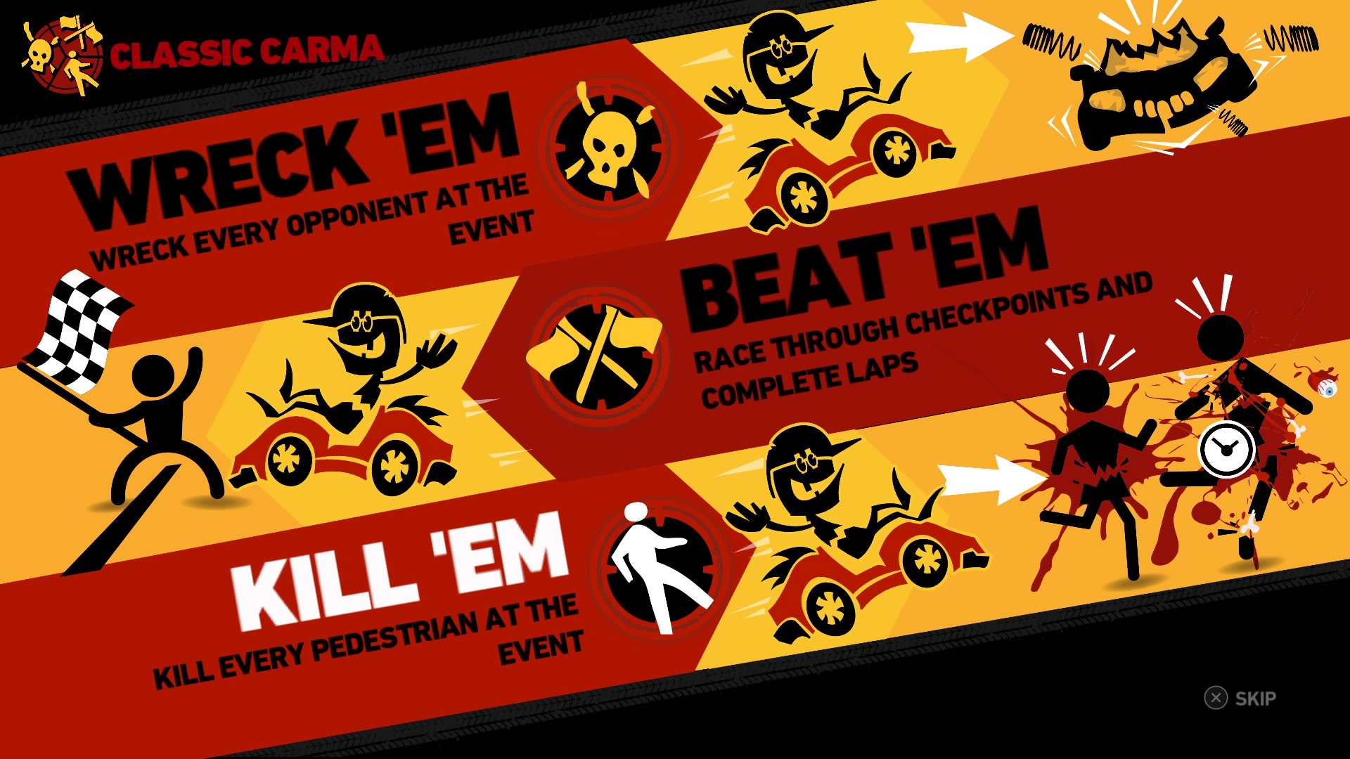 Głównym trybem gry jest story. Podzielono je na 16 rozdziałów a każdy z nich (poza ostatnim) zawiera od 3 do 5 wyścigów, łącznie 63 wydarzenia. Do dyspozycji mamy wyścigi z trzema wariantami wygranych, pojedynki na arenach (gdzie trzeba rozwalić określoną ilość przeciwników), pogoń za checkpointami pojawiającymi się losowo na mapie (na zasadzie „kto pierwszy”, ten zdobywa punkt). Na tej samej zasadzie polega wariant z przechodniami. Po przejechaniu oznaczonego na mapie wybierany jest konkretny kolejny, do którego pędzą wszyscy zebrani. W tych trybach – jeśli zniszczymy pojazd przeciwnika – traci on punkt z puli zaliczonych, a my zyskujemy. Jest też Fox ‚n’ hounds który jest swoistym berkiem, zaczynamy z limitem kilku minut. Jeśli jesteśmy „lisem”, czas się zmniejsza, a ten, kto nas dotknie przejmuje odliczanie. Są też wariacje – zniszcz jak najwięcej samochodów w 5 minut, czy zalicz jako pierwszy określoną liczbę okrążeń itp.