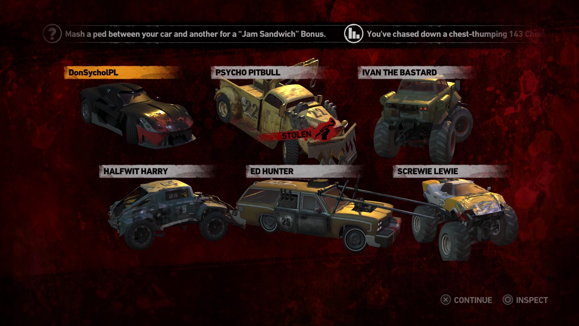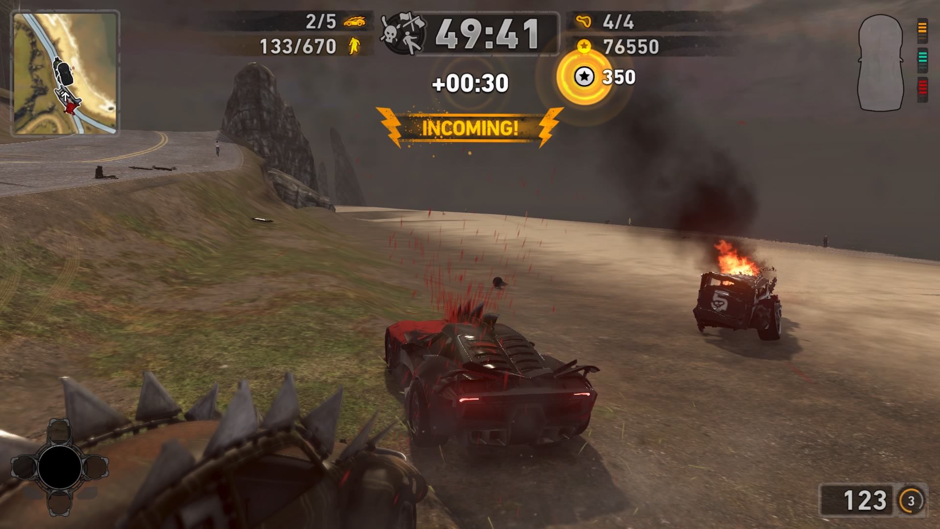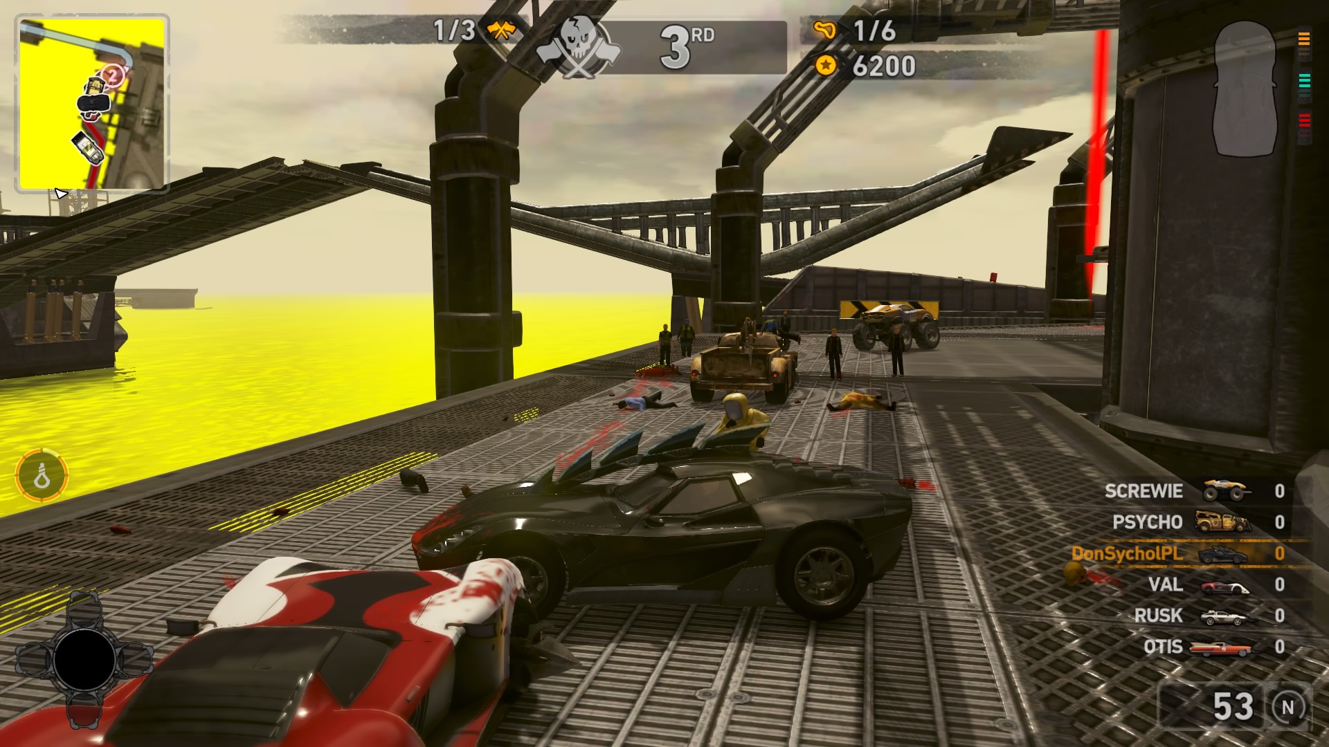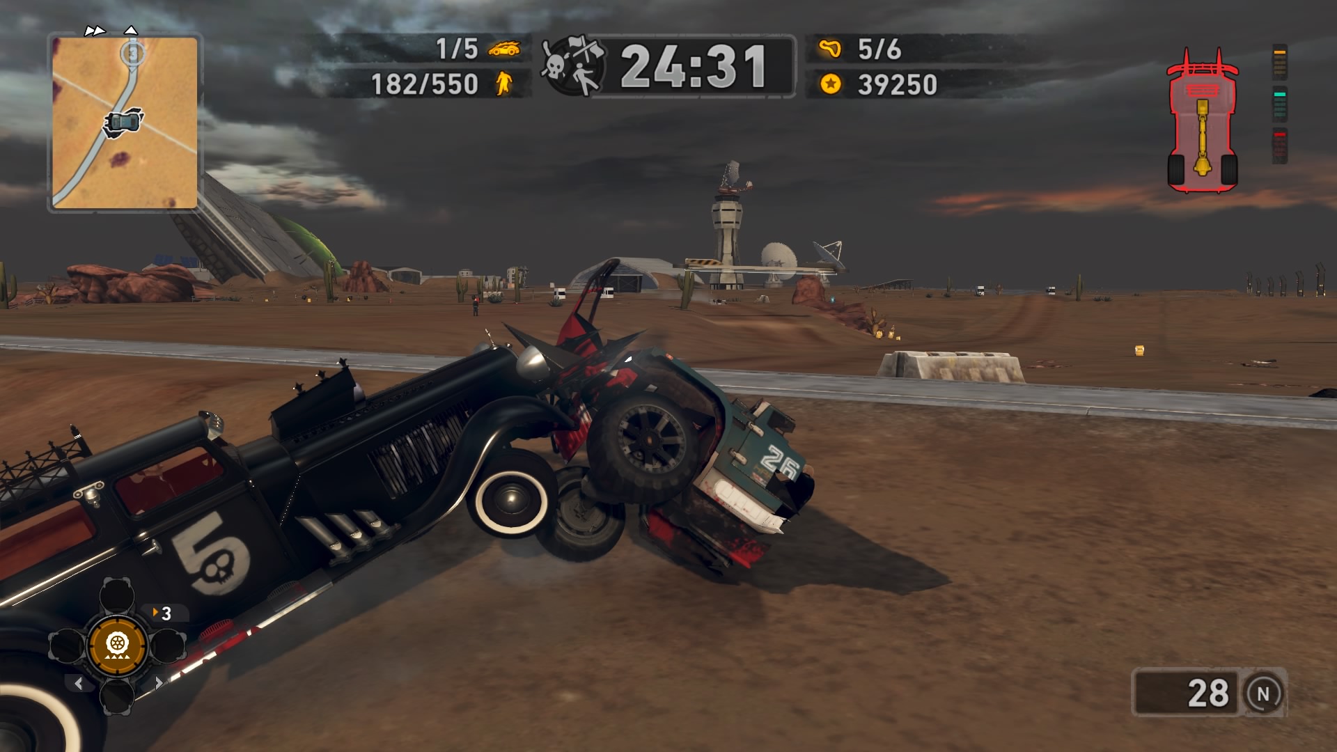 Jednym z najważniejszych elementów w grze są pojazdy. Wraca tu stara zgraja świrów w swoich wymyślnych stalowych potworach. Znajdziemy tu wszystko: od najeżonych kolcami samochodów sportowych przez karawan, samochód do drag racingu aż do tira, czy potężnego spychacza, a to i tak wierzchołek góry lodowej. Pojazdów mamy 31 i każdy z nich określony jest 4 statystykami. Są to prędkość maksymalna, waga, przyśpieszenie i siła uderzenia. Możemy je także ulepszać, z postępem w story odblokowujemy części. Musimy zbierać tokeny porozrzucane na planszach, żeby móc je zainstalować. Każdy samochód rozwijamy osobno, więc powodów do eksploracji nie brakuje. Ulepszenia rozkładają się tak jak kiedyś, na trzy kategorie: pancerz, moc silnika i siłę uderzenia. Zostając przy pojazdach możemy płynnie przejść do modelu zniszczeń. Tu jest naprawdę co pochwalić, jest to jeden z najlepszych modeli jaki można spotkać na rynku. Niszczyć i urywać możemy z samochodów elementy karoserii, wszelkie dodatki a la noże, kolce, czy piły, a także, co najważniejsze, koła. Co ciekawsze, możemy przeciąć nasze, jak i inne pojazdy horyzontalnie i wertykalnie na pół. Co lepsze, taką połówką możemy coś nadal ugrać. Dodatkowo możemy się naprawiać w każdym momencie za kredyty jak i cofać na ostatni bezpieczny grunt, niezależnie od tego jaką harmonijką się staliśmy. Przydaje się to nie tylko jak spadamy w przepaść, ale też gdy widzimy, że przeciwnik pcha nas na ścianę, co skończy się naszym zgonem.
