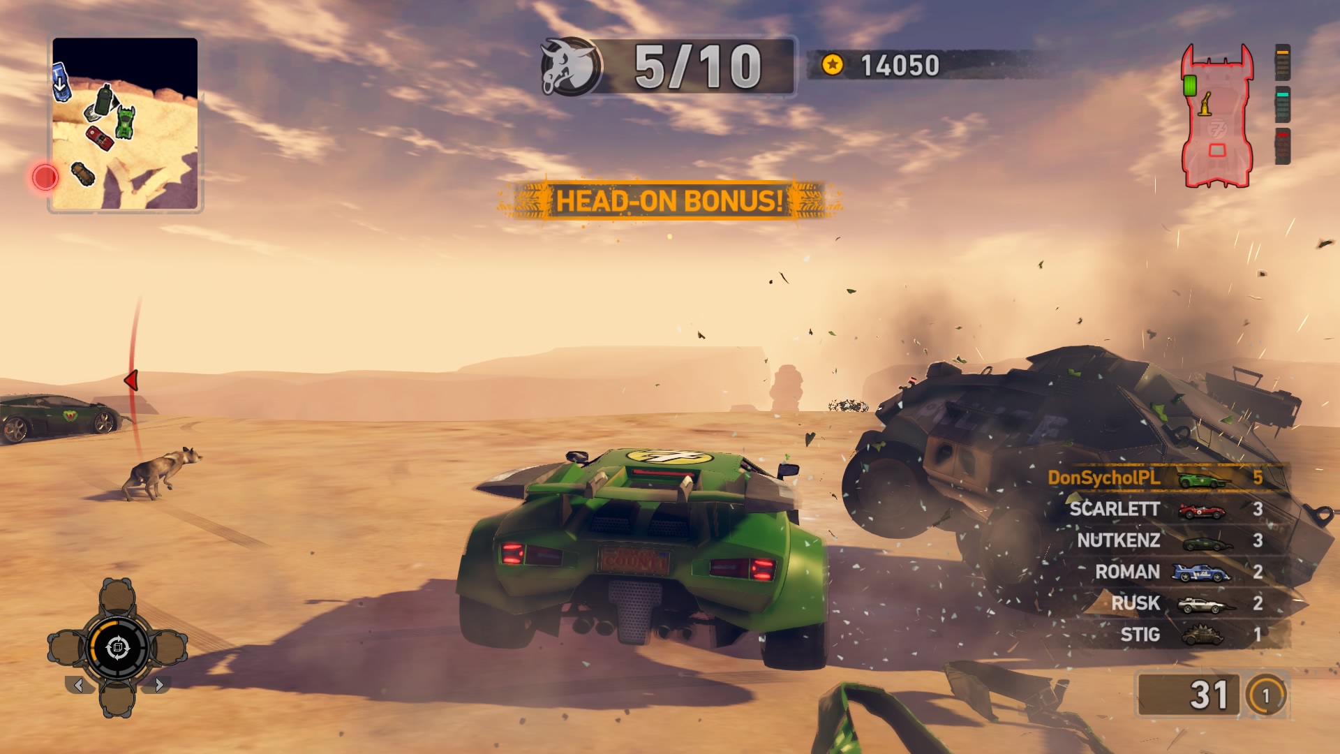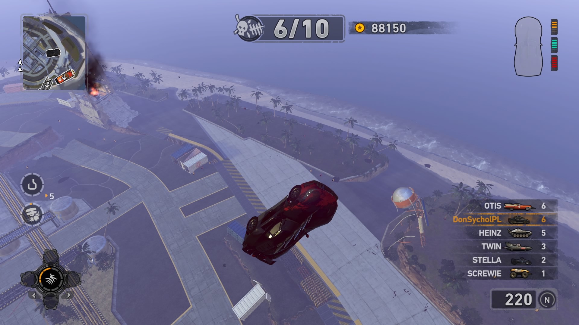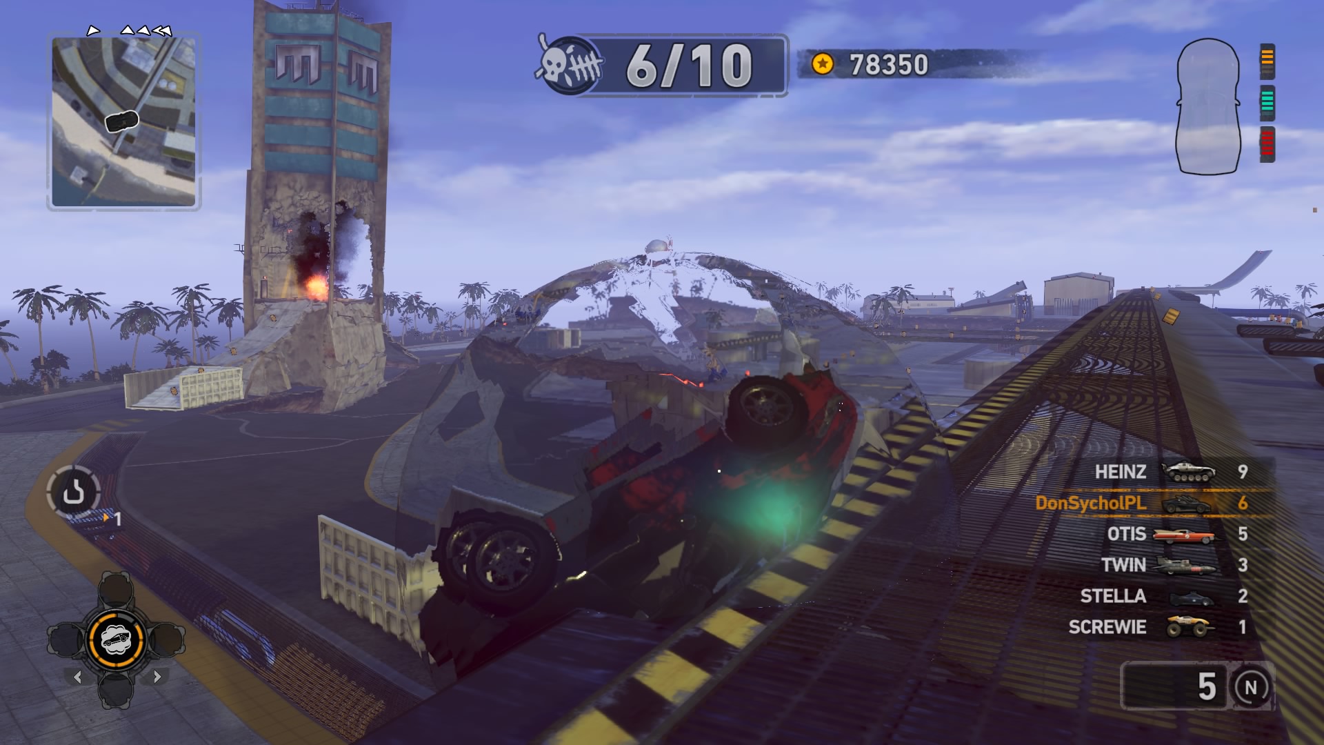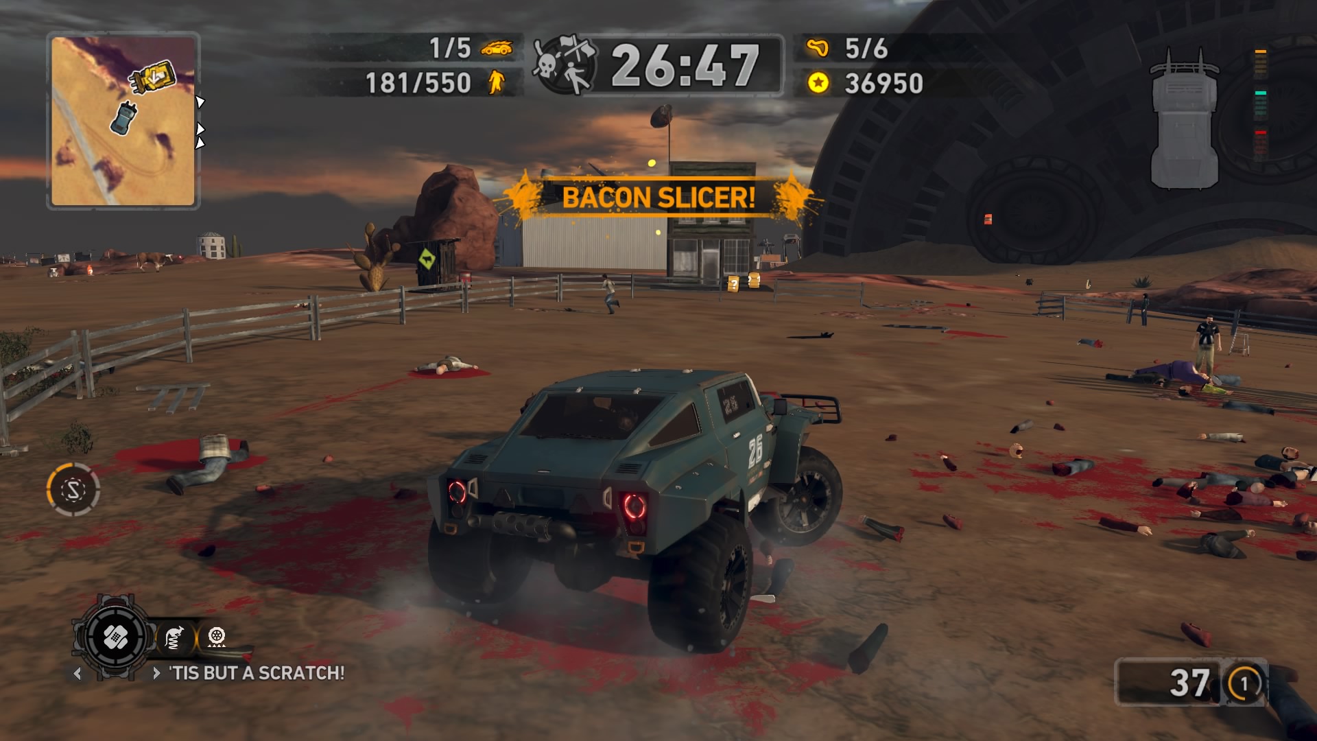 Jednym z najważniejszych elementów w grze są pojazdy. Wraca tu stara zgraja świrów w swoich wymyślnych stalowych potworach. Znajdziemy tu wszystko: od najeżonych kolcami samochodów sportowych przez karawan, samochód do drag racingu aż do tira, czy potężnego spychacza, a to i tak wierzchołek góry lodowej. Pojazdów mamy 31 i każdy z nich określony jest 4 statystykami. Są to prędkość maksymalna, waga, przyśpieszenie i siła uderzenia. Możemy je także ulepszać, z postępem w story odblokowujemy części. Musimy zbierać tokeny porozrzucane na planszach, żeby móc je zainstalować. Każdy samochód rozwijamy osobno, więc powodów do eksploracji nie brakuje. Ulepszenia rozkładają się tak jak kiedyś, na trzy kategorie: pancerz, moc silnika i siłę uderzenia. Zostając przy pojazdach możemy płynnie przejść do modelu zniszczeń. Tu jest naprawdę co pochwalić, jest to jeden z najlepszych modeli jaki można spotkać na rynku. Niszczyć i urywać możemy z samochodów elementy karoserii, wszelkie dodatki a la noże, kolce, czy piły, a także, co najważniejsze, koła. Co ciekawsze, możemy przeciąć nasze, jak i inne pojazdy horyzontalnie i wertykalnie na pół. Co lepsze, taką połówką możemy coś nadal ugrać. Dodatkowo możemy się naprawiać w każdym momencie za kredyty jak i cofać na ostatni bezpieczny grunt, niezależnie od tego jaką harmonijką się staliśmy. Przydaje się to nie tylko jak spadamy w przepaść, ale też gdy widzimy, że przeciwnik pcha nas na ścianę, co skończy się naszym zgonem.
