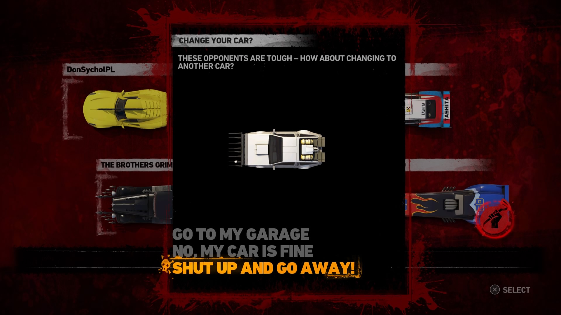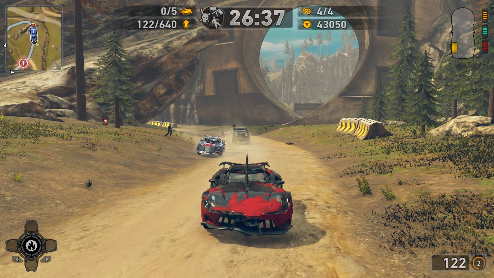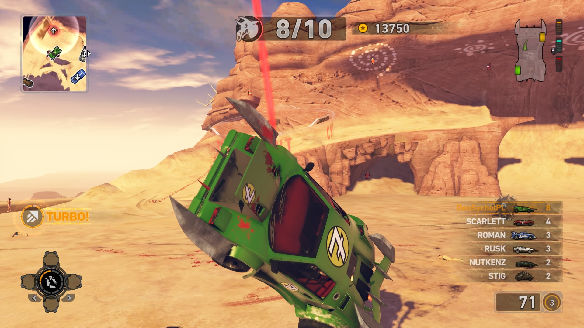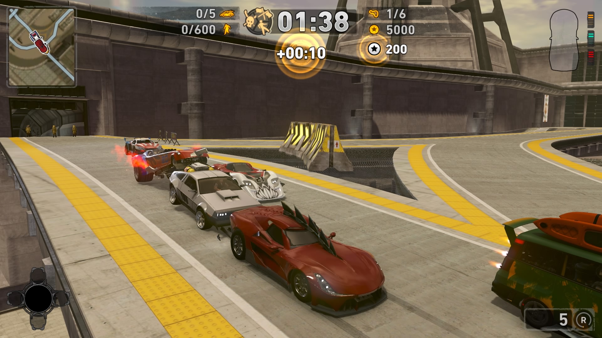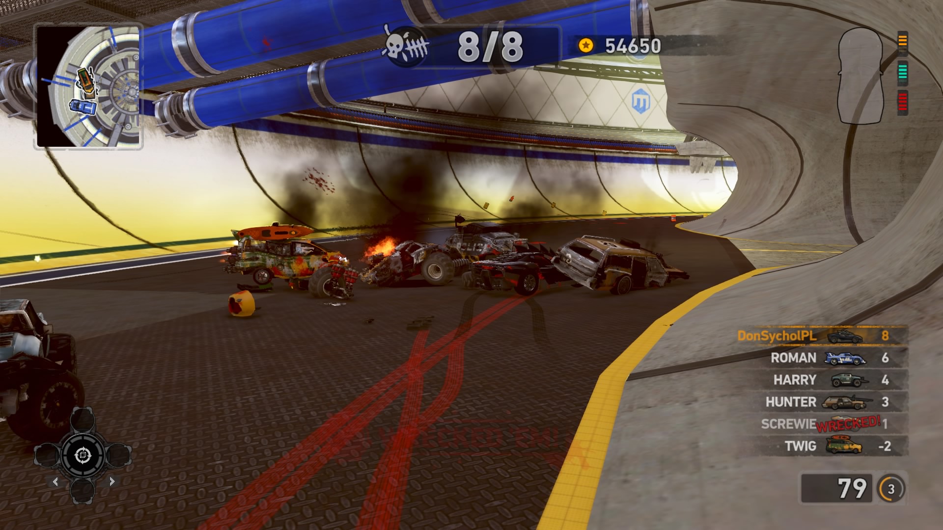 Jednym z najważniejszych elementów w grze są pojazdy. Wraca tu stara zgraja świrów w swoich wymyślnych stalowych potworach. Znajdziemy tu wszystko: od najeżonych kolcami samochodów sportowych przez karawan, samochód do drag racingu aż do tira, czy potężnego spychacza, a to i tak wierzchołek góry lodowej. Pojazdów mamy 31 i każdy z nich określony jest 4 statystykami. Są to prędkość maksymalna, waga, przyśpieszenie i siła uderzenia. Możemy je także ulepszać, z postępem w story odblokowujemy części. Musimy zbierać tokeny porozrzucane na planszach, żeby móc je zainstalować. Każdy samochód rozwijamy osobno, więc powodów do eksploracji nie brakuje. Ulepszenia rozkładają się tak jak kiedyś, na trzy kategorie: pancerz, moc silnika i siłę uderzenia. Zostając przy pojazdach możemy płynnie przejść do modelu zniszczeń. Tu jest naprawdę co pochwalić, jest to jeden z najlepszych modeli jaki można spotkać na rynku. Niszczyć i urywać możemy z samochodów elementy karoserii, wszelkie dodatki a la noże, kolce, czy piły, a także, co najważniejsze, koła. Co ciekawsze, możemy przeciąć nasze, jak i inne pojazdy horyzontalnie i wertykalnie na pół. Co lepsze, taką połówką możemy coś nadal ugrać. Dodatkowo możemy się naprawiać w każdym momencie za kredyty jak i cofać na ostatni bezpieczny grunt, niezależnie od tego jaką harmonijką się staliśmy. Przydaje się to nie tylko jak spadamy w przepaść, ale też gdy widzimy, że przeciwnik pcha nas na ścianę, co skończy się naszym zgonem.