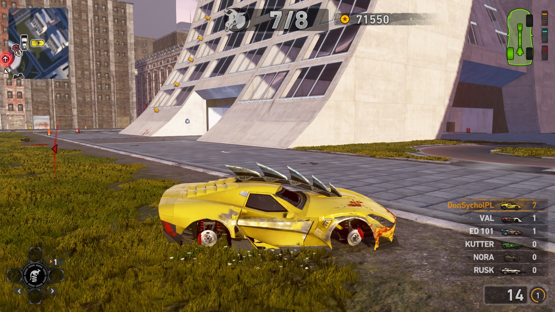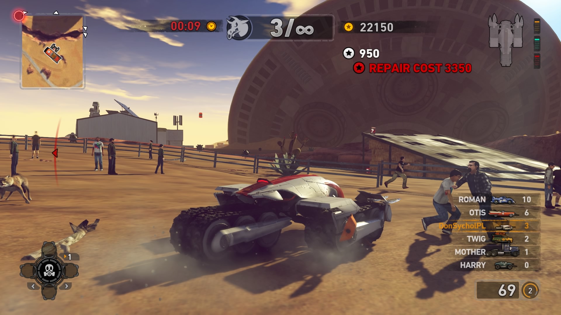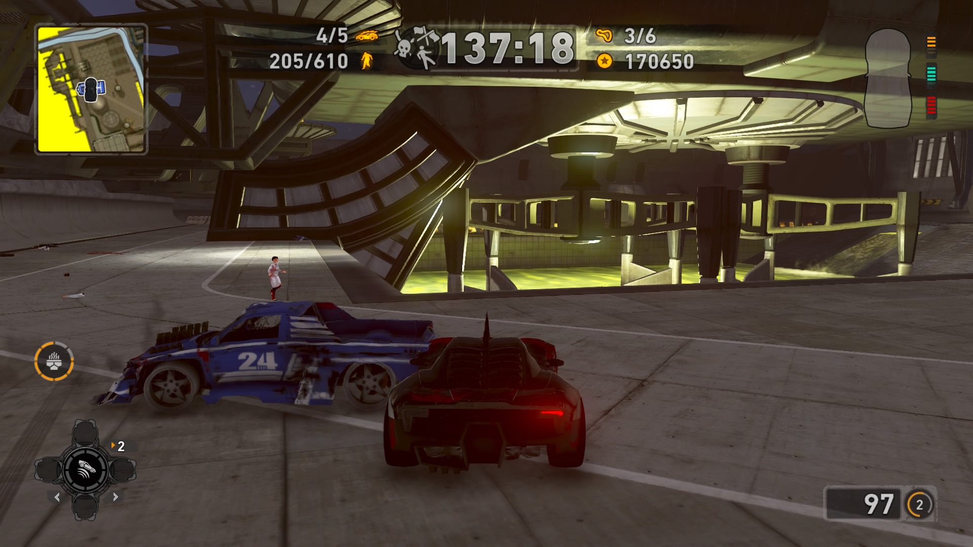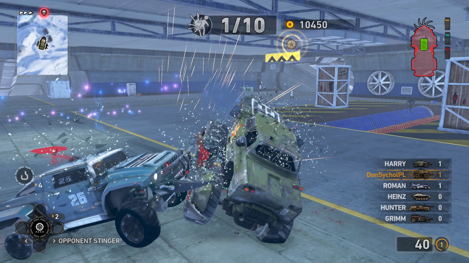 Jednym z najważniejszych elementów w grze są pojazdy. Wraca tu stara zgraja świrów w swoich wymyślnych stalowych potworach. Znajdziemy tu wszystko: od najeżonych kolcami samochodów sportowych przez karawan, samochód do drag racingu aż do tira, czy potężnego spychacza, a to i tak wierzchołek góry lodowej. Pojazdów mamy 31 i każdy z nich określony jest 4 statystykami. Są to prędkość maksymalna, waga, przyśpieszenie i siła uderzenia. Możemy je także ulepszać, z postępem w story odblokowujemy części. Musimy zbierać tokeny porozrzucane na planszach, żeby móc je zainstalować. Każdy samochód rozwijamy osobno, więc powodów do eksploracji nie brakuje. Ulepszenia rozkładają się tak jak kiedyś, na trzy kategorie: pancerz, moc silnika i siłę uderzenia. Zostając przy pojazdach możemy płynnie przejść do modelu zniszczeń. Tu jest naprawdę co pochwalić, jest to jeden z najlepszych modeli jaki można spotkać na rynku. Niszczyć i urywać możemy z samochodów elementy karoserii, wszelkie dodatki a la noże, kolce, czy piły, a także, co najważniejsze, koła. Co ciekawsze, możemy przeciąć nasze, jak i inne pojazdy horyzontalnie i wertykalnie na pół. Co lepsze, taką połówką możemy coś nadal ugrać. Dodatkowo możemy się naprawiać w każdym momencie za kredyty jak i cofać na ostatni bezpieczny grunt, niezależnie od tego jaką harmonijką się staliśmy. Przydaje się to nie tylko jak spadamy w przepaść, ale też gdy widzimy, że przeciwnik pcha nas na ścianę, co skończy się naszym zgonem.