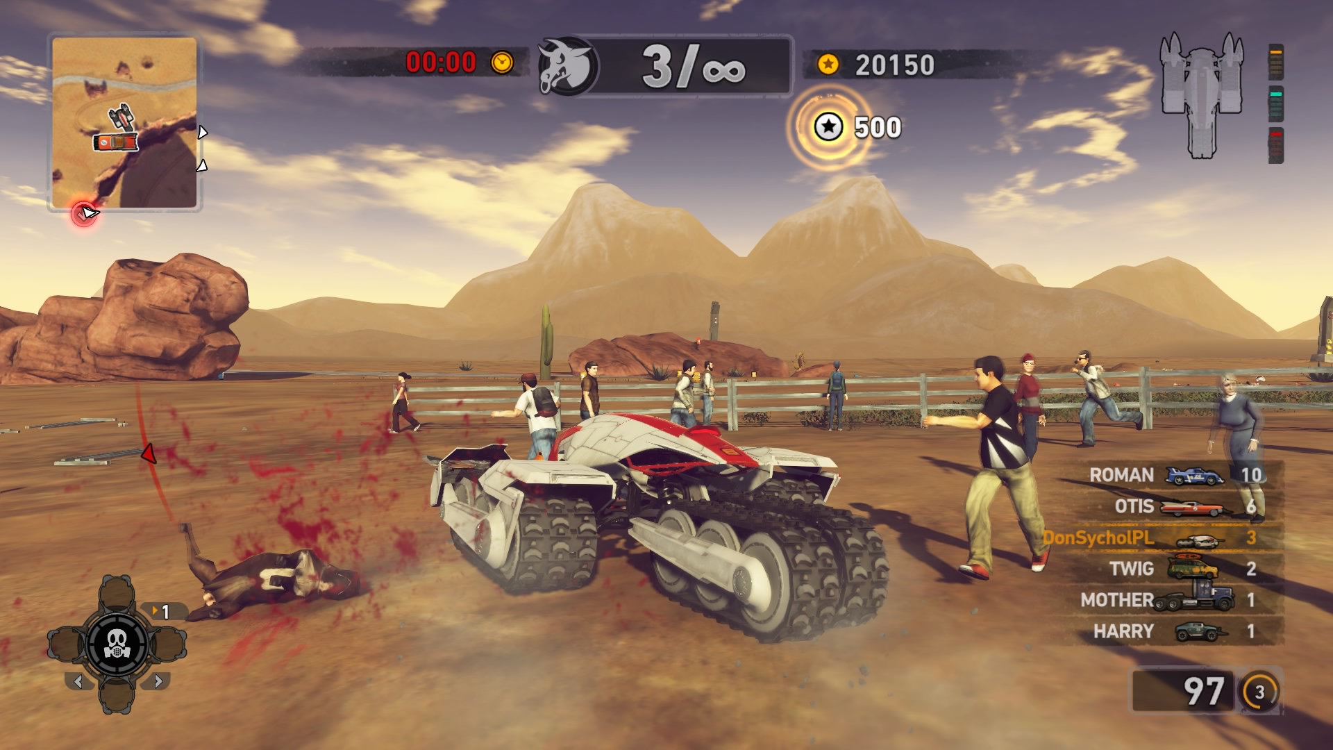 Rozgrywka to najważniejszy element w większości gier. Tu niestety pojawiają się pierwsze zgrzyty. Dla nowych graczy nie zaznajomionych z pływającym modelem jazdy i księżycową fizyką znaną z serii prowadzenie pojazdów możne okazać się trudnym orzechem do zgryzienia. Jest niedzisiejsze. Sam musiałem poświęcić kilka minut, żeby się przyzwyczaić do prowadzenia samochodów, a ostatnią styczność z Carmageddonem miałem stosunkowo niedawno, przy okazji zaliczania wersji na Androida. Wyścigi nadal są wypełnione rozjeżdżaniem ludzi rozpadających się na kawałki przy akompaniamencie tryskającej wszędzie krwi. Radosna destrukcja pochłania wszystko, a wzmagają ją różnego rodzaju dopalacze. Tak jak kiedyś mamy kilka rodzajów beczek, swoistych bonusów o bardzo różnym działaniu. Jedne wpływają na przechodniów, inne na samochód a jeszcze inne na fizykę. Mamy tu zmiany grawitacji, nasz samochód może się zrobić niezniszczalny, mieć miny, wielkie sprężyny wyrzucające oponentów, promienie zamrażające i wiele innych. Są też zabawne bonusy dotyczące pieszych – mogą oni nagle oślepnąć, celowo wbiegać pod nasz samochód, czy wpaść w szał tańca,. Ba, nawet krowy mają własny krok taneczny. Właśnie masa małych elementów, detali, które zauważa się po godzinach grania budują tu tak świetny klimat. Niestety są to bardzo często elementy tylko pod fanów serii, świeżym graczom nie sprawi to dużej satysfakcji.