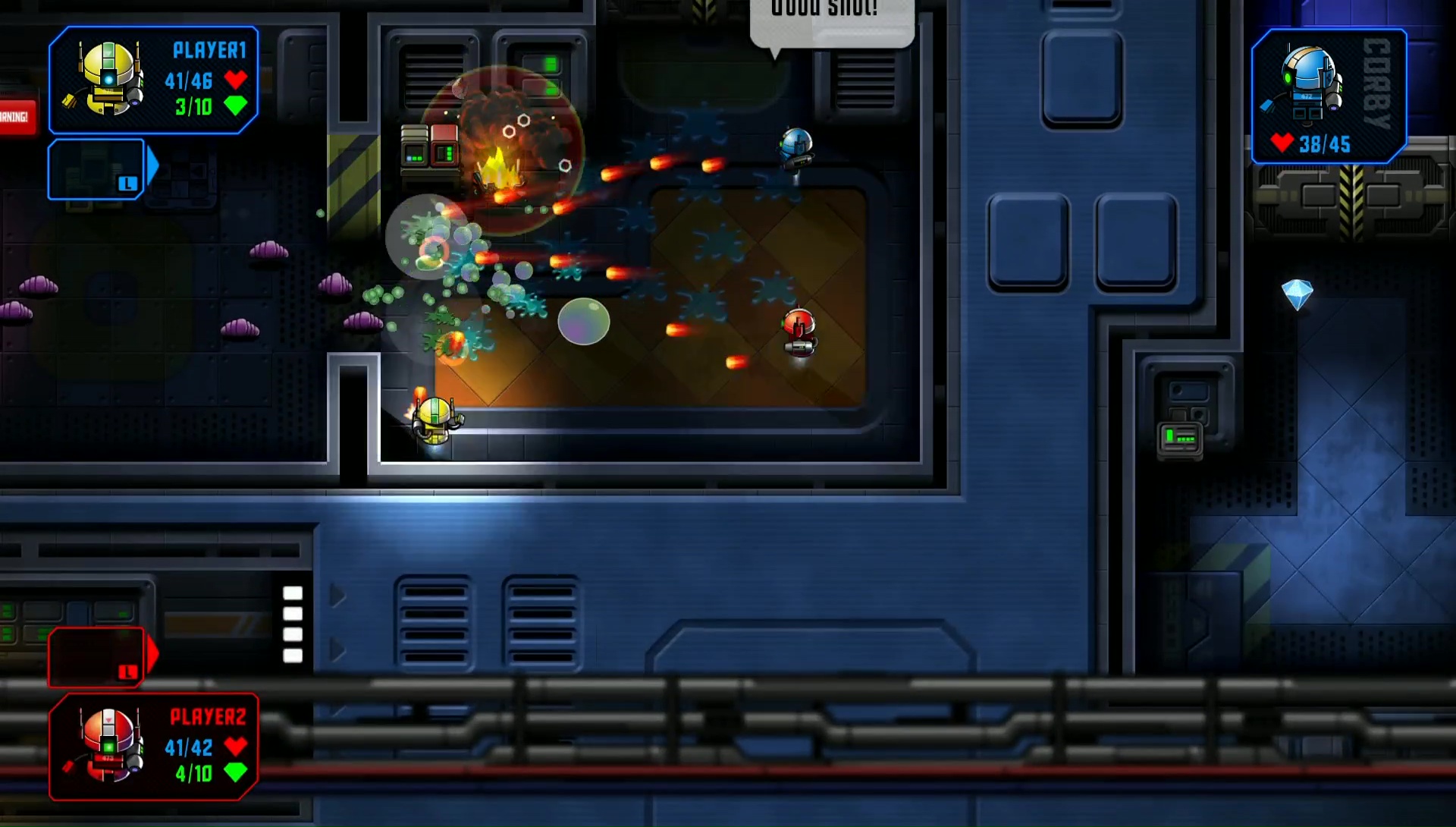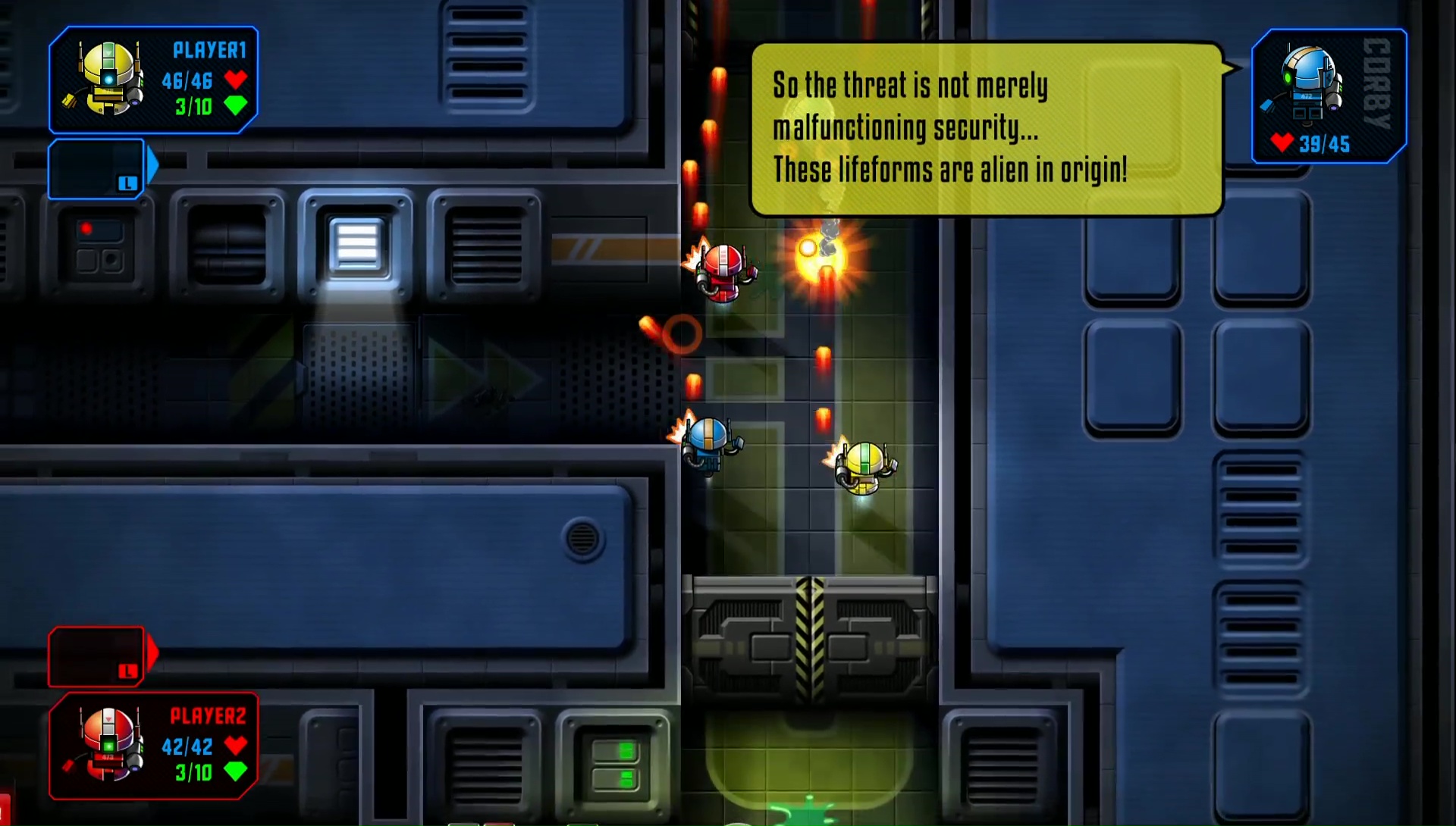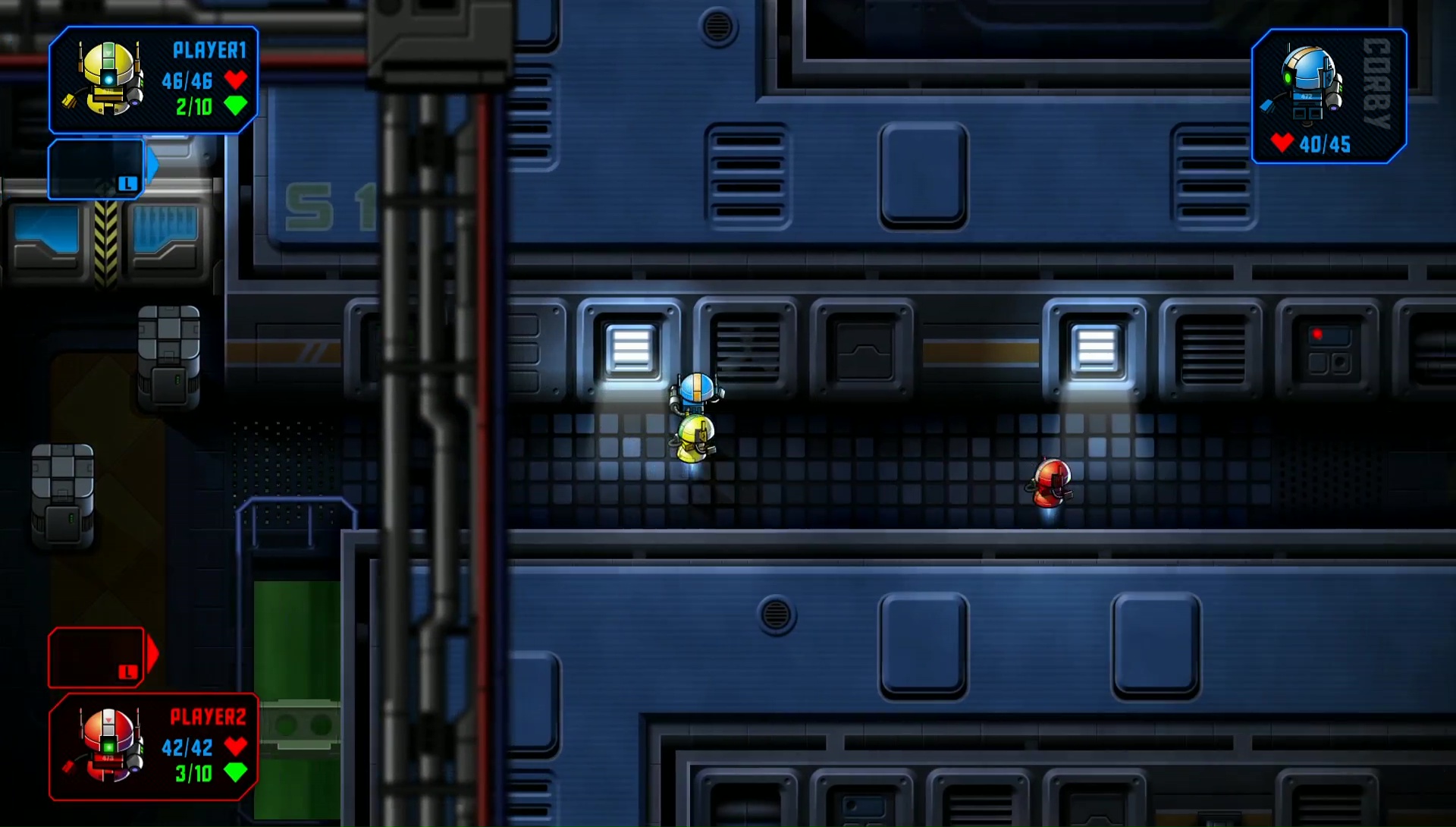 W rozgrywce może uczestniczyć lokalnie od 1 do 4 osób, co nieco ułatwia przechodzenie kampanii. Już na początku otrzymujemy jeszcze jednego pomocnika AI, nazwanego Corby. W przeciwieństwie do prawdziwych graczy nie potrafi on jednak wskrzesić nas po straceniu całego zdrowia.