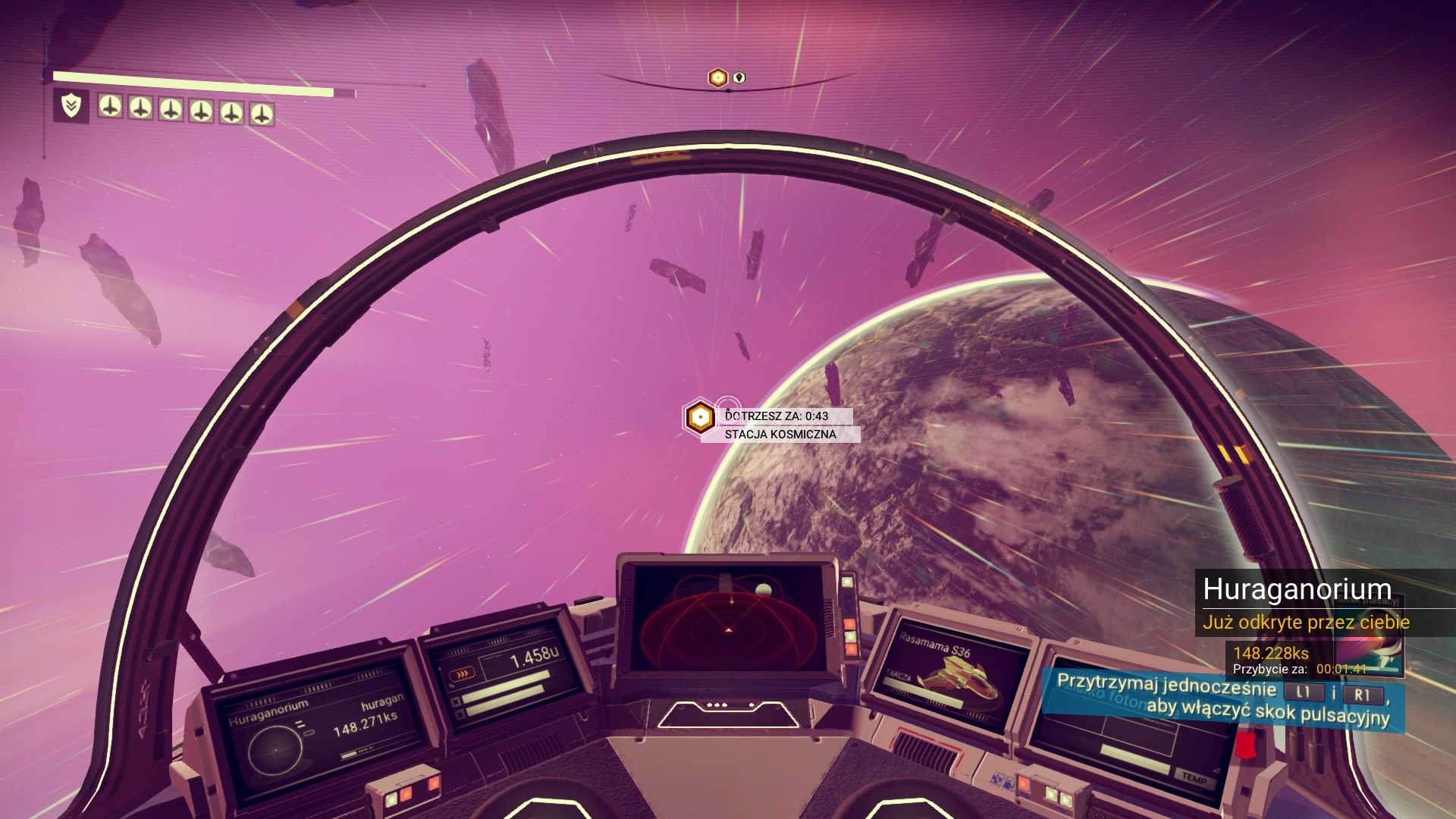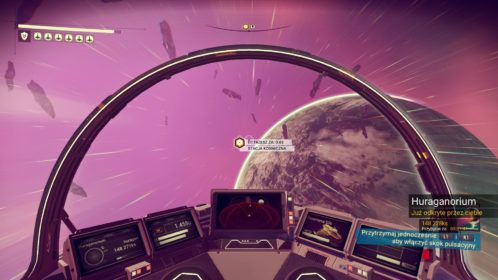 Po kilku godzinach spędzonych na Huraganorium stwierdzam, że nadszedł czas na odkrycie kolejnych planet. Ruszam w kosmos! Lata się tutaj także przyjemnie, jednak mój słaby wzrok daje się we znaki. Asteroidy, których jest mnóstwo w tym układzie pojawiają się dosłownie znikąd! Powiedziałbym nawet, że jest to denerwujące… Całe szczęście mogę do nich strzelać, a tym samym zdobywać cenne minerały. Tylko znów nie mam na nie miejsca… Odwiedzam stację kosmiczną, na której mogę zakupić lub sprzedać minerały i inne przedmioty. Kosmita niestety rozmawia w języku, którego nie rozumiem. Poznałem dopiero kilka słów z monolitów na mojej planecie (tak uczę się innych dialektów). Dlatego ruszam na kolejne dwie planety dostępne w układzie, w którym obecnie przebywam. Nie są już tak atrakcyjne jak Huraganorium, więc nie zwiedzam ich dokładnie. Zdobywam za to wszystkie materiały potrzebne do skoku w hiperprzestrzeń!