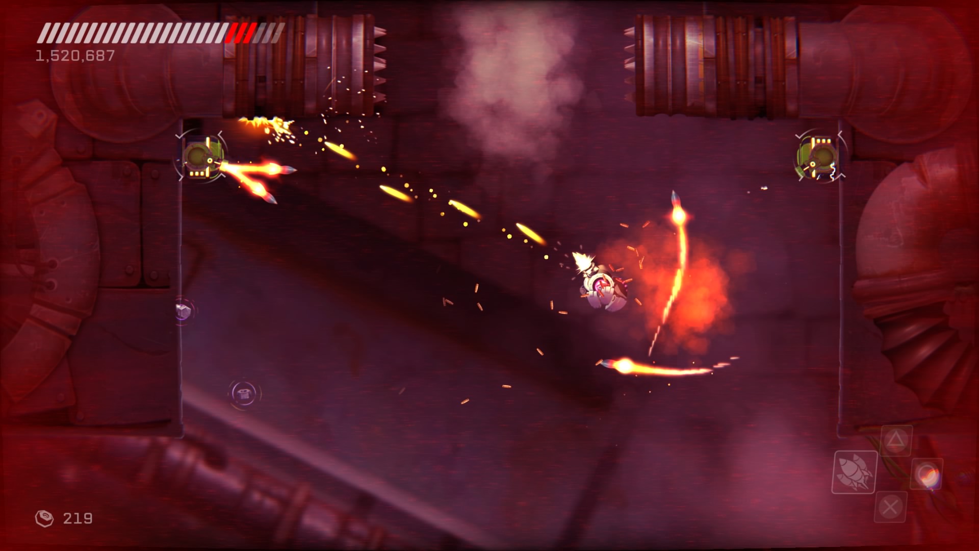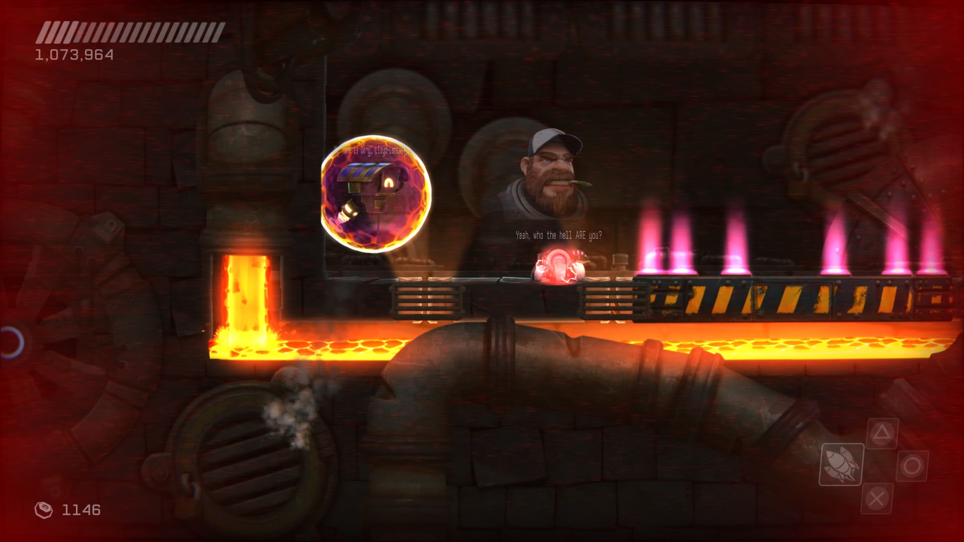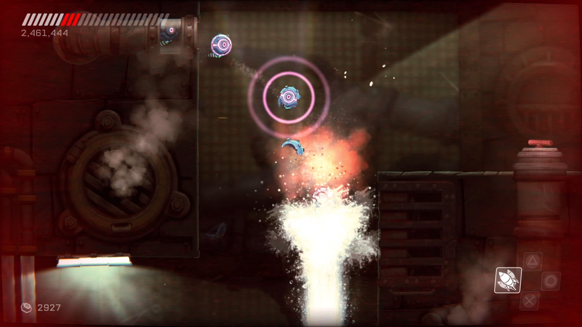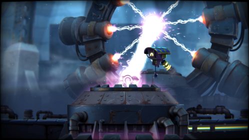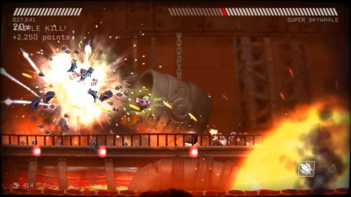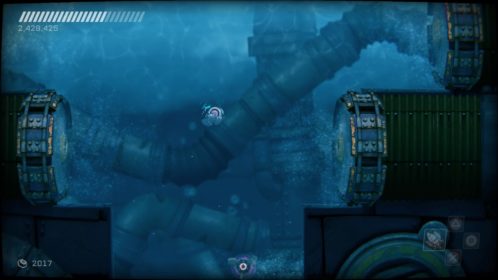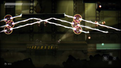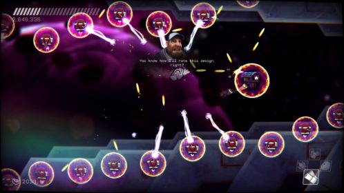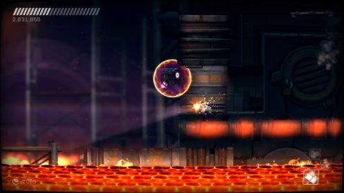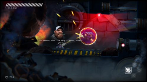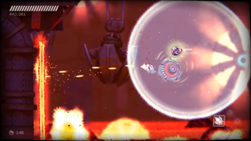Przejdźmy do przeciwników. Na naszej drodze spotkamy ich całą masę, w różnych skupiskach, a każdy ich rodzaj inaczej się zachowuje i niesie z sobą inne zagrożenie. Każdy z nich wymaga na nas inne zachowania i zmusza do obrania innej taktyki. Kontakt z nieprzyjacielem objawia się odrzuceniem naszego statku i utratą energii, a ta kurczy się bardzo szybko. Dlatego lepiej unikać kontaktu z przeciwnikami. Rolą niektórych jest właśnie lecenie w naszym kierunku, inne strzelają w nas potrójnymi rakietami, jeszcze inne próbują nas taranować. Na każdy przejaw agresji musimy reagować inaczej i odpowiadać naszą. Często zabójcze jest też otocznie, co możemy wykorzystywać. Wielkie obrotowe piły tarczowe, zgniatające prasy, czy pospolita lawa wymuszają na nas taneczny balet z wykorzystaniem naszego zwinnego robocika. Musi on skakać, odbijać się od ścian, tańczyć wokół pocisków przeciwników, nich samych i wszystkiego, co nas otacza. Wszystko to widać doskonale w walkach z bossami, gdzie nauka bezpiecznych ścieżek i precyzja powtórzeń daje nam pewny sukces. Swoją drogą wielkich przeciwników mogłoby być więcej.
