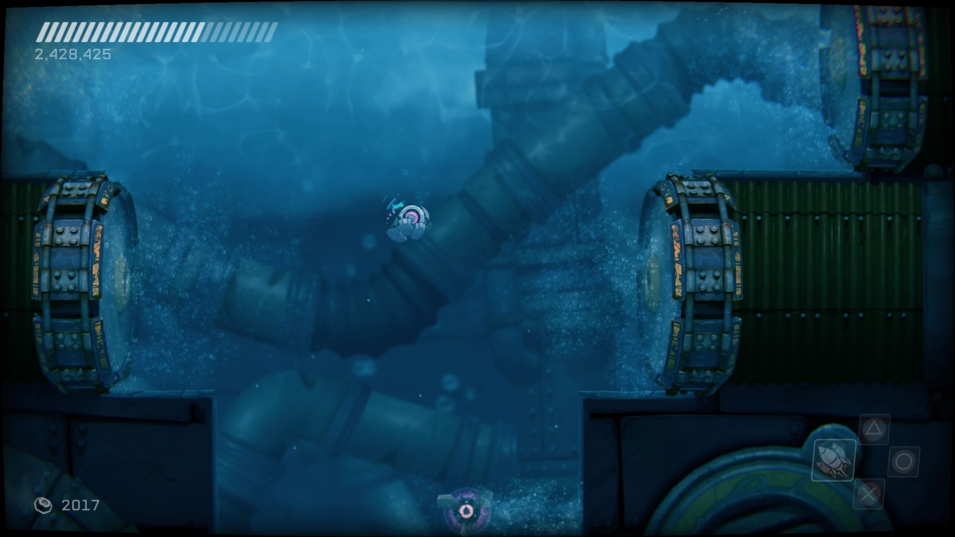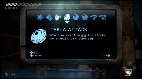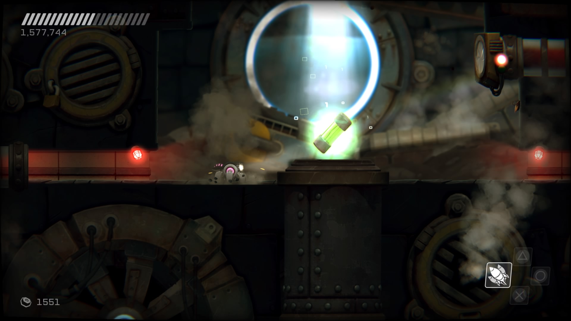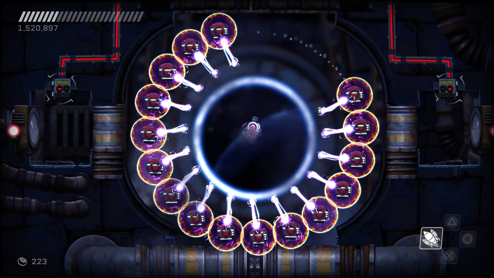 Przejdźmy do przeciwników. Na naszej drodze spotkamy ich całą masę, w różnych skupiskach, a każdy ich rodzaj inaczej się zachowuje i niesie z sobą inne zagrożenie. Każdy z nich wymaga na nas inne zachowania i zmusza do obrania innej taktyki. Kontakt z nieprzyjacielem objawia się odrzuceniem naszego statku i utratą energii, a ta kurczy się bardzo szybko. Dlatego lepiej unikać kontaktu z przeciwnikami. Rolą niektórych jest właśnie lecenie w naszym kierunku, inne strzelają w nas potrójnymi rakietami, jeszcze inne próbują nas taranować. Na każdy przejaw agresji musimy reagować inaczej i odpowiadać naszą. Często zabójcze jest też otocznie, co możemy wykorzystywać. Wielkie obrotowe piły tarczowe, zgniatające prasy, czy pospolita lawa wymuszają na nas taneczny balet z wykorzystaniem naszego zwinnego robocika. Musi on skakać, odbijać się od ścian, tańczyć wokół pocisków przeciwników, nich samych i wszystkiego, co nas otacza. Wszystko to widać doskonale w walkach z bossami, gdzie nauka bezpiecznych ścieżek i precyzja powtórzeń daje nam pewny sukces. Swoją drogą wielkich przeciwników mogłoby być więcej.