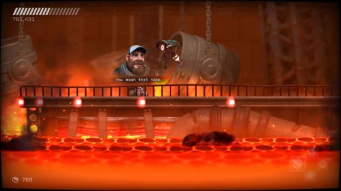 Projekt poziomów został solidnie dopieszczony. Twórcy doskonale zaprojektowali masę pomieszczeń, gdzie będziemy wielokrotnie ginąć. Musicie tu wiedzieć, że licznik śmierci w tej grze szybko zamienia się z dziesiątek na setki. Wszystko, żeby wyrobić w nas reakcje na wrogów i wyćwiczyć naszą małpią zręczność. Gra zapisuje nasz postęp w takich miejscach, że często po zgonie rodzimy się w samym środku akcji i musimy sobie radzić z tym, co zastajemy. Często nasze kolejne próby trwają po kilka sekund, aż do momentu, kiedy ponownie nie złapiemy odpowiedniego rytmu. W takich momentach potrafi pojawić się frustracja, wręcz złość, ale nie mija ogromna ochota spróbowania jeszcze raz. Jest to tak silne, że później podobne fragmenty przechodzimy z gracją i opanowaniem, a każdy sukces daje dużą satysfakcję. To tu są największe pokłady miodu, możemy poczuć wyzwanie, jakie stawiały przed nami stare gry. Nic nas tu nie oszukuje, kara za błędy jest natychmiastowa, a po zgonach gra z nas drwi różnymi tekstami. Jeśli już zupełnie sobie nie radzimy, możemy wyłączyć standardowy – i jedyny dostępny na początku tryb – Hard Mode. Przechodzimy wtedy w Soft Mode, gra staje się łatwiejsza i nasze ataki zadają więcej obrażeń. Dostajemy też karę, która tnie nasz wynik o połowę, niwecząc starania o jak najwyższe combo podczas przechodzenia, niezależnie czy włączyliśmy łatwiejszy tryb na jedno pomieszczenie, czy na cały poziom. Dodatkowo cały czas widzimy w lewym dolnym rogu ikonkę słodkiego misia, który nam przypomina, że nie dajemy rady.