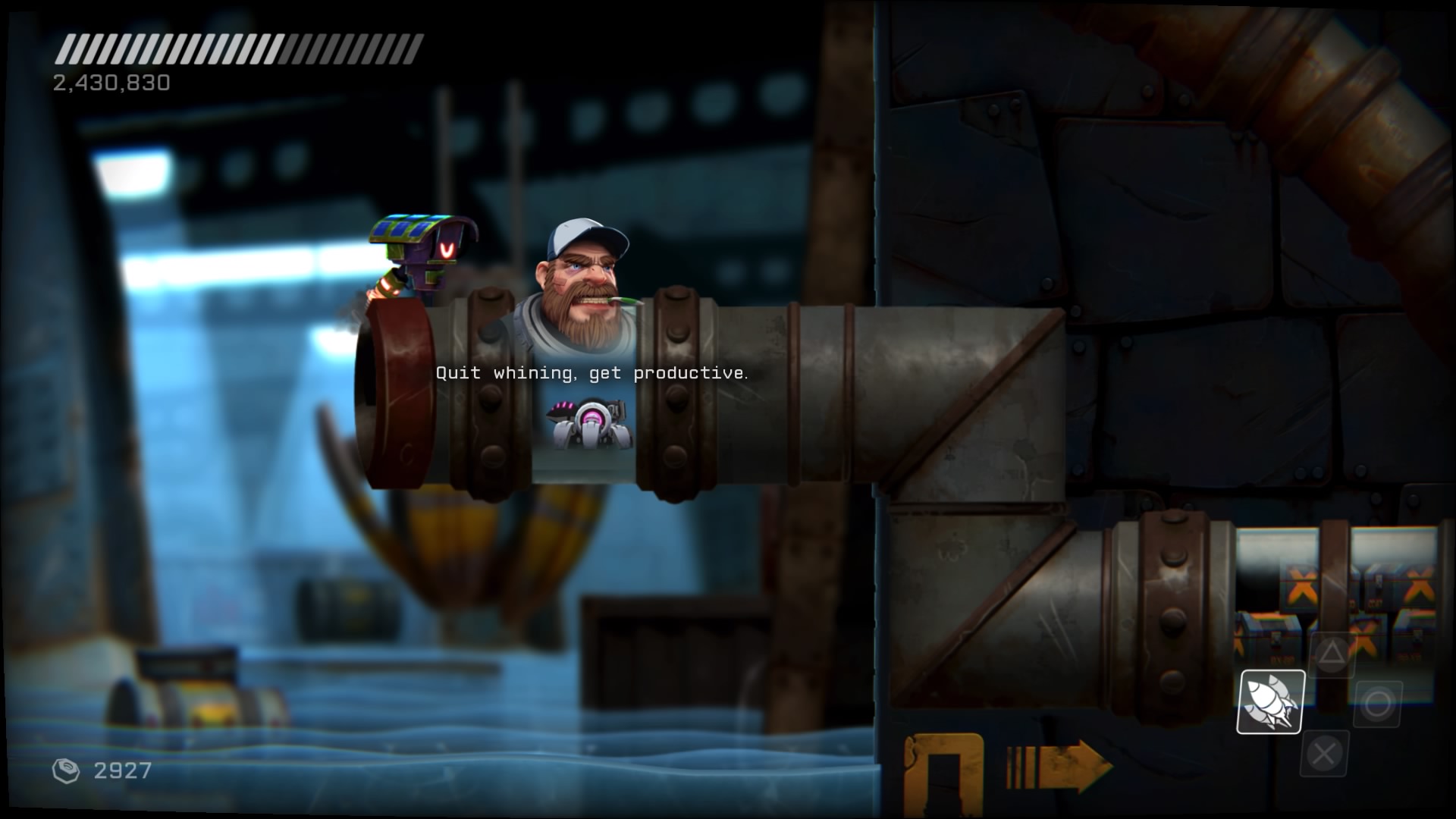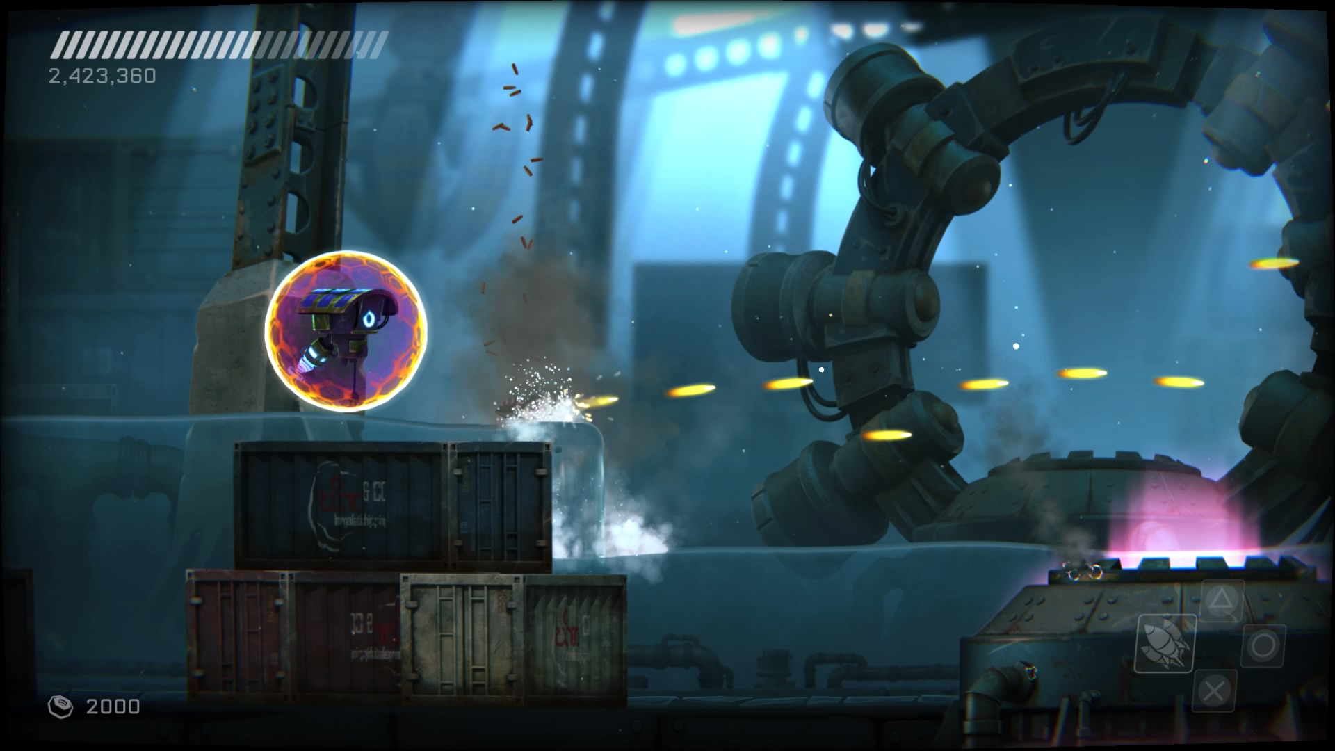 Do oprawy nie mogę się przyczepić w wielu aspektach, jest klimatyczna. Wszystko jest spójne, ładnie zaprojektowane, nasz robot porusza się z gracją i jest ładnie animowany. Zarzucić otoczeniu można monotonnię czujemy się czasami jak w łodzi podwodnej albo niekończącym się magazynie. Trudno wymagać dużego zróżnicowania, ale można było ożywić kilka sekcji, umieszczając je w innej konwencji. Efekty wybuchów i wszelkich rozbłysków są miłe dla oka, a cała kompozycja HUDa i menu do siebie pasuje. Muzyka jest dynamiczna i pasuje do starć, przywodzi na myśl stare czasy. Niespodziankę mamy jeśli chodzi o głosy. Usłyszymy Marka Dodsona, znanego z Gremlinów, czy wcielania się w Ewoki w Gwiezdnych Wojnach. Gra jest mała, zajmuje bowiem zaledwie 1 GB, ale potrafi przyciągnąć do ekranu. Nawet może nie tyle humorem, co solidną rozgrywką. Błędów nie uświadczyłem, poza jednym zablokowaniem się w przejściu (sam się o to starałem) i problemu przy wyborze języka w menu.
