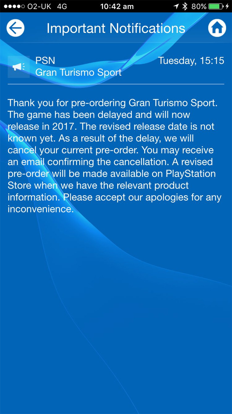 Na portalu Team VVV czytamy, że gracze, którzy wcześniej zamówili już grę za pośrednictwem PlayStation Store otrzymują komunikaty informujące o anulowaniu zakupu ze względu na wystąpienie opóźnień. 30 sierpnia 2016 r. ogłoszono, że premiera Gran Turismo Sport zostaje przesunięta na 2017 rok. Z tego też powodu Sony postanowiło anulować zamówienia przedpremierowe i dokonać zwrotu płatności za pre-order. Poniżej możecie zobaczyć pełną informację, jaką otrzymują gracze.