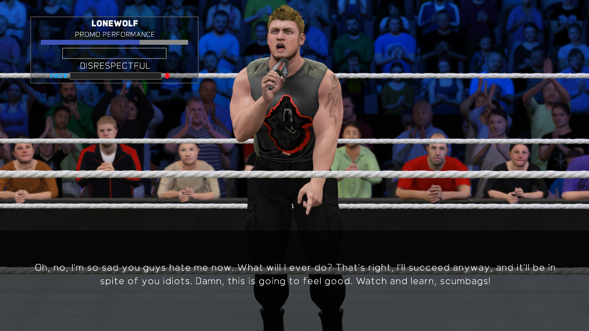 Jak on działa? O ile nie jesteśmy w bezpośrednim konflikcie z którymś z zawodników, na każdej gali możemy przeznaczyć segment dla samego siebie. Co z nim zrobimy zależy tylko i wyłącznie od nas. Możemy spróbować rzucić komuś wyzwanie, lub jak w moim przykładzie kogoś poniżyć. Możemy nawet zrobić face/heel turn. W teorii brzmi to genialnie, do tego stopnia, że słyszę jak weterani w tym momencie otwierają już okienka ze sklepem i szukają najtańszej oferty zakupu gry.