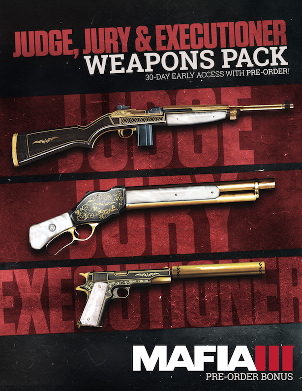 Pierwotnie ekskluzywne dla osób składających zamówienie przedpremierowe na Mafię III DLC Judge, Jury & Executioner Weapons Pack zostało udostępnione wszystkim graczom, za darmo!
