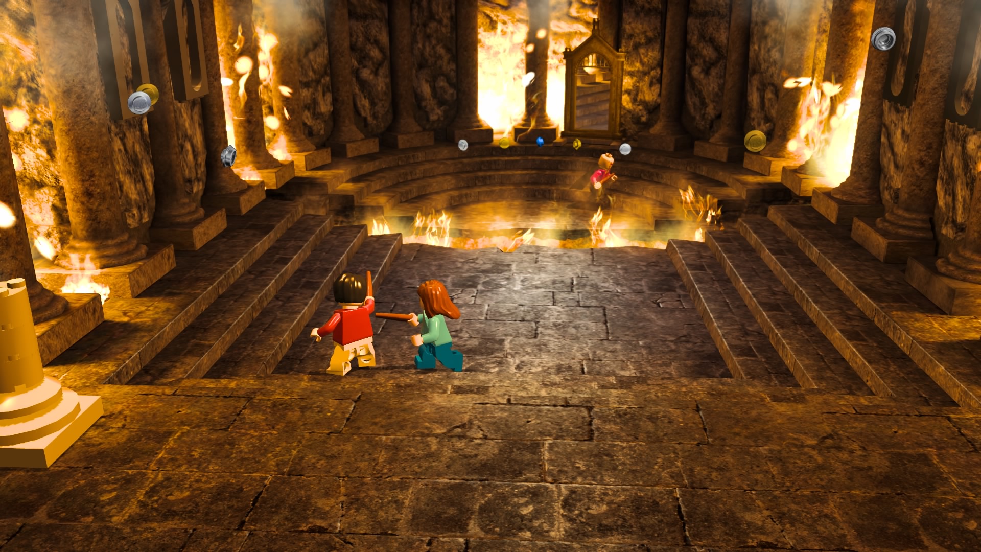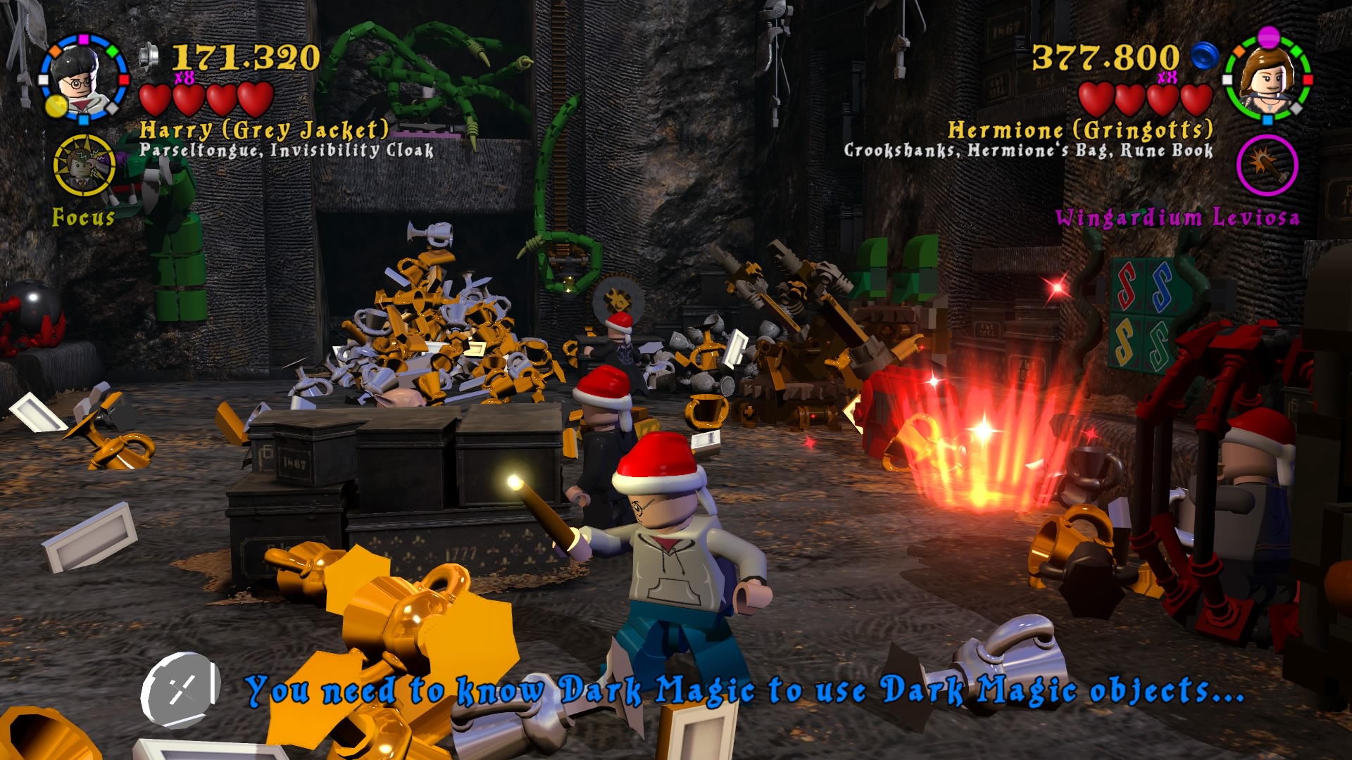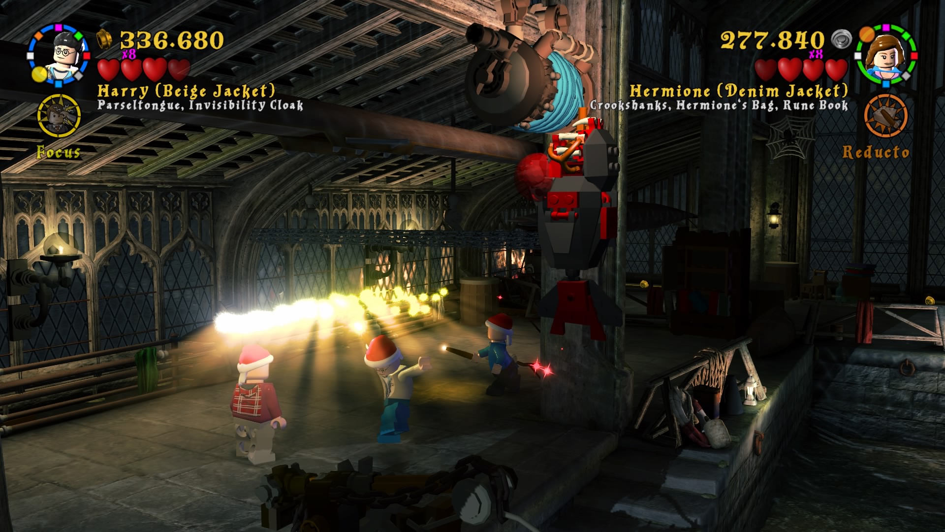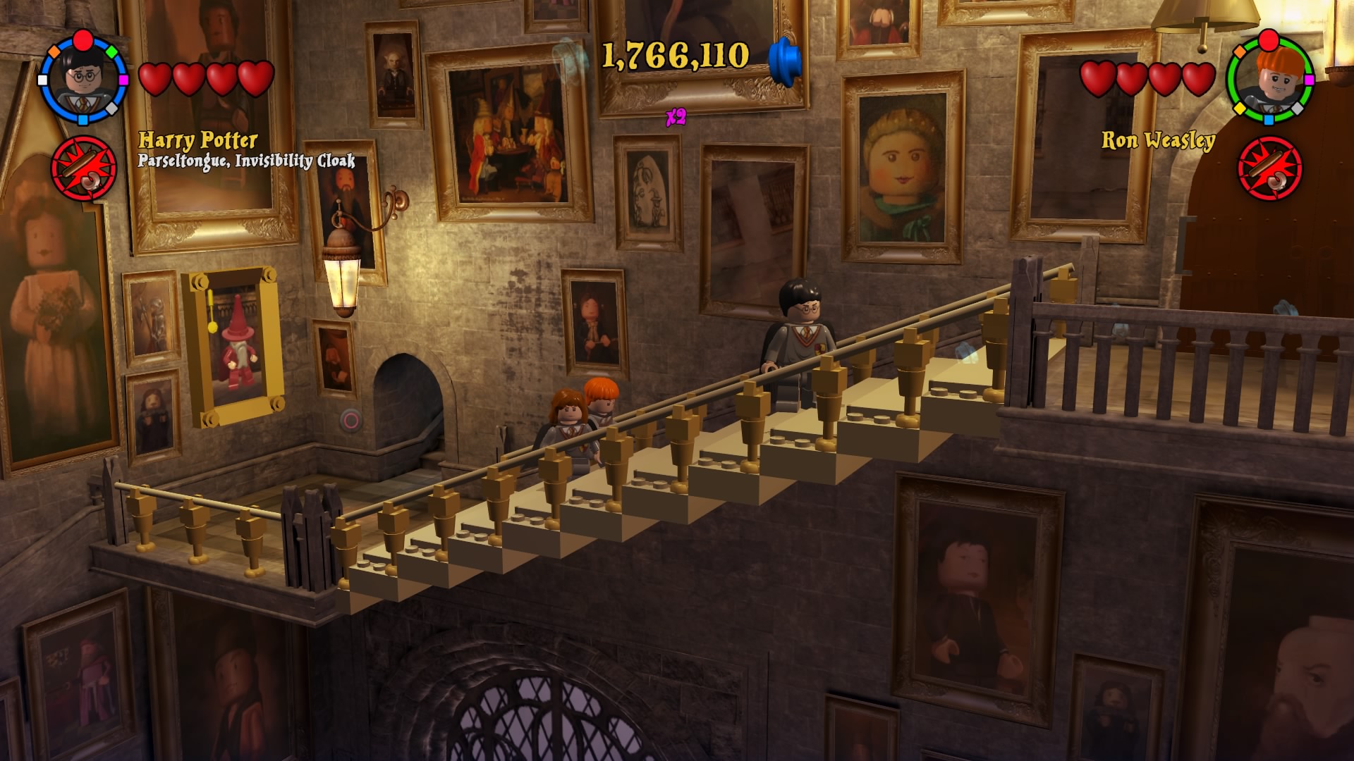 Po uruchomieniu zremasterowanej kolekcji dostajemy menu, w którym możemy wybrać okładki dwóch tytułów składających się na, jeszcze do niedawna kompletną, historię naszego czarodzieja. Zabrałem się za nie chronologicznie. Muszę powiedzieć, że różnica między współczesnymi grami LEGO, a tymi z poprzedniej generacji jest zauważalna od razu. Przez ostatnie pół roku skończyłem z moją wierną towarzyszką co-opa kilka gier z serii – Batmana 3: Poza Gotham, Gwiezdne Wojny: Przebudzenie Mocy i zaczęliśmy Hobbita. Ten ciąg grania w produkcje z klockami przerwała nam właśnie opisywana kolekcja. Różnice w rozgrywce rzucają się w oczy od razu. Dostajemy powrót do starego stylu. W pierwszych częściach występowały nieme postaci i pantomima, natomiast w nowych mamy teksty aktorów z filmów wypowiadane przez klocki. Nie pojawiają się teksty do czytania, ani nic rozwijającego fabułę ponad to, co pokazują emocje na klockach. Jest to fantastyczny powrót do korzeni i dopiero w takim zestawieniu widać, co seria straciła na przestrzeni lat rozwoju. Nie znaczy to oczywiście, że wolałbym powrót do starego stylu. Miał on w sobie jakiś czar, ale najlepszym wyjściem byłby wybór lub zmiksowanie dwóch pomysłów.