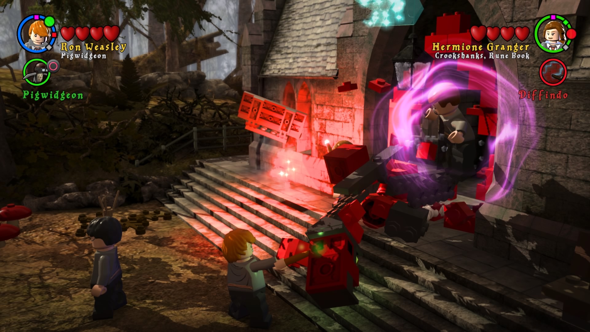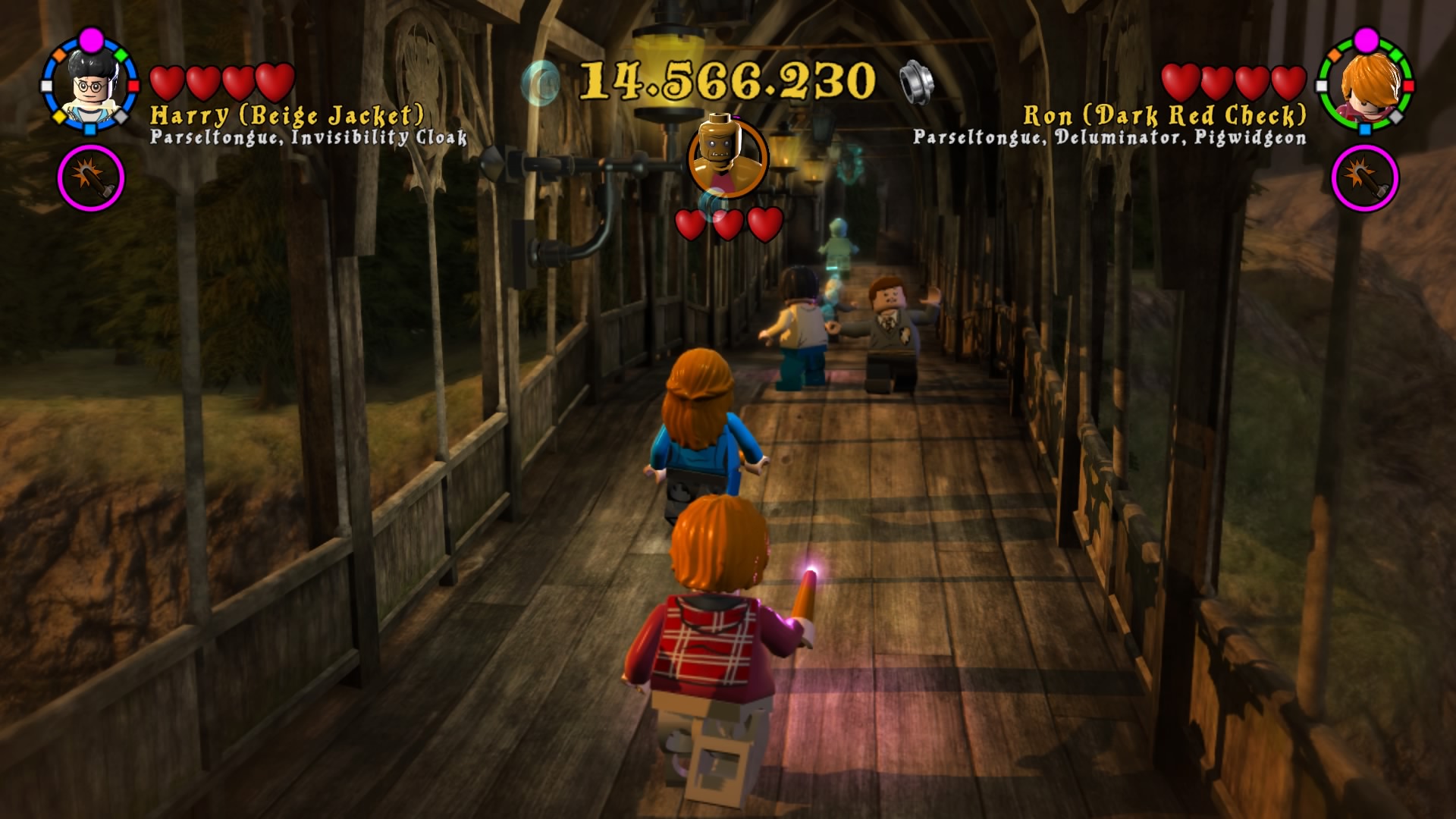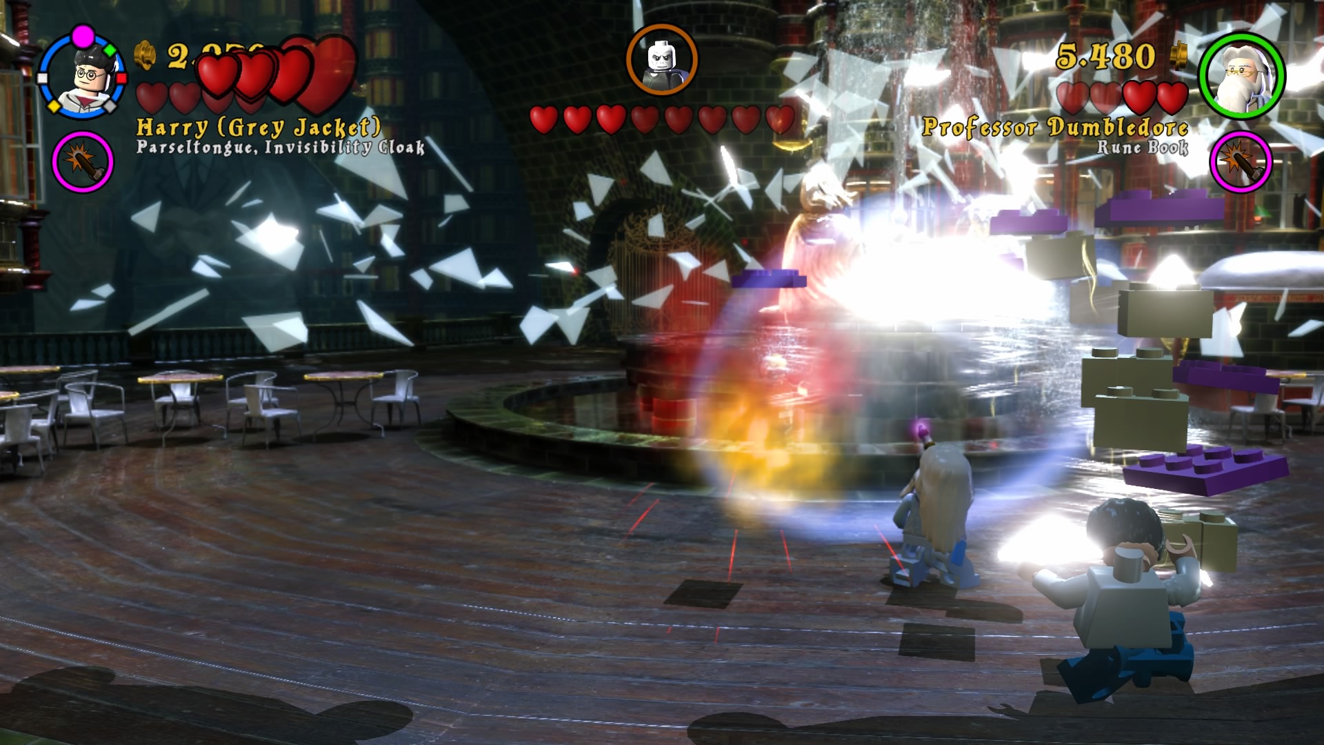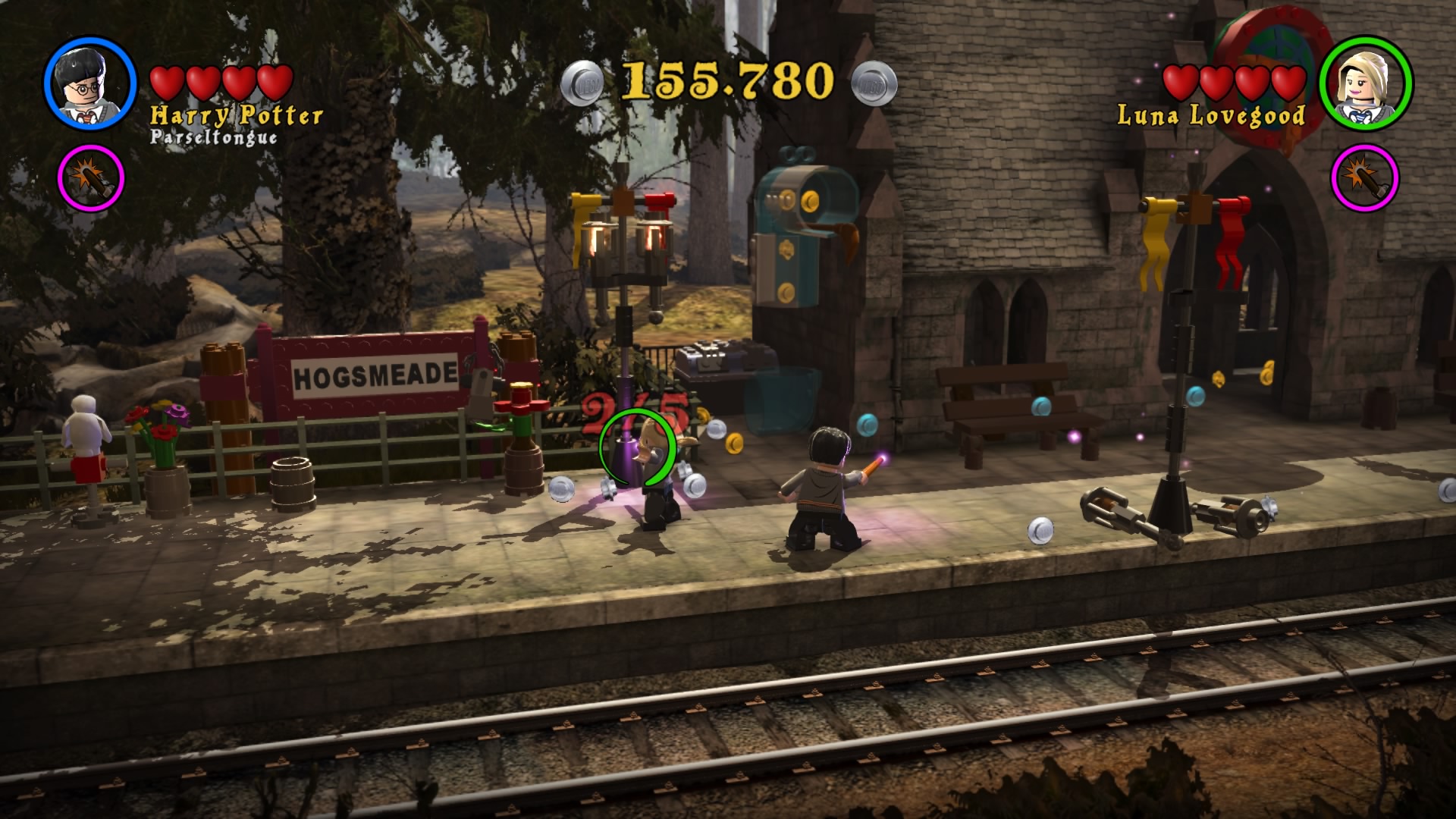 Po uruchomieniu zremasterowanej kolekcji dostajemy menu, w którym możemy wybrać okładki dwóch tytułów składających się na, jeszcze do niedawna kompletną, historię naszego czarodzieja. Zabrałem się za nie chronologicznie. Muszę powiedzieć, że różnica między współczesnymi grami LEGO, a tymi z poprzedniej generacji jest zauważalna od razu. Przez ostatnie pół roku skończyłem z moją wierną towarzyszką co-opa kilka gier z serii – Batmana 3: Poza Gotham, Gwiezdne Wojny: Przebudzenie Mocy i zaczęliśmy Hobbita. Ten ciąg grania w produkcje z klockami przerwała nam właśnie opisywana kolekcja. Różnice w rozgrywce rzucają się w oczy od razu. Dostajemy powrót do starego stylu. W pierwszych częściach występowały nieme postaci i pantomima, natomiast w nowych mamy teksty aktorów z filmów wypowiadane przez klocki. Nie pojawiają się teksty do czytania, ani nic rozwijającego fabułę ponad to, co pokazują emocje na klockach. Jest to fantastyczny powrót do korzeni i dopiero w takim zestawieniu widać, co seria straciła na przestrzeni lat rozwoju. Nie znaczy to oczywiście, że wolałbym powrót do starego stylu. Miał on w sobie jakiś czar, ale najlepszym wyjściem byłby wybór lub zmiksowanie dwóch pomysłów.