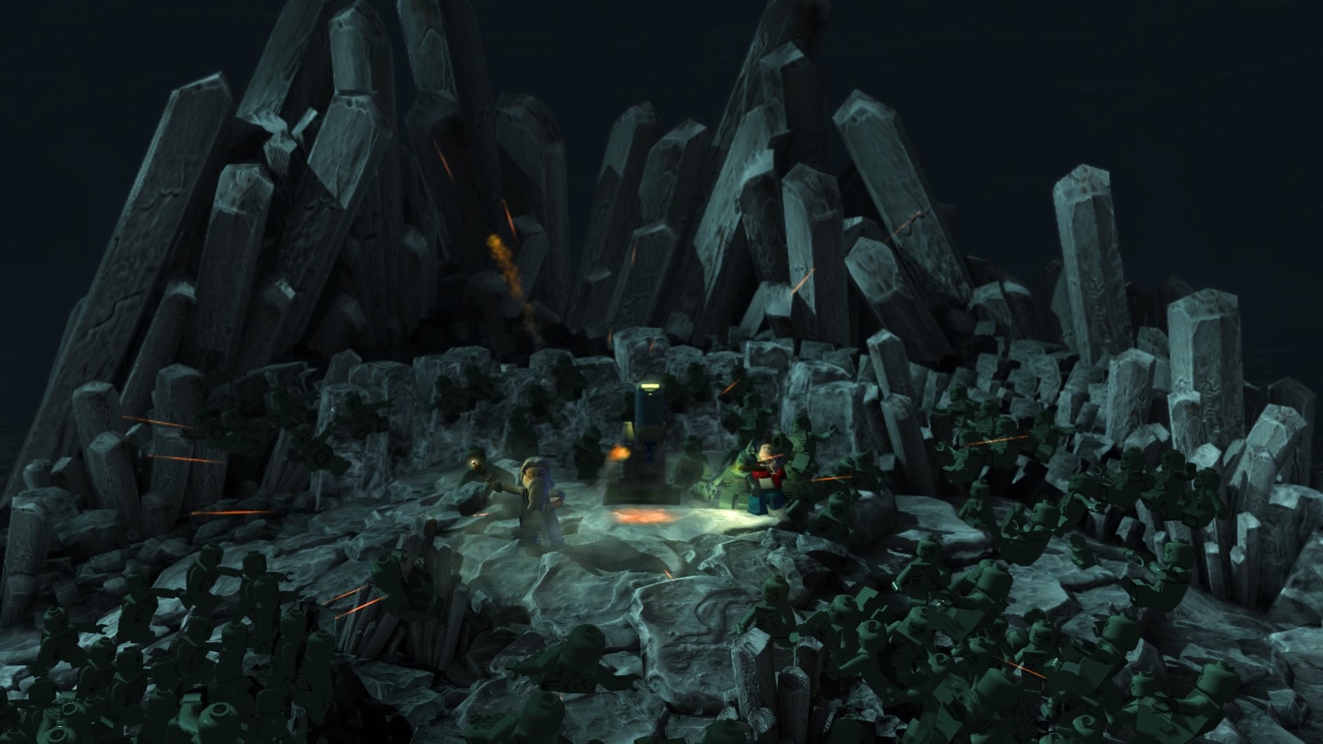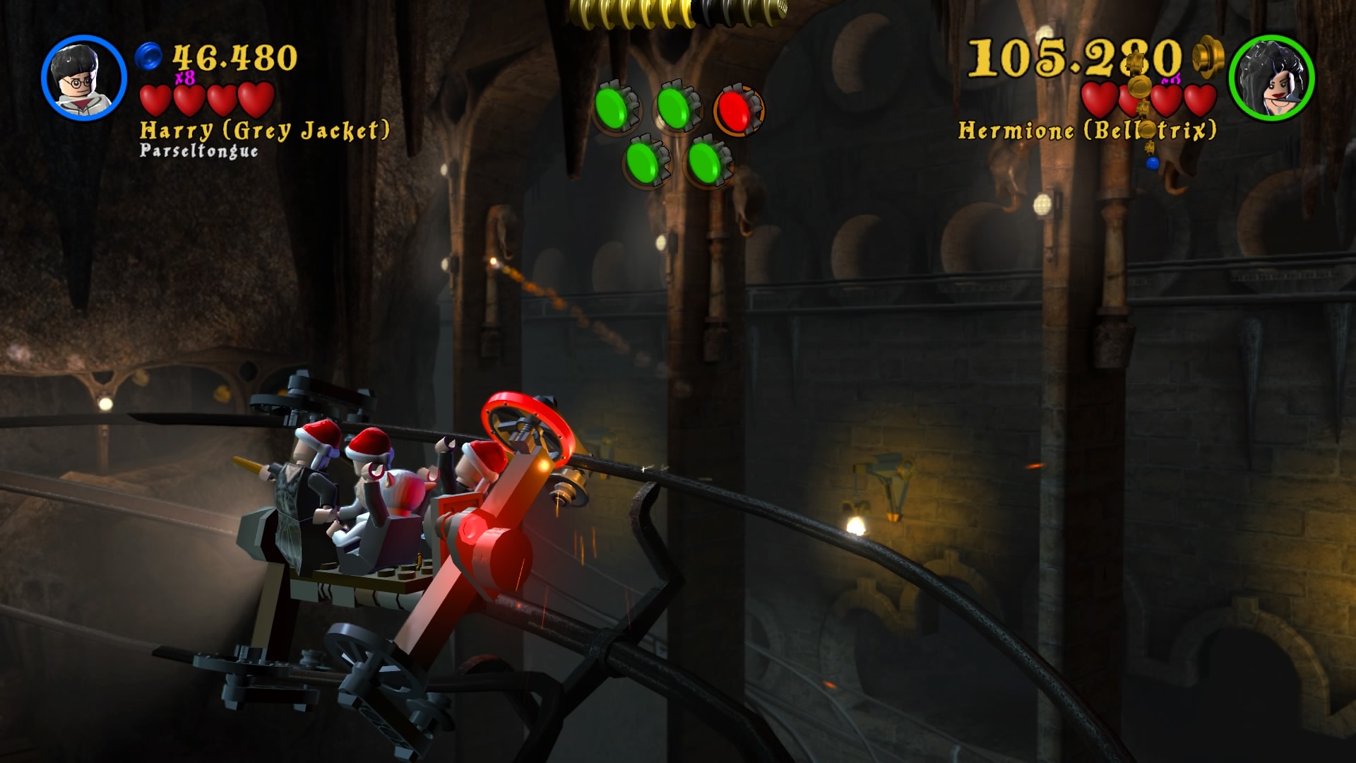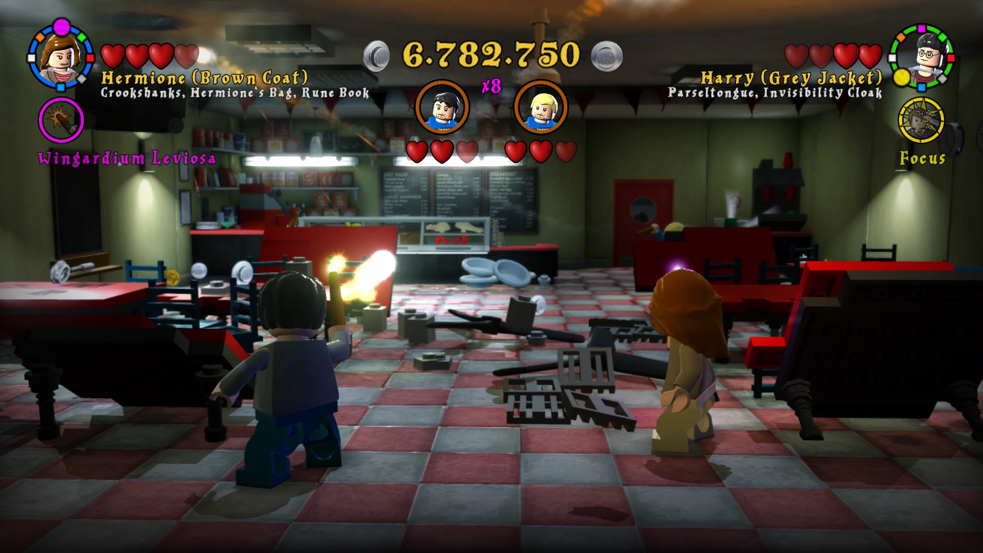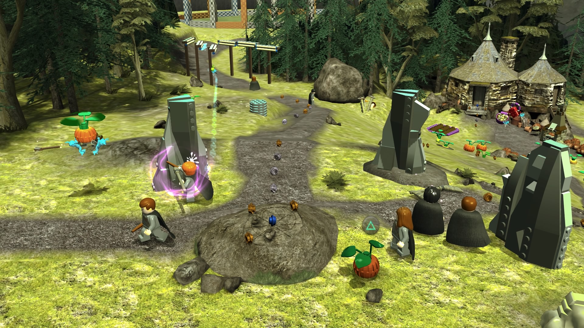 Po uruchomieniu zremasterowanej kolekcji dostajemy menu, w którym możemy wybrać okładki dwóch tytułów składających się na, jeszcze do niedawna kompletną, historię naszego czarodzieja. Zabrałem się za nie chronologicznie. Muszę powiedzieć, że różnica między współczesnymi grami LEGO, a tymi z poprzedniej generacji jest zauważalna od razu. Przez ostatnie pół roku skończyłem z moją wierną towarzyszką co-opa kilka gier z serii – Batmana 3: Poza Gotham, Gwiezdne Wojny: Przebudzenie Mocy i zaczęliśmy Hobbita. Ten ciąg grania w produkcje z klockami przerwała nam właśnie opisywana kolekcja. Różnice w rozgrywce rzucają się w oczy od razu. Dostajemy powrót do starego stylu. W pierwszych częściach występowały nieme postaci i pantomima, natomiast w nowych mamy teksty aktorów z filmów wypowiadane przez klocki. Nie pojawiają się teksty do czytania, ani nic rozwijającego fabułę ponad to, co pokazują emocje na klockach. Jest to fantastyczny powrót do korzeni i dopiero w takim zestawieniu widać, co seria straciła na przestrzeni lat rozwoju. Nie znaczy to oczywiście, że wolałbym powrót do starego stylu. Miał on w sobie jakiś czar, ale najlepszym wyjściem byłby wybór lub zmiksowanie dwóch pomysłów.