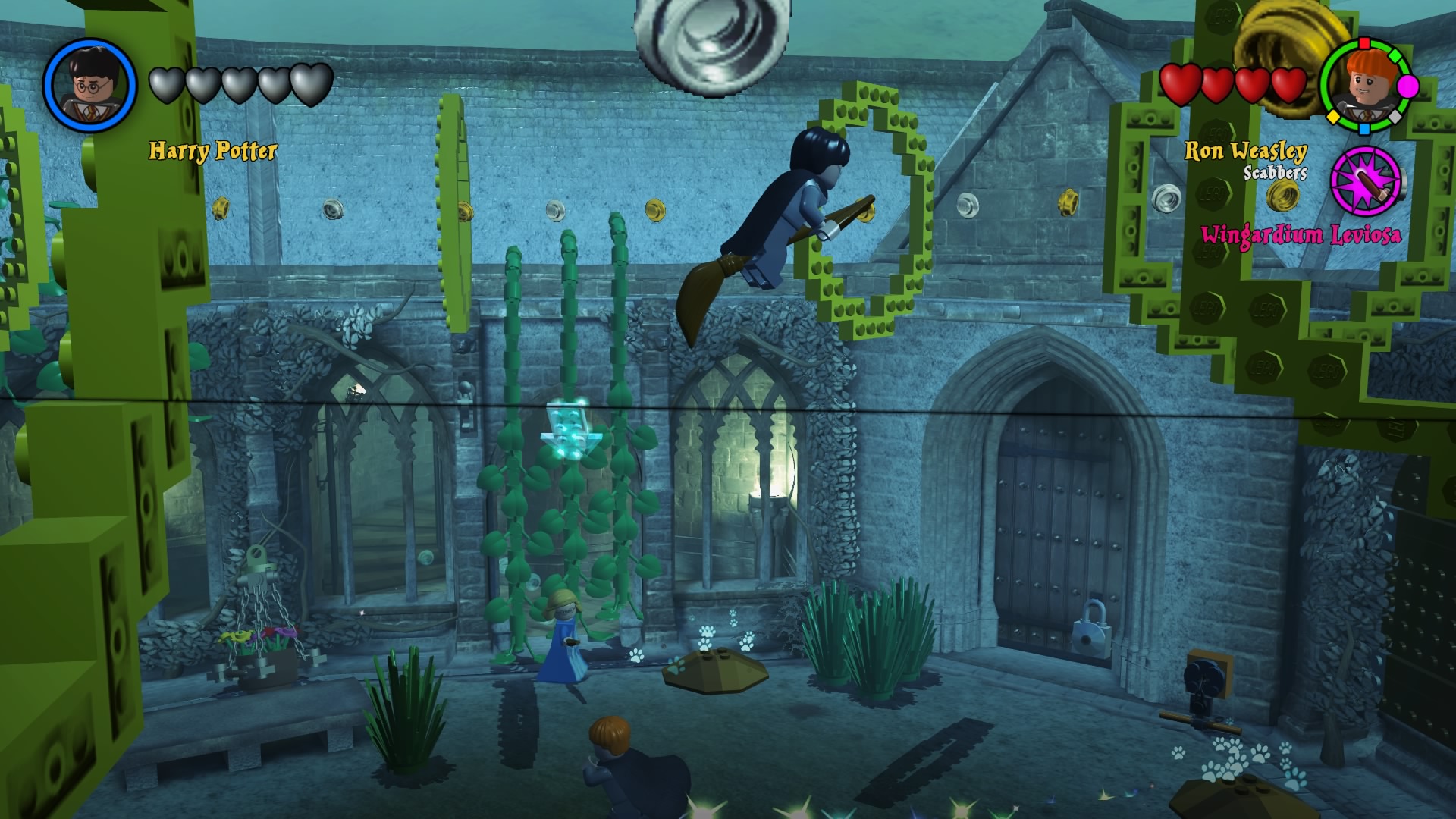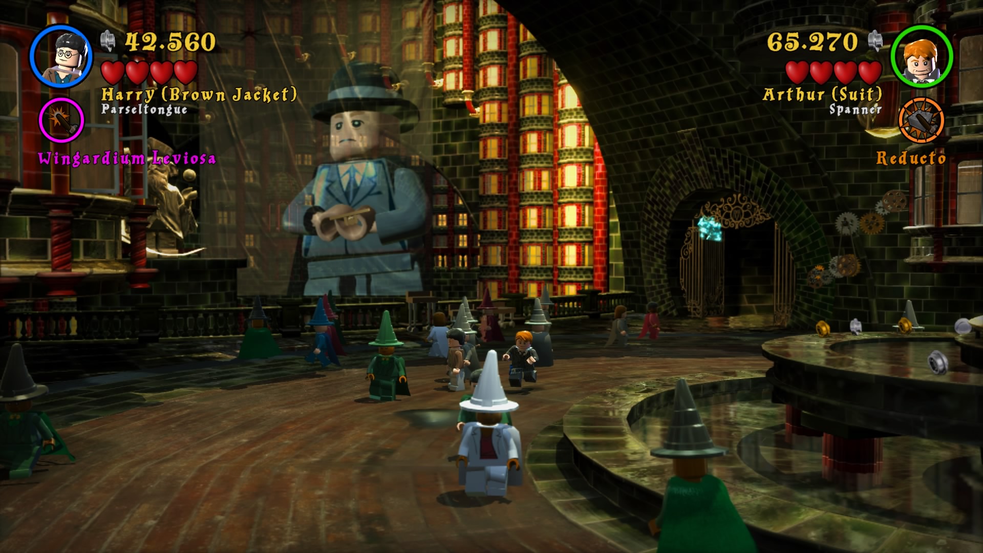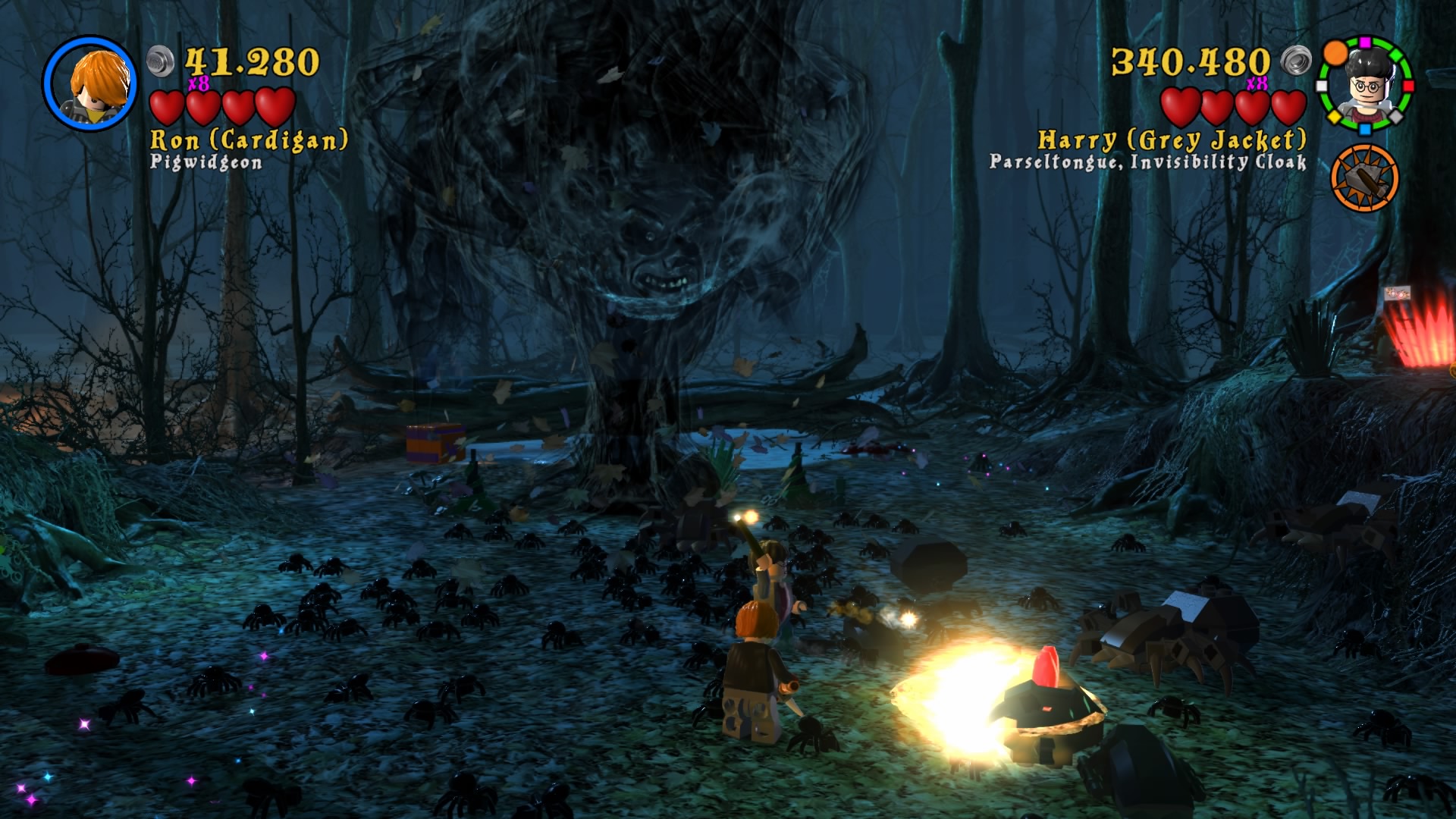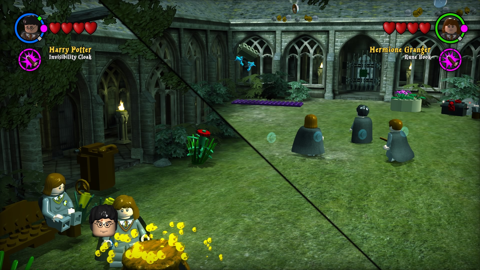 Naszym HUBem jest Hogwart. Możemy go zwiedzać, swobodnie się poruszać i wykonywać masę zadań rozmieszczonych w różnych jego częściach. Każde z poszczególnych lat jest podzielone na 6 misji, co daje nam po 24 misje na część plus bonusowe poziomy i teren szkoły. Nie zabraknie oczywiście słynnych peronów i ulicy Pokątnej. Wraca też cała plejada postaci znanych z uniwersum. Szkoda tu wszystkie wymieniać, bo jest ich odpowiednio 167 i 200. Mam wrażenie, że niektórzy to już jacyś kompletni statyści, albo moja pamięć jest tak zawodna. Zabawa w bieganie i wykonywanie kolejnych zadań daje masę radości. Zaliczenie historii obu gier zajmuje około 24 godzin, przy czym jeśli chcemy wycisnąć z nich wszystkie soki, to łącznie dostaniemy 50-60 godzin zabawy. Ogrywałem całość w kooperacji i natykałem się na problemy kamery, wariował też czasami kursor podczas zmian położenia drugiego gracza. Problem jest również z trofeami, które pierwszemu graczowi wpadają normalnie, a dla kompana są dziwnie wyselekcjonowane i zdobywa tylko część. Dla porównania w Lego Batman 3: Poza Gotham można zdobyć platynę grając wspólnie i obie osoby otrzymują komplet.