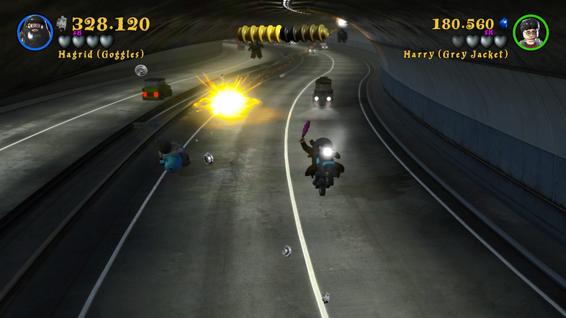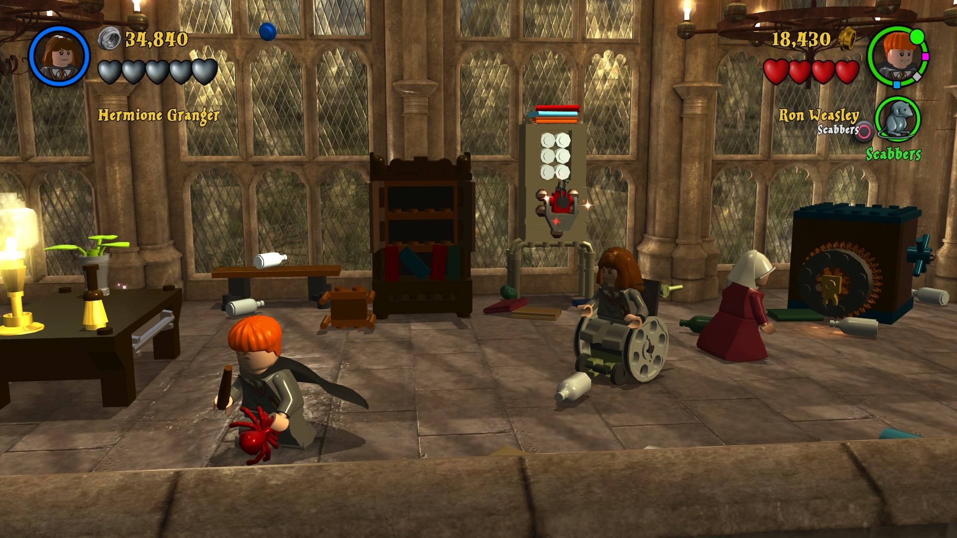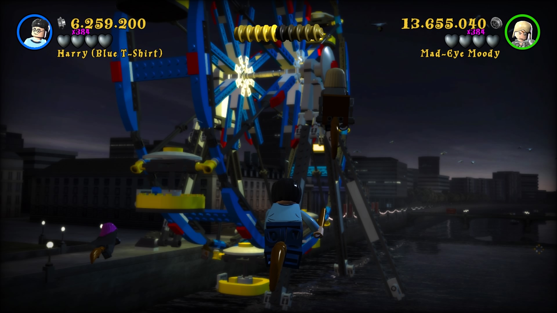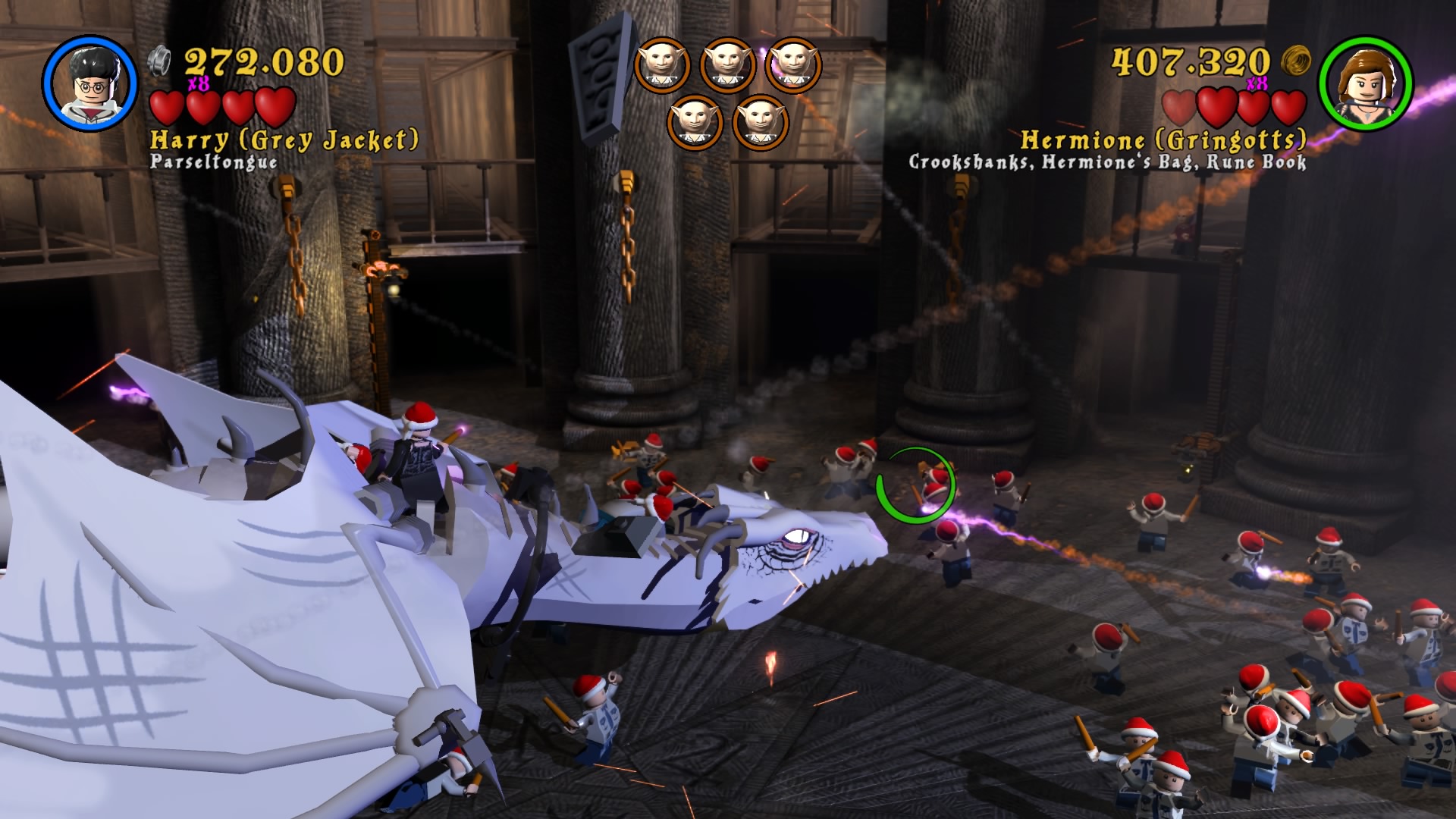 Naszym HUBem jest Hogwart. Możemy go zwiedzać, swobodnie się poruszać i wykonywać masę zadań rozmieszczonych w różnych jego częściach. Każde z poszczególnych lat jest podzielone na 6 misji, co daje nam po 24 misje na część plus bonusowe poziomy i teren szkoły. Nie zabraknie oczywiście słynnych peronów i ulicy Pokątnej. Wraca też cała plejada postaci znanych z uniwersum. Szkoda tu wszystkie wymieniać, bo jest ich odpowiednio 167 i 200. Mam wrażenie, że niektórzy to już jacyś kompletni statyści, albo moja pamięć jest tak zawodna. Zabawa w bieganie i wykonywanie kolejnych zadań daje masę radości. Zaliczenie historii obu gier zajmuje około 24 godzin, przy czym jeśli chcemy wycisnąć z nich wszystkie soki, to łącznie dostaniemy 50-60 godzin zabawy. Ogrywałem całość w kooperacji i natykałem się na problemy kamery, wariował też czasami kursor podczas zmian położenia drugiego gracza. Problem jest również z trofeami, które pierwszemu graczowi wpadają normalnie, a dla kompana są dziwnie wyselekcjonowane i zdobywa tylko część. Dla porównania w Lego Batman 3: Poza Gotham można zdobyć platynę grając wspólnie i obie osoby otrzymują komplet.