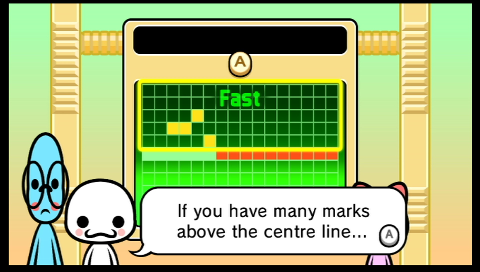 Po pierwszym uruchomieniu musimy przejść krótki test. Ma on na celu sprawdzenie naszego poczucia rytmu, pokazując mniej-więcej na czym będą polegać przyszłe mini-gierki. Ukończenie jego polega na wciskaniu jednego przycisku w odpowiednim momencie. Gdy tylko go zakończymy, gra przenosi nas do ekranu pozwalającego na wybór jednej z wielu, stopniowo odblokowujących się mini-gierek. W przeciwieństwie do najnowszego Rhythm Paradise Megamix, nie znajdziemy tutaj żadnej nawet najprostszej linii fabularnej, co nie przeszkadza w rozgrywce.