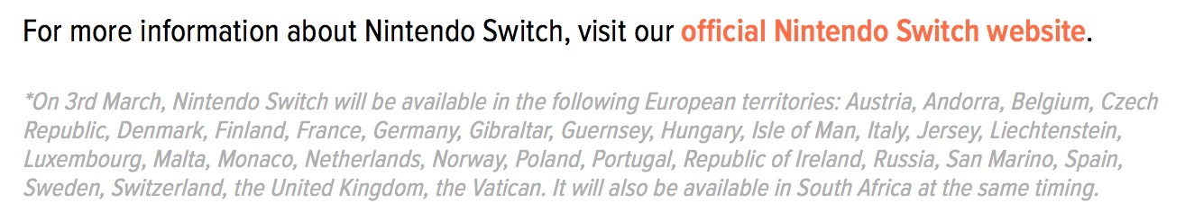 Nintendo Switch będzie jedną z nielicznych konsol firmy, która trafi w tym samym czasie na całym świecie. Poprzednie urządzenia debiutowały na kolejnych rynkach z drobnym opóźnieniem – w przypadku Wii U wynosiło ono około 12 dni dla Europy (względem USA) oraz około 20 dnia dla Japonii. Tym razem wszyscy otrzymają możliwość zakupu konsoli w tym samym dniu, czyli 3 marca 2017. Potwierdza to lista na stronie europejskiego oddziału Nintendo, potwierdzająca widoczne na poniższej grafice kraje.