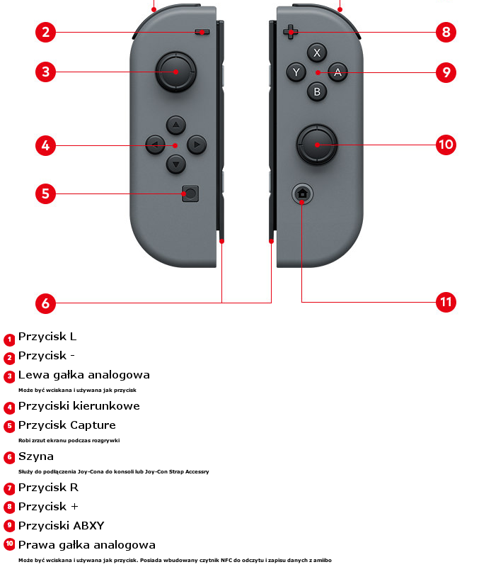 - Przyciski A/B/X/Y/R/ZR/SL/SR/+