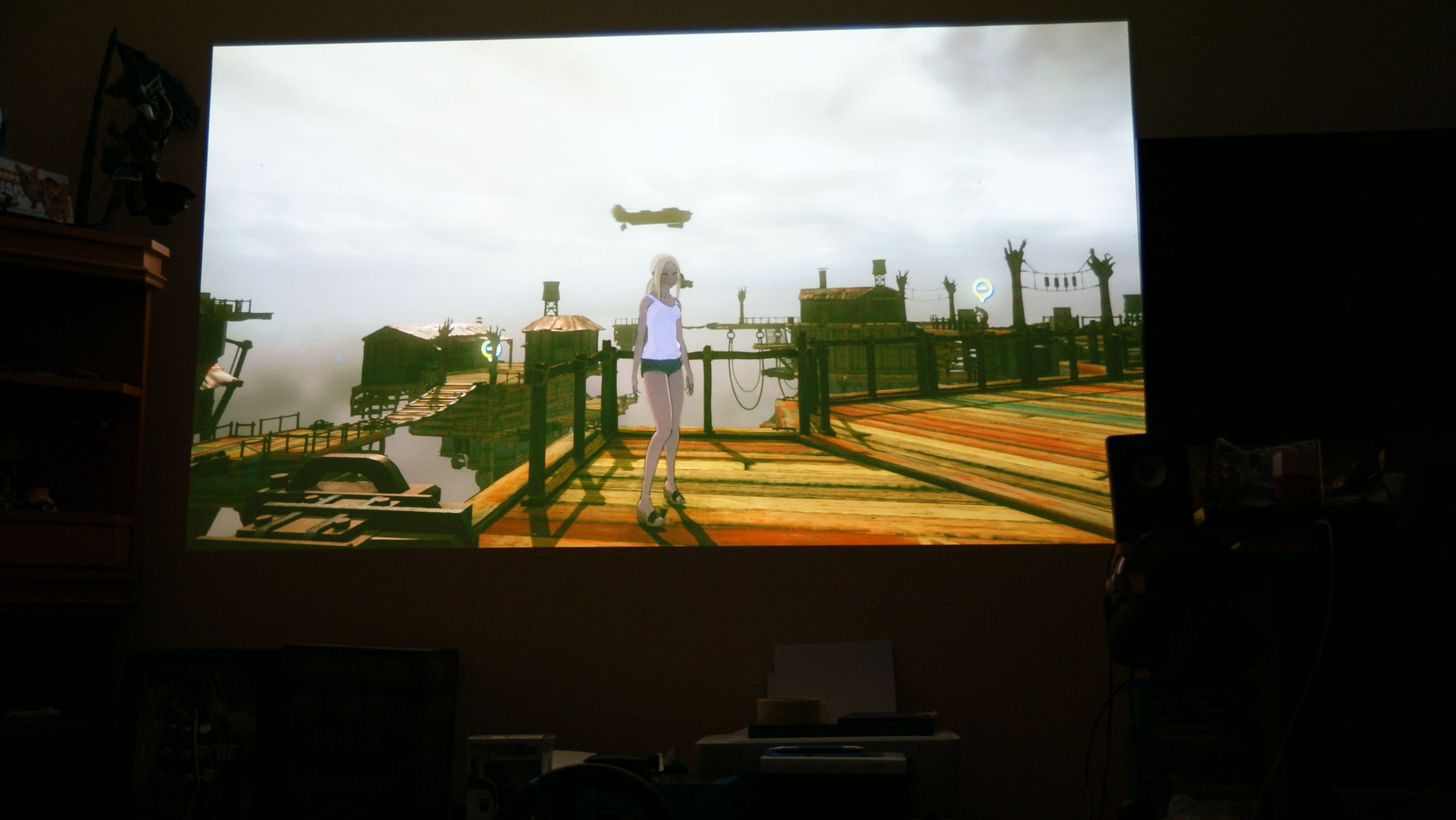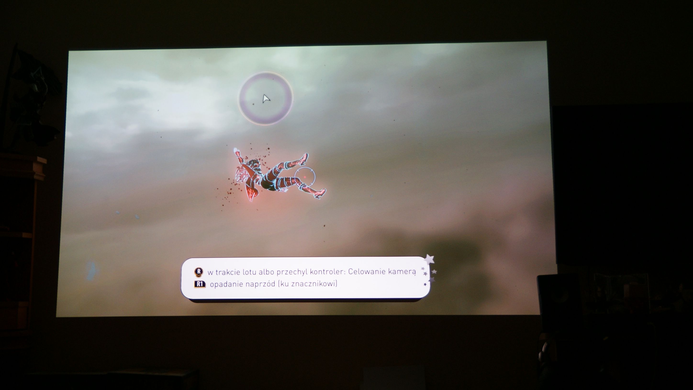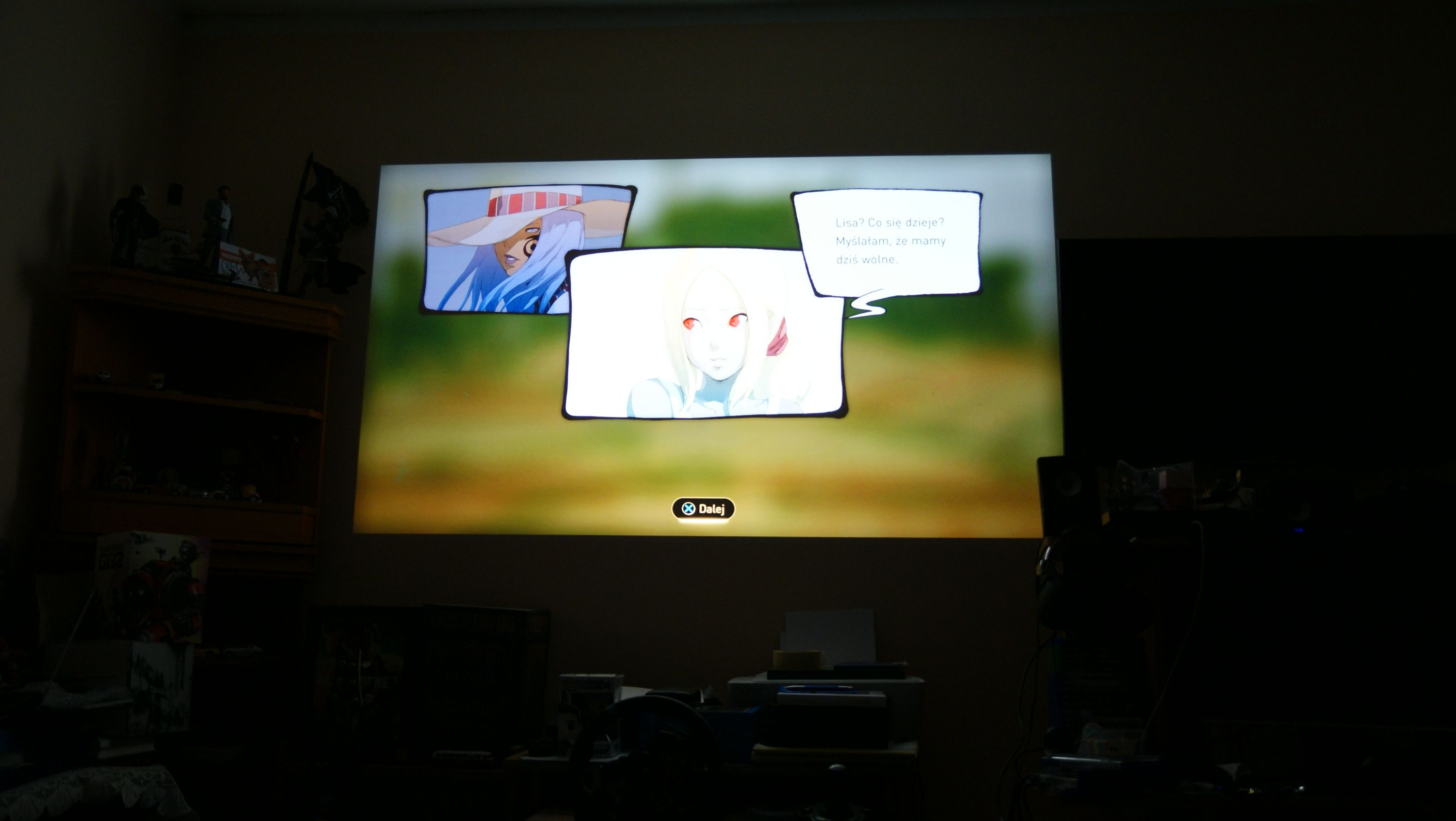Zobaczmy, jakie złącza umieszczono z tyłu projektora: mamy dwa porty HDMI – w tym jedno obsługujące MHL 2.0 (standard interfejsu audio-video dla urządzeń mobilnych) wejście i wyjście audio jack 3.5 mm oraz USB typu A. Podłączenie z konsolą jest banalne. Używamy do tego oczywiście kabla HDMI, a na projektorze ustawiamy tryb GAME. To wszystko, można już zacząć grać w swoje ulubione tytuły . Projektor miałem ustawiony wedle zaleceń 2.5 m od ściany, a sam siedziałem na kanapie oddalonej o 3 m. Obraz był duży, mój 42 calowy TV przy obrazie z projektora wydawał się tylko małym monitorem. Jednak te 100 cali rzucone na ścianę nie było tak duże, aby biegać oczami po ekranie. Granie z 3 metrów było bardzo komfortowe.