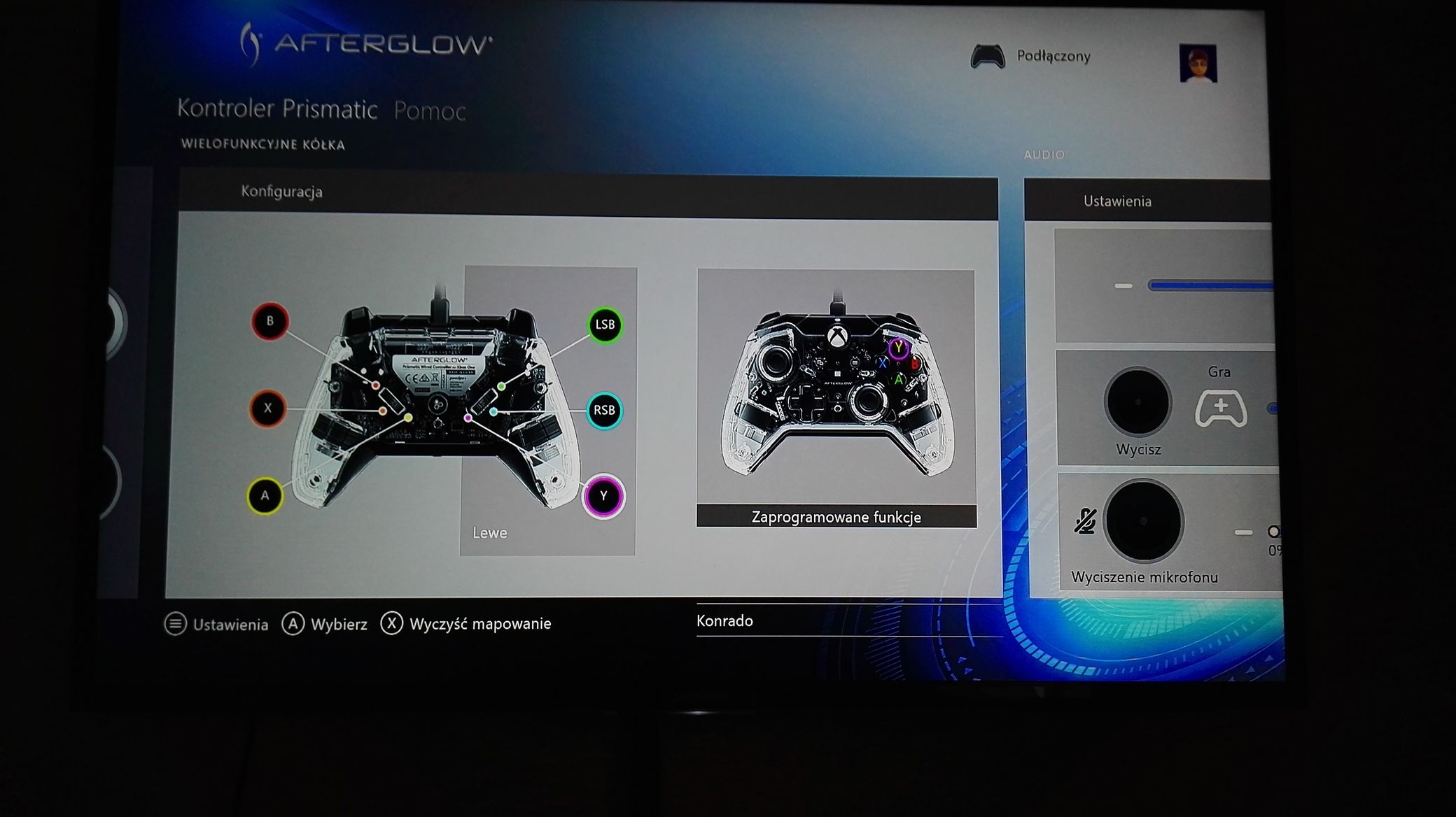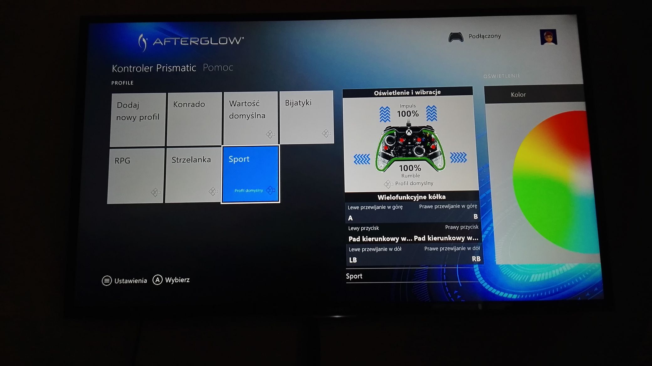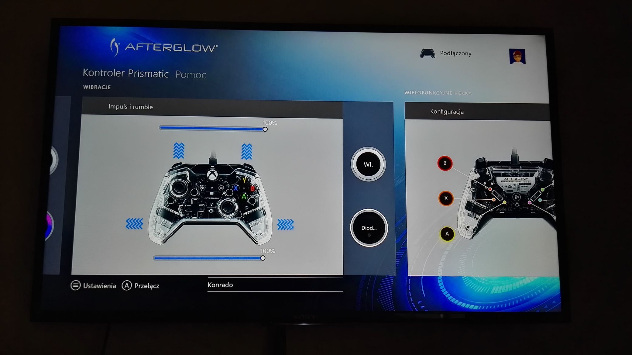 To jeszcze nie koniec możliwości PDP Afterglow. Kontroler posiada na Xbox One dedykowaną aplikację, która – ku mojemu wielkiemu zaskoczeniu – jest w polskiej wersji językowej. Dzięki tej aplikacji możemy dostosować wszystkie funkcje kontrolera. Oczywiście na start dostajemy pięć gotowych profili przygotowanych przez PDP: do gier sportowych, bijatyk, wyścigów oraz strzelanek. Gdy zdecydujemy się na własny profil, to możemy sobie konfigurować takie funkcje jak: