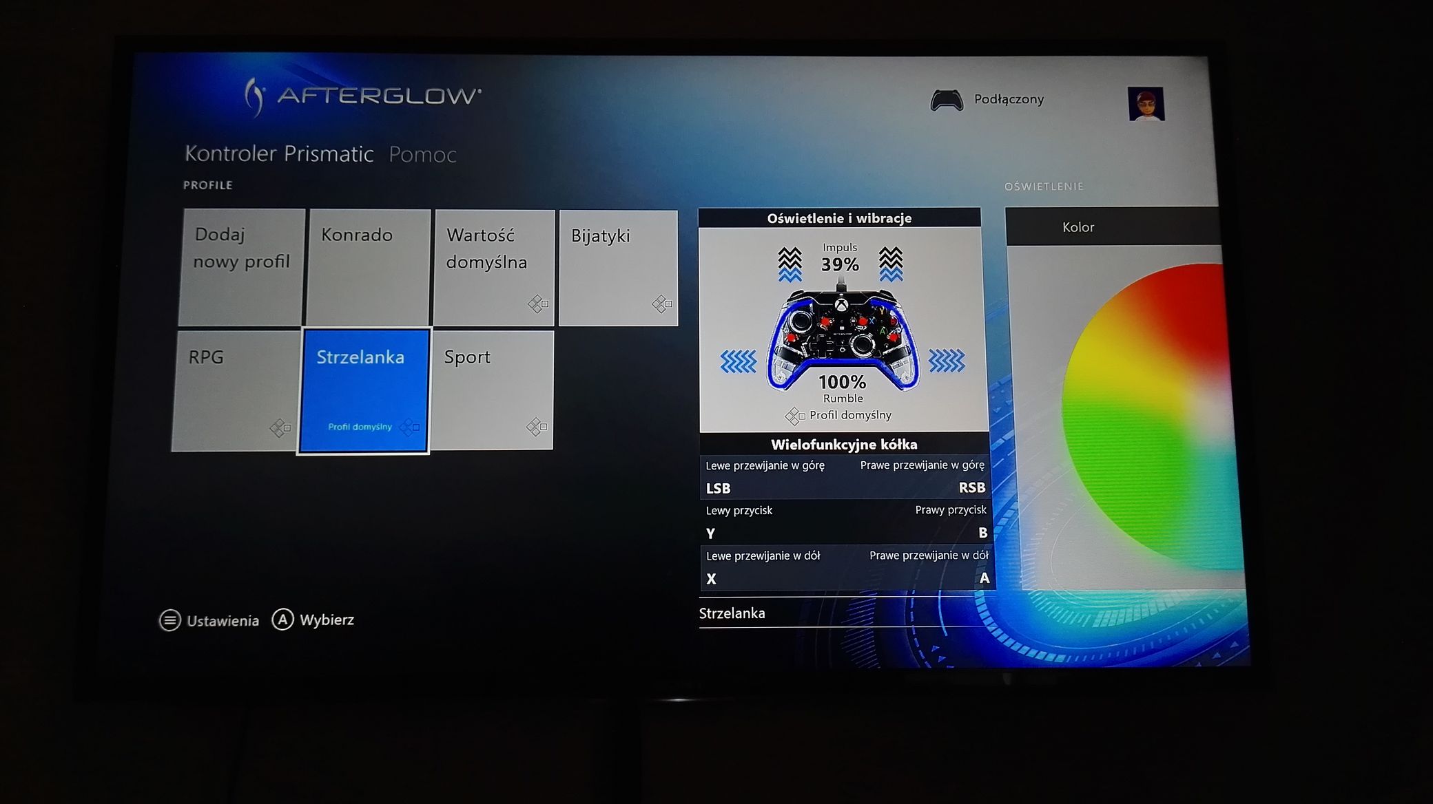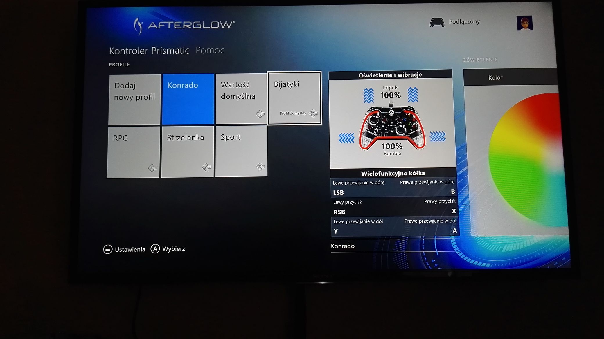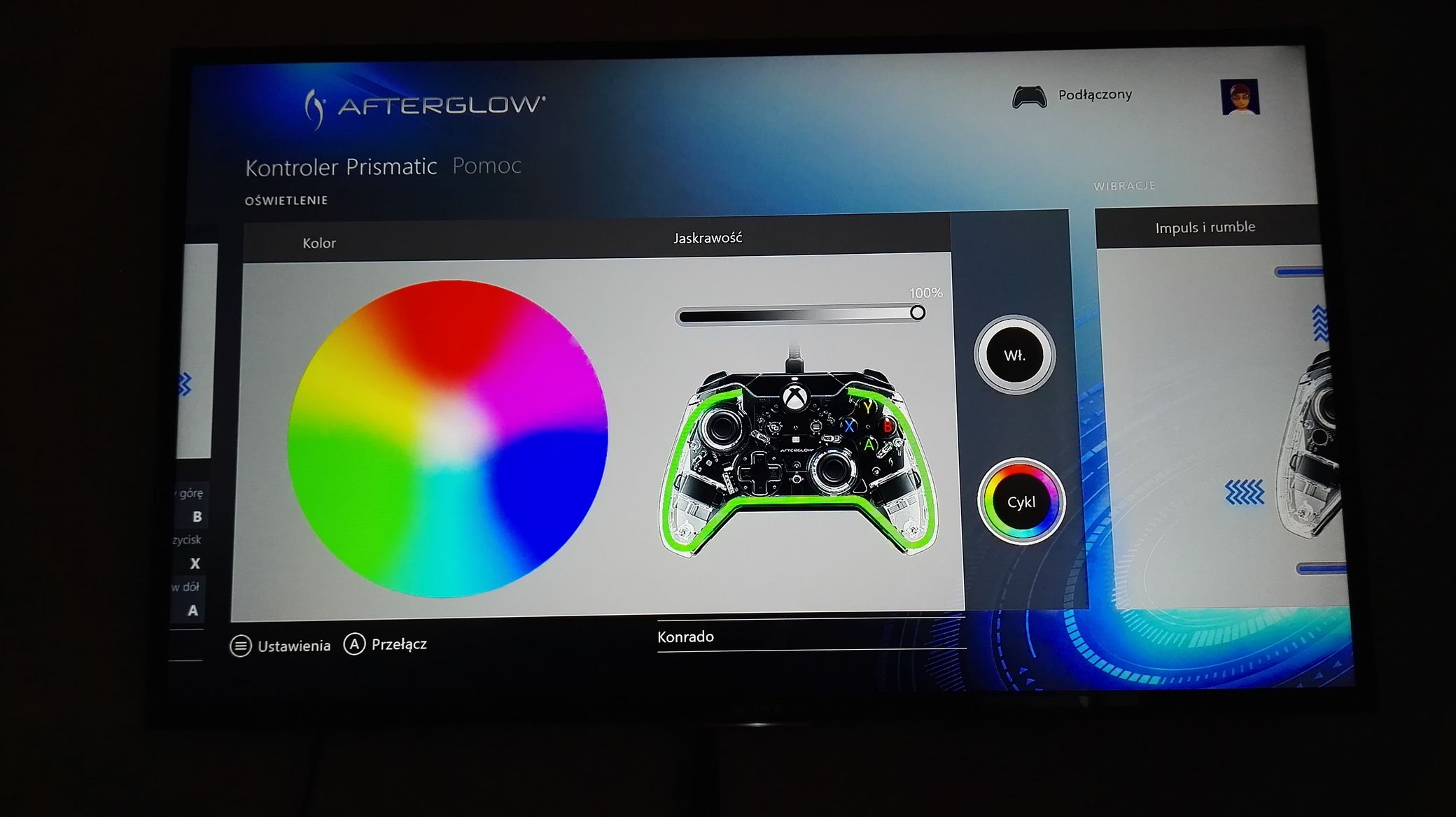 - Podświetlanie – możemy ustawić dowolny kolor lub odpalić cykl, aby kontroler mienił się rożnymi kolorami