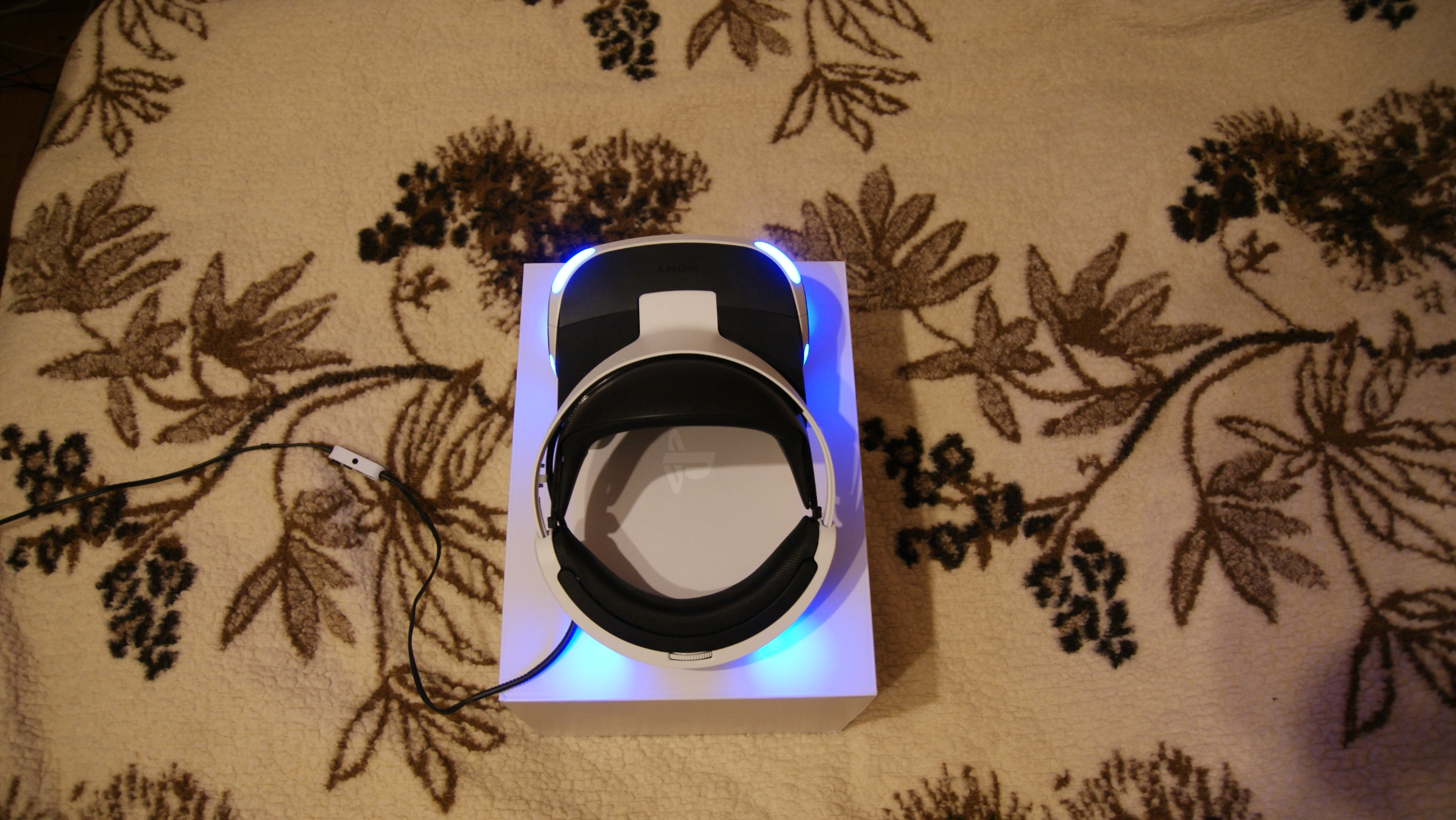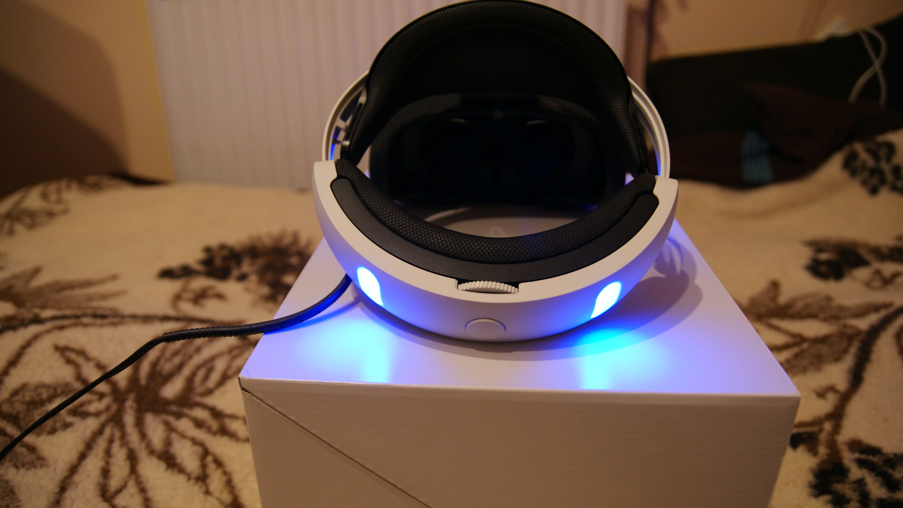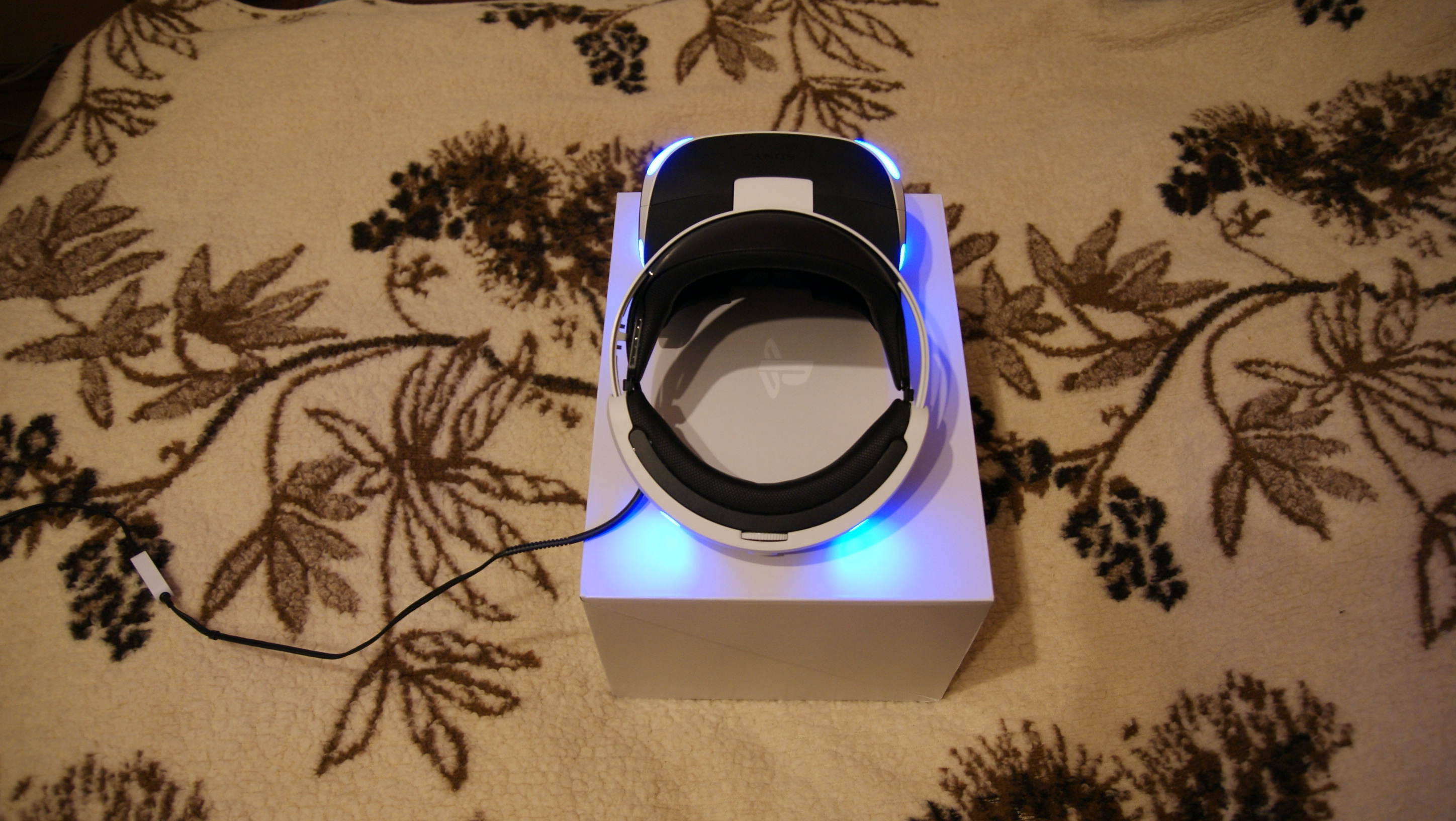 PSVR ma świetnie przemyślaną konstrukcję. Całe pudełko zawierające elektronikę, ekrany LCD i soczewki przymocowane jest do plastikowej obręczy, której długość regulujemy gumowymi paskami. Gdy już włożymy gogle na głowę, to z tyłu obręczy jest pokrętło, którym ściskamy obręcz. Ale to nie koniec – cale pudełko z elektroniką jeździ jeszcze na małych szynach, dzięki czemu możemy dosłownie soczewki docisnąć do oczu. Cała wewnętrzna obudowa jest pokryta gumą, która powoduje, że do środka nie docierają żadne promienie światła. Wokół okularów są rozmieszczone podświetlane na niebiesko czujniki. To właśnie dzięki nim PS kamera lokalizuje pozycje gogli. Skrzyneczka, którą mamy przed oczami skrywa soczewki oraz 5,7-calowy panel OLED 120 Hz, wyświetlający obraz w rozdzielczości 960×1080 na oko. Nie jest to więc pełne FullHD. Niestety, najwiekszą wadą PSVR jest praktycznie całkowity brak wygładzania krawędzi. O ile przedmioty na pierwszym palnie wyglądają przyzwoicie, to obiekty rysowane w oddali są bardzo ubogie w detale i mocna „ząbkują”.