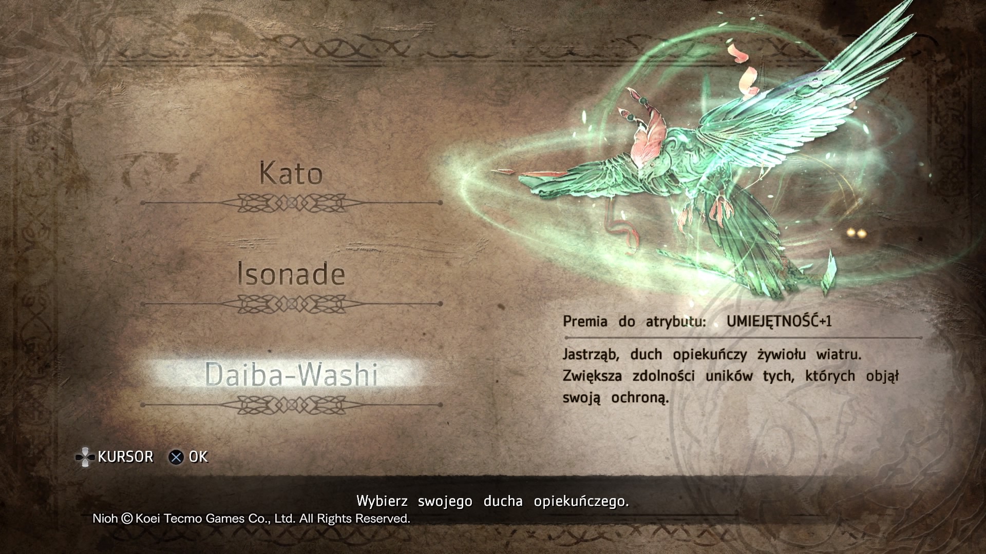 Duchy opiekuńcze pełnią w Nioh role „żywej broni”, wystarczy zabić kilku przeciwników, aby napełnić pasek do pełna. Aktywacja Ducha opiekuńczego zmienia pasek życia i wytrzymałości w pasek żywej broni. Przez pewien czas możemy zadawać bardzo duże obrażenia, szybciej się poruszać oraz przyjąć kilka ciężkich ciosów od przeciwnika nie martwiąc się o utratę zdrowia. Każdy duch daje spore premie do ataku, obrażeń od żywiołów, obrony oraz kilka dodatkowych bonusów, jak wypadanie lepszych przedmiotów, większej ilości złota, czy przyrostu amrity. Amrita jest odpowiednikiem duszy z Dark Souls, czy tętnic krwi z Bloodborne. Czyli tłumacząc na polski język, są to po prostu punkty doświadczenia, za które awansujemy naszego bohatera na wyższy level zwiększając przy tym rozwój kluczowych dla nas umiejętności. Z każdym kolejnym poziomem postaci będziemy potrzebowali więcej amrity, do wbicia wyższego levelu. Amrite pozyskujemy z pokonanych wrogów, z odnalezionych kryształków oraz otrzymujemy za wykonane misje fabularne i zadania poboczne. Świetną opcją zdobycia amrity jest złożenie niepotrzebnego przedmiotu, broni lub pancerza w ofierze w chramie.