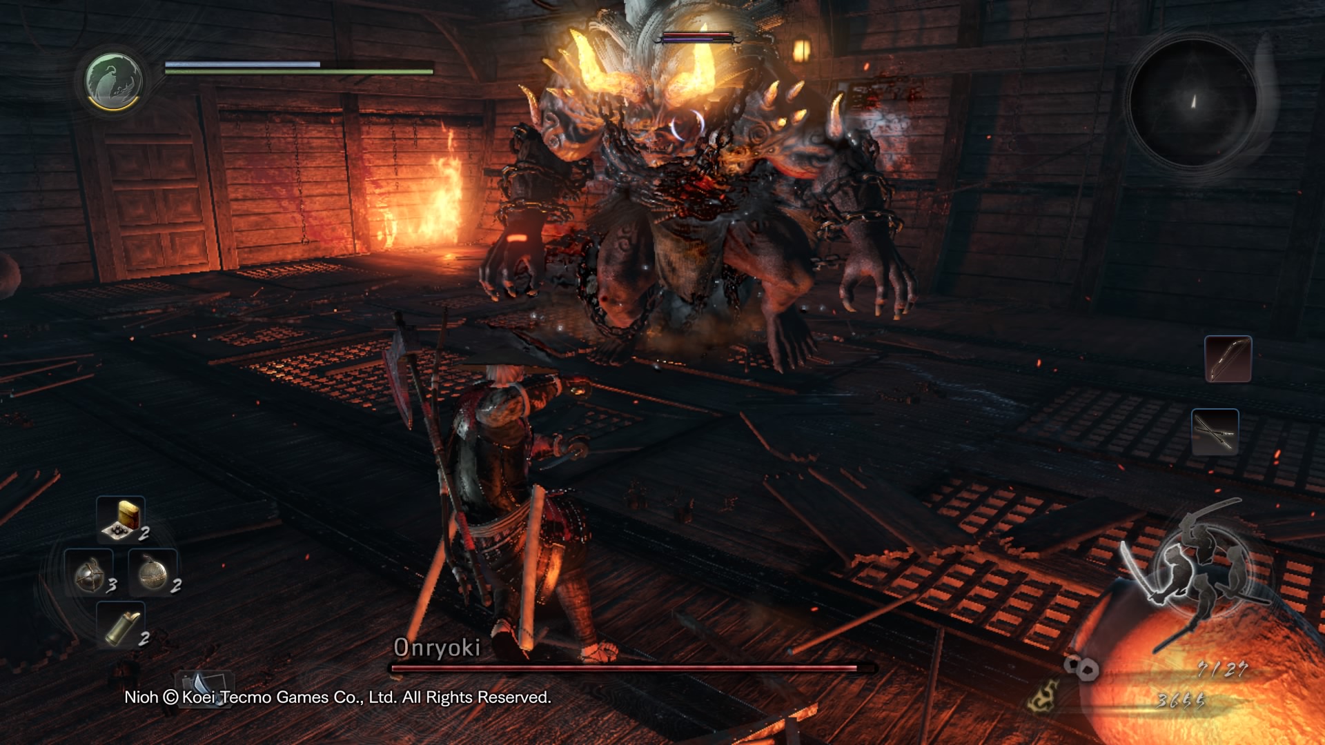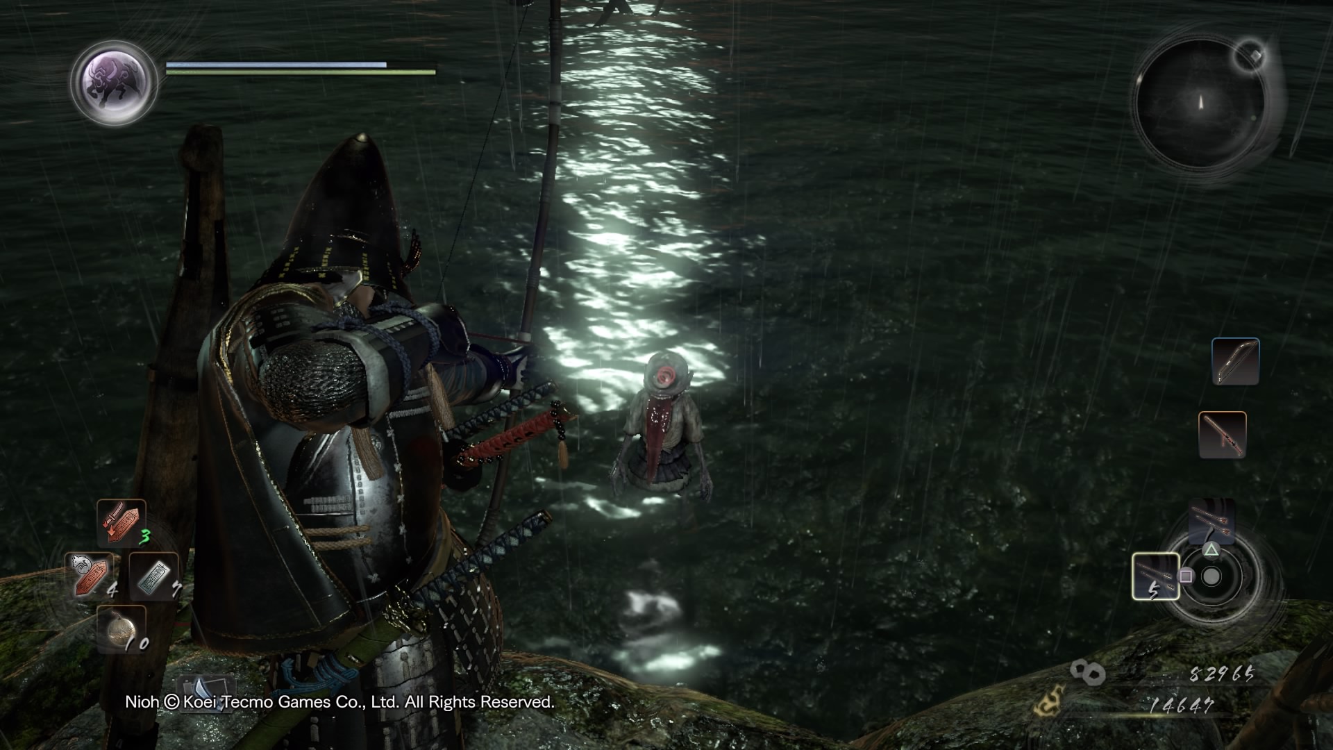 Starcia w Nioh są dynamiczne i bardzo trudne, tutaj nie można bezmyślnie naciskać szybki lub silny atak, taki sposób walki szybko pozbawi nas wytrzymałości i staniemy się bezbronni. Energia KI jest nam potrzebna do każdej czynności, musimy bacznie kontrolować ile nasze ciosy zużywają energii, tak aby zostało nam jeszcze trochę wytrzymałości na przegotowanie bloku lub wykonanie uniku, a następnie wyprowadzenie kolejnego ataku. Za pomocą prawego analogu możemy namierzać przeciwnika i zablokować sobie kamerę na nim. Wyświetlone zostanie tez wtedy zdrowie i energia KI przeciwnika. Wielu przeciwników potrafi wokół siebie wytworzyć Kraine Yokai, to okrągłe pole, w którym demony odzyskują zdrowie i energię KI. Gdy gracz znajdzie się w takim polu to jego zdrowie i KI będą odnawia się znacznie wolniej. Zazwyczaj walczymy z jednym przeciwnikiem, ale czasem ktoś potrafi się podłączyć do pojedynku, często walcząc z jednym przeciwnikiem, możemy wejść w pole drugiego. Kluczem do sukcesu jest odpowiednia rozeznanie na polu bitwy swoich możliwości oraz szybkie poznanie słabych stron przeciwnika. Cieszę się bardzo, że w Nioh są bronie dystansowe takie, jak łuki, czy karabiny jednostrzałowe. Często pozwalało mi to powybijać strzałem w głowę niegroźnych przeciwników, a dopiero na czystym obszarze zabierać się za tych najpotężniejszych.
