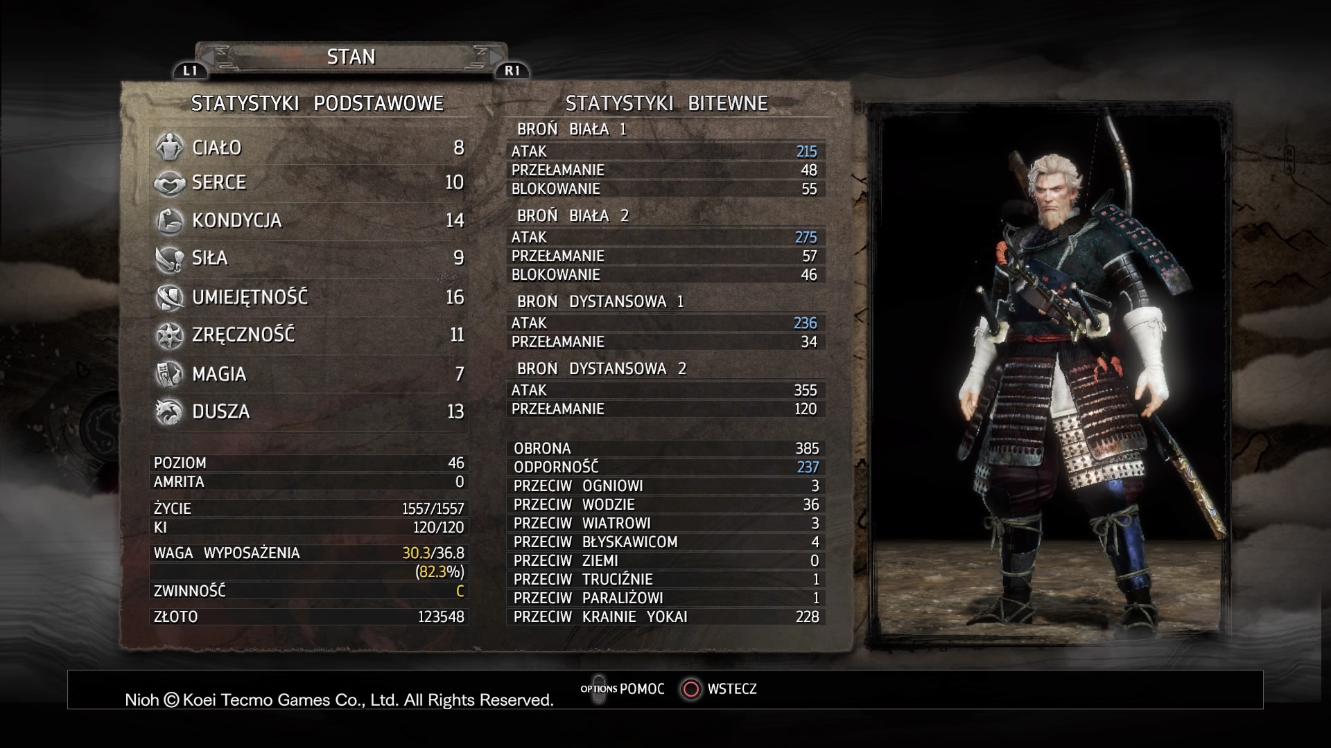 W Polsce szybko przejęło się, że Nioh będzie „japońskim wiedźminem” – nie, nie będzie. Nie każdy mężczyzna z siwymi włosami uczesany w kucyka będzie wiedźminem. Oczywiście obie gry łączy kilka wspólnych elementów, jak system rozwoju postaci, zabijanie potworów, walki z bossami, gromadzenie rynsztunków pancerzy, czy wykonywanie misji pobocznych. Jednak w tym wszystkim Wiedźmin 3 jest fantastyczną grą przygodową pełną masy dialogów i scenek przerywnikowych. Nioh pod względem fabularnym jest prosty, tutaj historie opowiada nam świat gry. Rozmawiamy głównie tylko przed i po zakończeniu zadania. Nioh nie ma także otwartego świata, jest pocięty na zamknięte lokacje, jak np. Toukiden. Trafiamy do niedużych japońskich regionów, w których na mapie wybieramy sobie misje fabularne lub poboczne. Do tego Nioh charakteryzuje się wspomnianym już wysokim poziomem trudności, przy którym Wiedźmin 3 na najwyższym poziomie trudności, to relaksujący spacerek. Wiedźmin jest tylko wojownikiem, co prawda włada prosta magią Znaków, ale przy możliwościach głównego bohatera Nioh to jest nic. William, bo tak nazywa się główny bohater potrafi na wiele różnych sposobów wpłynąć na przeciwnika, aby go osłabić, czy zdezorientować. Podobnie na swoją postać, jest wiele różnych przedmiotów, które wpływają na obronę i atak bohatera, nasz oręż możemy dopakować wieloma rożnymi mocami lub żywiołami. Niestety jesteśmy w tym wszystkim ograniczeni przez pasek wytrzymałości, który w Nioh nazywa się „KI”. Każda nasza czynność zużywa energię, czy to bieganie, bloki lub szybkie i silne ataki. Z czasem nauczymy się impulsu KI, który dzięki szybkiemu naszemu refleksowi jest w stanie momentalnie odnowić zużytą energię.