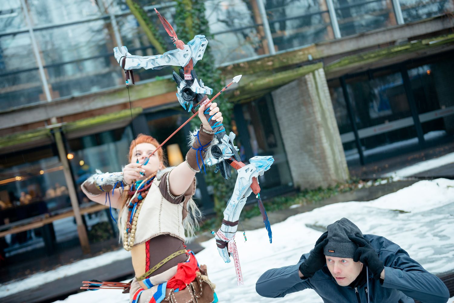 Klaudia: Tak, tak, to jest ten kierunek, dokładnie tak jak mówisz, bo przynajmniej nie muszę kupować peruk, póki co. Czarna Wdowa, Dark Phoenix. Potem przyszedł trailer Horizon Zero Dawn i tak jak już zwróciłeś uwagę, kolor włosów – dosłownie to było to, patrzę “o laska jest ruda, ma warkoczyki” idę w to. Oczywiście, że to jest świat postapo, klientka strzela z łuku i jest jedno wielkie łał. Za strój zabrałam się w sierpniu 2016 roku. W ogóle to ja opóźniałam start tego cosplayu, bo działy się różne rzeczy, suma sumarum zaczęłam go robić, jak już legenda krąży i to jest prawdziwe, z szyną gipsową na ręku po wypadku, miałam czołówkę, tuż po urlopie. I podejrzenia złamania nadgarstka więc w ogóle było wesoło. (Red: z czyjej winy?) Nie z mojej, a żeby było śmiesznie wyjechałam dopiero co od mechanika po naprawie pompowtrysków, które wysiadły jak wyjeżdżałam po urlopie z Krakowa i jeszcze czekało mnie lawetowanie do Szczecina. Wyobrażasz sobie jaka drama. Podejrzenie złamania nadgarstka, nie wiedziałam, czy wsadzą mnie na 6 tygodni w gips, więc decyzja była szybka, chce mieć strój na T-mobile Warsaw Games Week, więc muszę ludzi poprosić o pomoc. Zaczęło się od szukania kogoś kto mi zrobi łuk, znalazłam – Filip z X-Filunio (do niedawna Black Star Factory), polecam człowieka, on robi dosłownie coś z niczego. Więc konstrukcje łuku zrobił on, malowanie i ozdabianie to już była moja robota. Zrobił mi też strzały, pierwotne lotki zostały wymienione, bo po Amsterdamie już się zorały, więc lotki doklejałam sama nowe. Te wszystkie plecione wynalazki na mojej szyi poza tymi dużymi koralami robiła mi Monika z Art Koral i Deco ze Szczecina. Krawcowa (pani Ania), że tak powiem osiedlowa, która w miejscu gdzie mieszkałam była blisko, uszyła mi tą górną bluzkę i podstawy materiału do karwaszy, żeby mi od razu wszyć zamek, bo ja nie miałam stopki w maszynie, żeby to zrobić. Saszetki, które mam na sobie robił kolega, który bawi się w klimaty wikingów więc wie jak to ogarnąć. Wszystko jest szyte ręcznie (Red: idealne rozmiary na telefon rozumiem), tak, wszystko mogę w tych saszetkach nosić. Pracę, którą ja wykonywałam zaczęłam od spódnicy, te paski niebieskie powinny być przyszyte na maszynie ale z racji, że lewą rękę miałam w szynie gipsowe, to wszystko pokleiłam klejem. Po prostu nie byłam w stanie prowadzić materiału pod stopką. Tyle klejów, co się natestowałam i nawąchałam to moje. Miałam taką ćpalnie w domu, że koniec świata. Specjalne kleje do materiału, do tapicerki. Ochraniacze na kolano i dwa na przedramiona są z pianki utwardzonej Worblą, materiałem termoplastycznym. Worbla jest sztywna jak jest zimna, jak ją podgrzejesz opalarką, to się wygina i parzy w palce, ale możesz ją formować. Podejrzałam tutorial u Raven Star, holenderskiej cosplayerki, która zresztą też była w Amsterdamie. Ona zrobiła tutorial jak te ochraniacze na karwasze zmontować tym bardziej, że to był mój pierwszy kontakt z worblą i pianką ever, tak więc dzięki niej udało mi się to stworzyć. Całe karwasze poza tą podstawą od krawcowej robiłam już ja. Kupne leginsy, bo wiadomo. Te buty to jest but włożony w skarpetkę i obszyty naokoło, taki patent – sprawdza się. To na moich łydkach to też jest handmade.