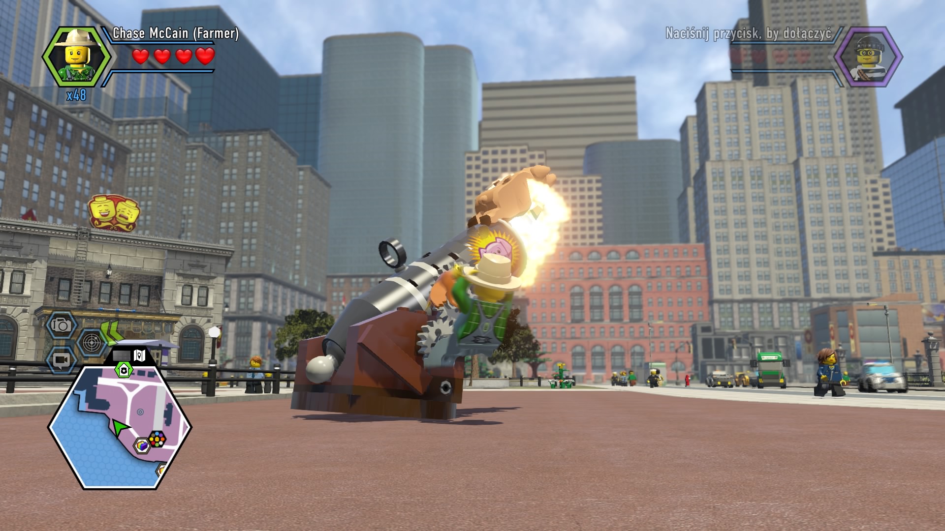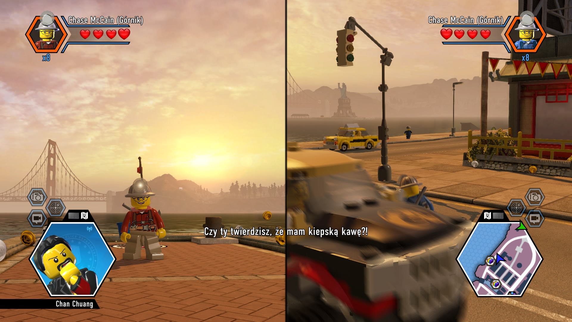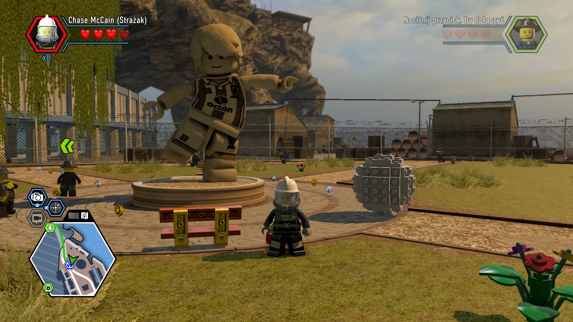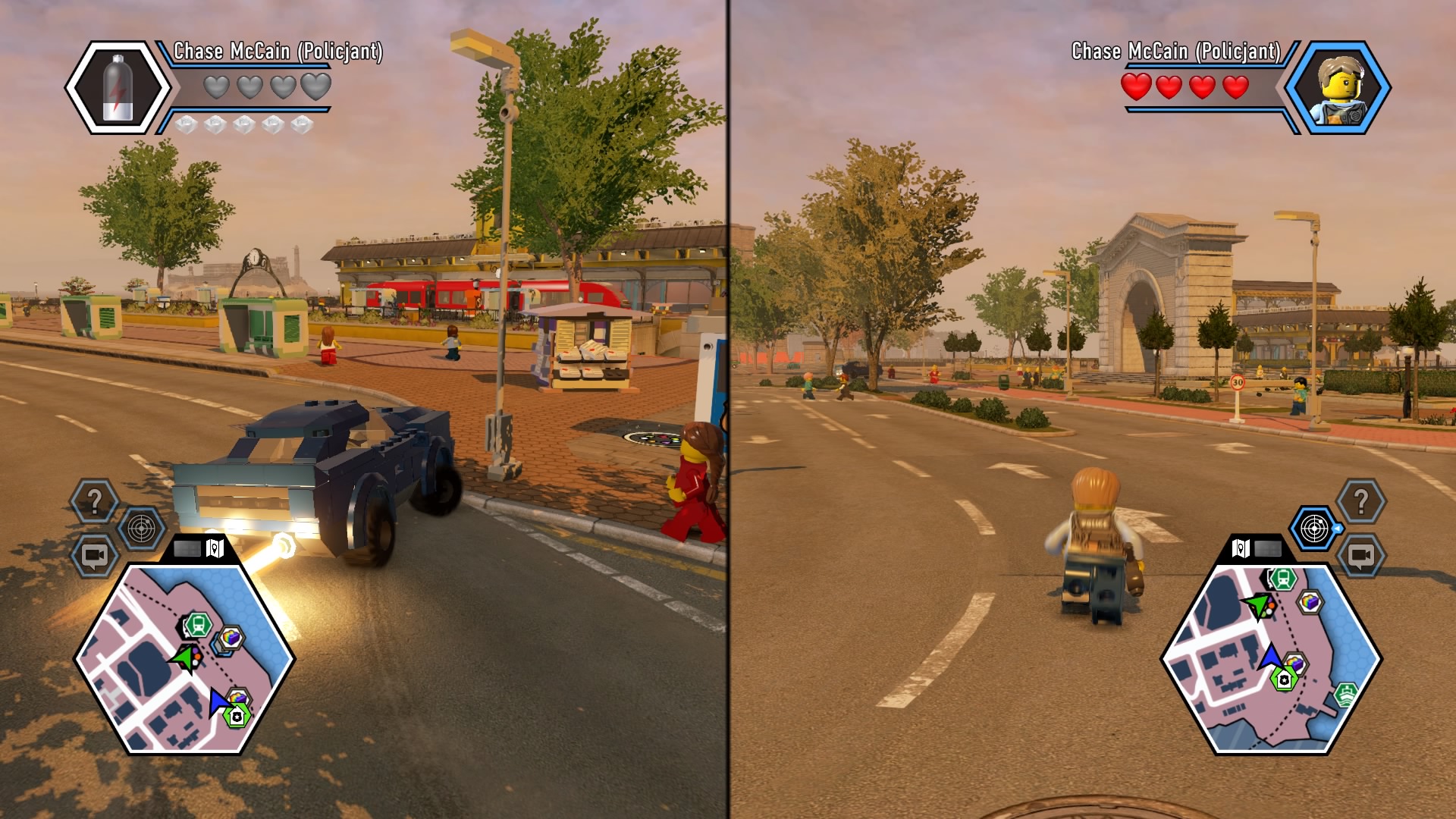 Co ważne, hasać po mieście bez ograniczeń możemy wspólnie z drugą osobą na jednym ekranie, jak zawsze brakuje komponentu multiplayer online, ale na to się już w serii Lego chyba nigdy nie doczekamy. Kooperacja przy jednej konsoli i możliwość zajmowania się całkowicie różnymi zadaniami doskonale wpływa na bezczynność jednego z grających, która potrafi nawiedzać serię. Doskonały tytuł do grania z pociechą, czy młodszym rodzeństwem, masa radości gwarantowana. Jedyne, do czego mogę się tu przyczepić to fakt, że czasami można nierozważnie przenieść drugiego gracza do nas, rozpoczynając misję fabularną. Owocuje to przerwaniem aktywności, którą się on zajmował, ale wystarczy czasami zerknąć co robi druga osoba, żeby nie dochodziło do konfliktów.