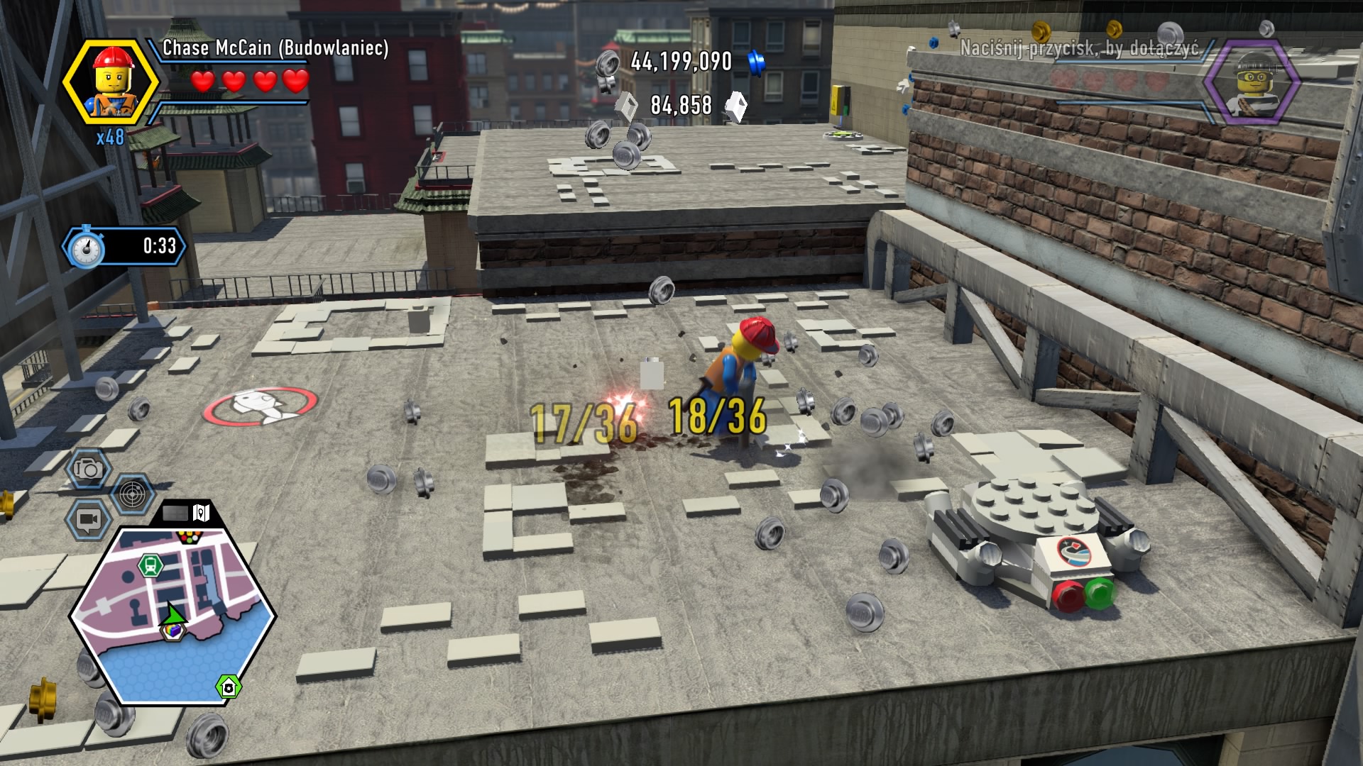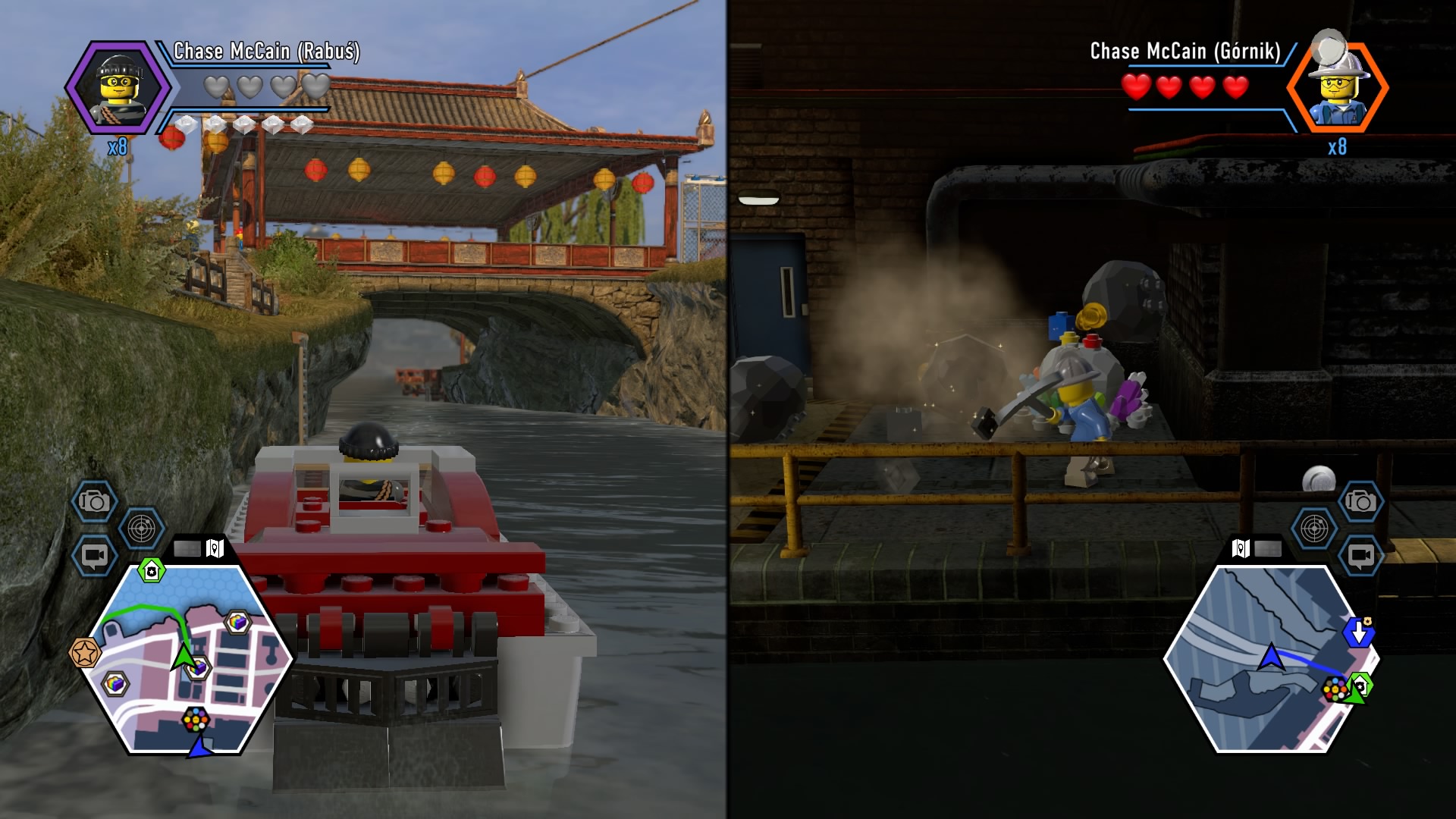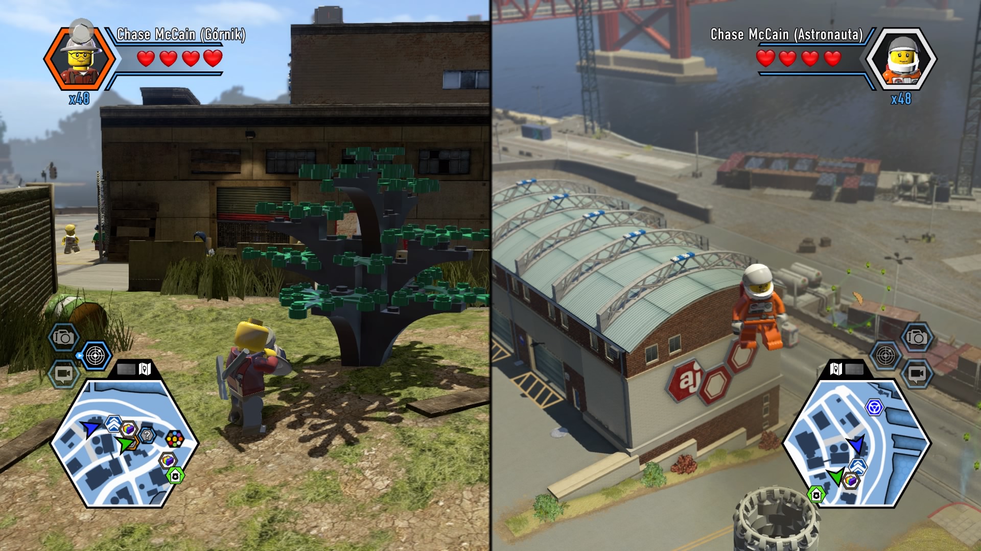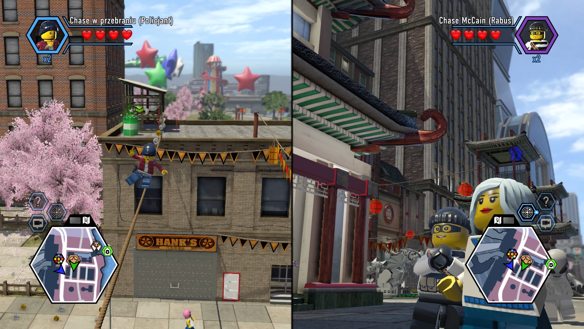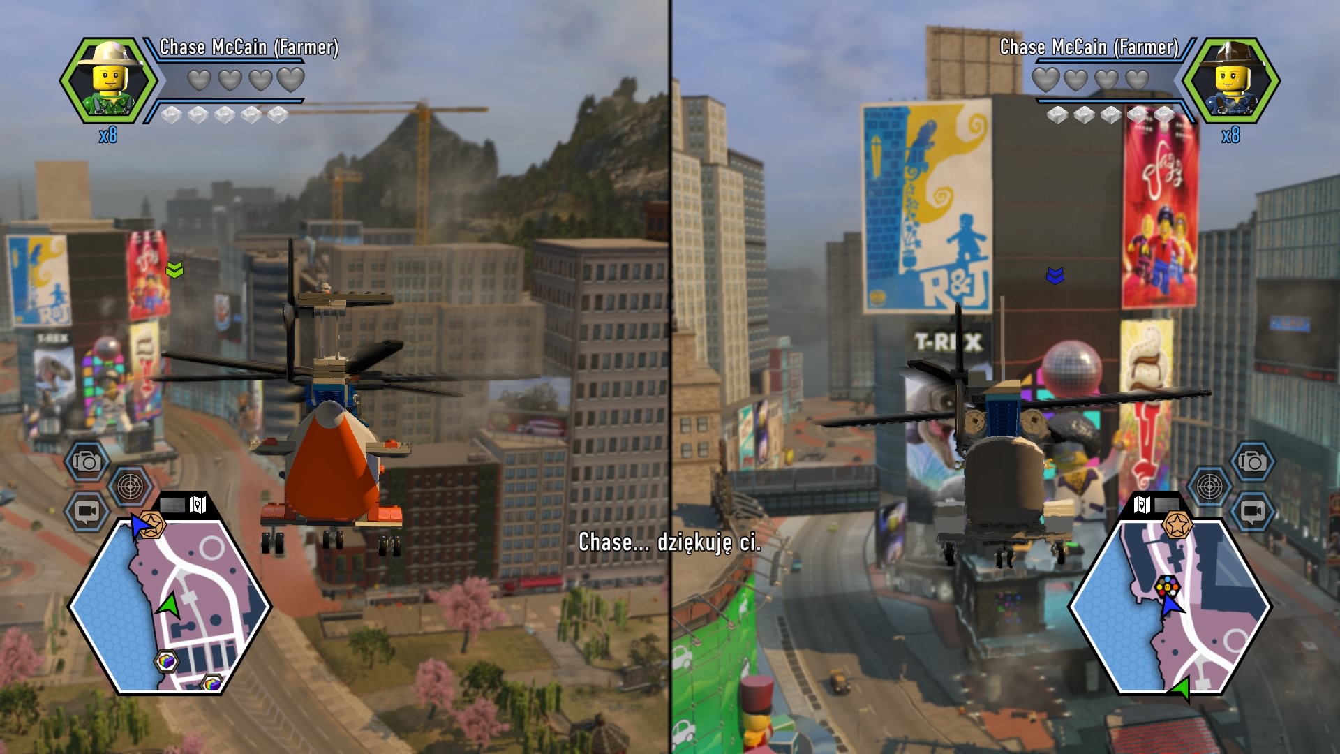 Co ważne, hasać po mieście bez ograniczeń możemy wspólnie z drugą osobą na jednym ekranie, jak zawsze brakuje komponentu multiplayer online, ale na to się już w serii Lego chyba nigdy nie doczekamy. Kooperacja przy jednej konsoli i możliwość zajmowania się całkowicie różnymi zadaniami doskonale wpływa na bezczynność jednego z grających, która potrafi nawiedzać serię. Doskonały tytuł do grania z pociechą, czy młodszym rodzeństwem, masa radości gwarantowana. Jedyne, do czego mogę się tu przyczepić to fakt, że czasami można nierozważnie przenieść drugiego gracza do nas, rozpoczynając misję fabularną. Owocuje to przerwaniem aktywności, którą się on zajmował, ale wystarczy czasami zerknąć co robi druga osoba, żeby nie dochodziło do konfliktów.