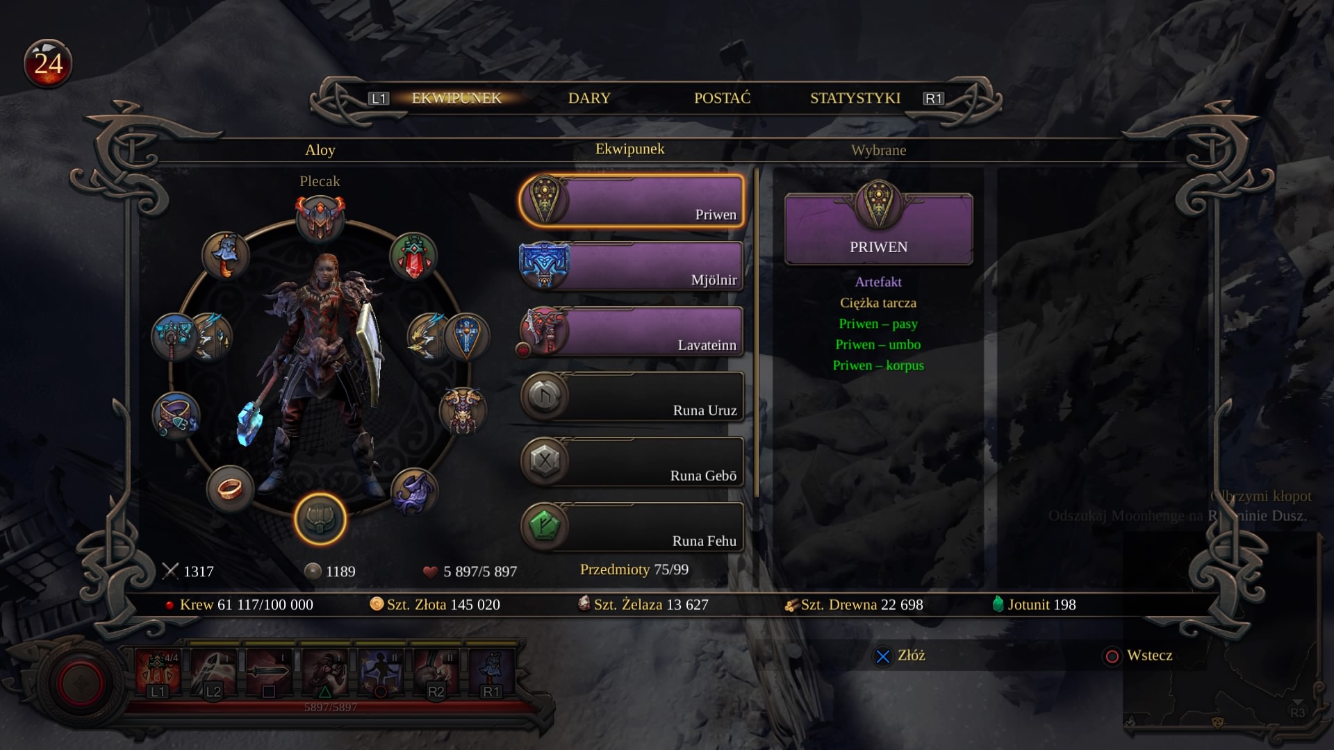 W tytule recenzji napisałem, że Vikings: Wolves of Midgard to uproszczone Diablo, więc teraz chciałbym się do tego odnieść. Zacznijmy od ekwipunku, szczególnie od pancerza, bo on w Wikingach dzieli się tylko na trzy części: hełm, szarfę oraz zbroję. Nie ma tutaj tak rozbudowanego systemu zbierania poszczególnych elementów jak buty, rękawice, naramienniki, który znamy z Diablo 3. Oczywiście pancerze i bronie zostały podzielone wedle jakości; od pospolitych, przez legendarne i epickie na Artefaktach kończąc. Artefakty są najlepszymi broniami, jakie możemy zdobyć w grze, jednak ich uzyskanie wymaga trochę czasu, gdyż każdy taki oręż jest rozbity na trzy części, które są dobrze ukryte w całym świecie gry. Gdy już zdobędziemy wszystkie elementy, to sami możemy je w dowolnym momencie połączyć, aby otrzymać potężną broń. Z dodatkowych przedmiotów mamy talizman, pierścień oraz dodatkowe akcesorium, które będzie nam dawało wsparcie do ataku lub obrony. Warto tutaj zatrzymać się chwilę przy talizmanach, bo one dają nam jedną dodatkową silną moc, która aktywuje się przyciskiem R1 i odnawia co 60 sekund. Może to być silny atak żywiołów, ale też czar, który unieruchomi przeciwników, zamieni w prosięta lub sprawi, że będą walczyć po naszej stronie. Może to być także czar obronny, np pole biotyczne, które przez kilka sekund będzie nam odnawiać zdrowie. Będąc przy regeneracji zdrowia, warto teraz opisać formę leczenia. Jak dobrze pamiętacie, w Diablo 3 Blizzard zrezygnował z buteleczek z eliksirami i mieliśmy tylko jeden eliksir zdrowia, który odnawiał się co kilkadziesiąt sekund. W Wikingach leczymy się za pomocą ładunków leczniczych, których możemy mięć przy sobie od 2 (duża odnowa zdrowia) do 4 (małe porcje odnowy). W trakcie wyprawy nie zabraknie miejsc w których możemy sobie zdrowie odnowić. Mało tego, że zdrowie zostanie przywrócone do maksymalnego poziomu, to jeszcze odzyskamy wszystkie wykorzystane ładunki lecznicze.