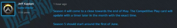 Jeff Kaplan poinformował na forum Battlenetu o przybliżonym terminie zakończenia 4 sezonu Overwatch. Poznaliśmy także datę rozpoczęcia piątego sezonu.