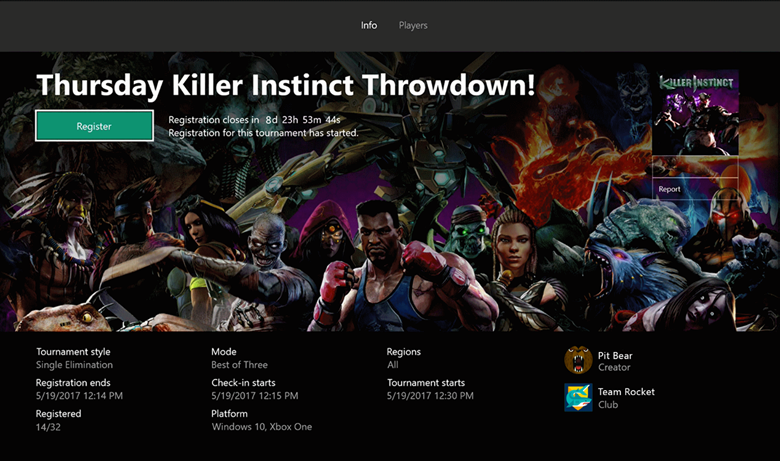 Na Twoim Xbox One znajdziesz również pierwsze turnieje tworzone przez graczy w Arenie w grze Killer Instinct. Będziesz mógł też tworzyć turnieje dla swojego Klubu Xbox Live w aplikacji Xbox na komputerach z systemem Windows 10. Wystarczy przejść na stronę Klubu, w którym jesteś załozycielem lub administratorem (lub utworzyć Klub tylko dla swoich turniejów!) i przejść do karty “Turnieje”. Tam zobaczysz opcję tworzenia turnieju – ustaw datę i godzinę, zmień ustawienia i dodaj opis – i kilka kliknięć później masz zaplanowany swój własny turniej! Pamiętaj, aby reklamować Twój turniej w Kanale aktywności Klubu, aby rekrutować graczy, Mamy nadzieję, że pozostaną oni Twoimi przyjaciółmi nawet, gdy zgarniesz pierwsze miejsce.