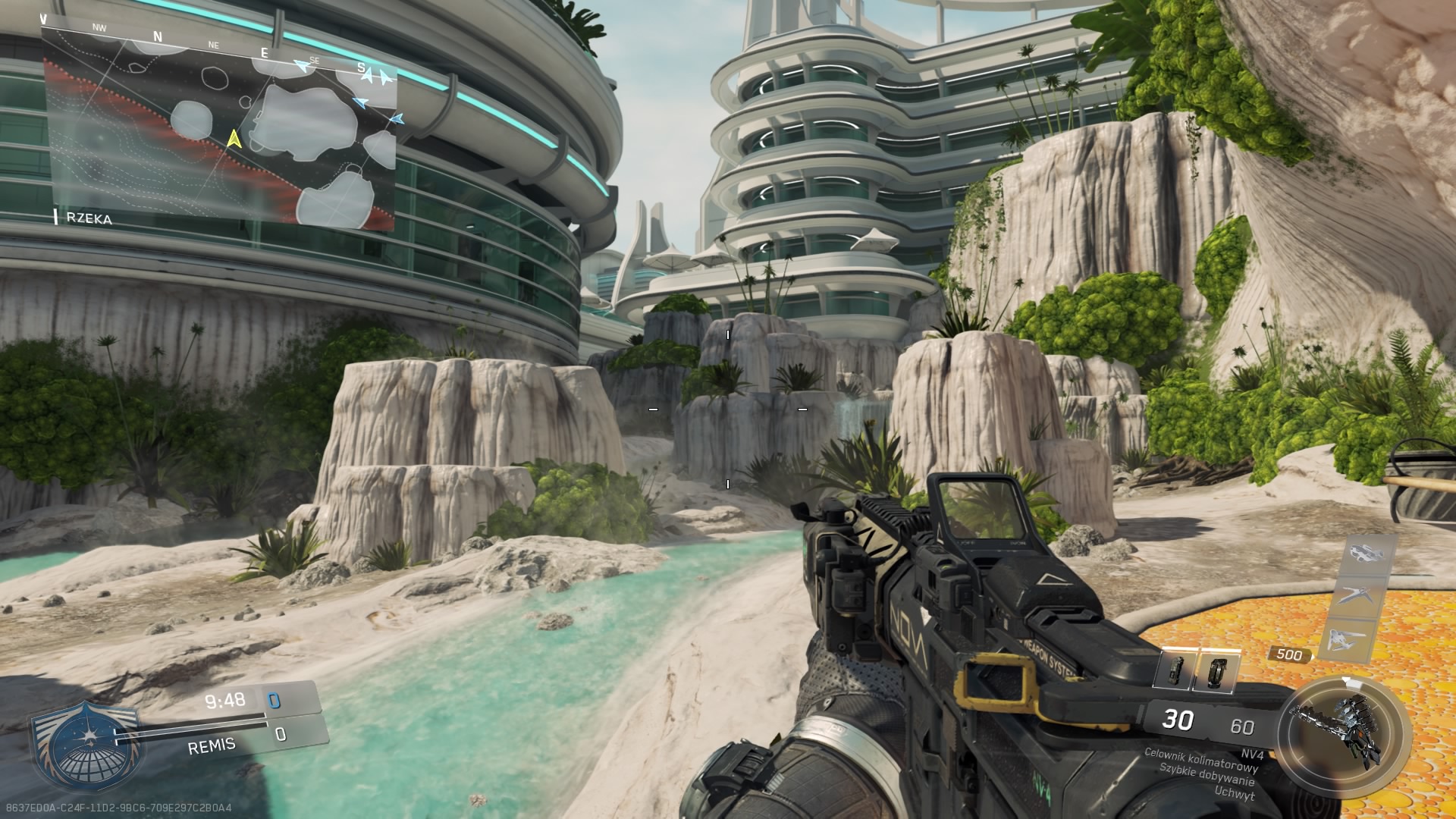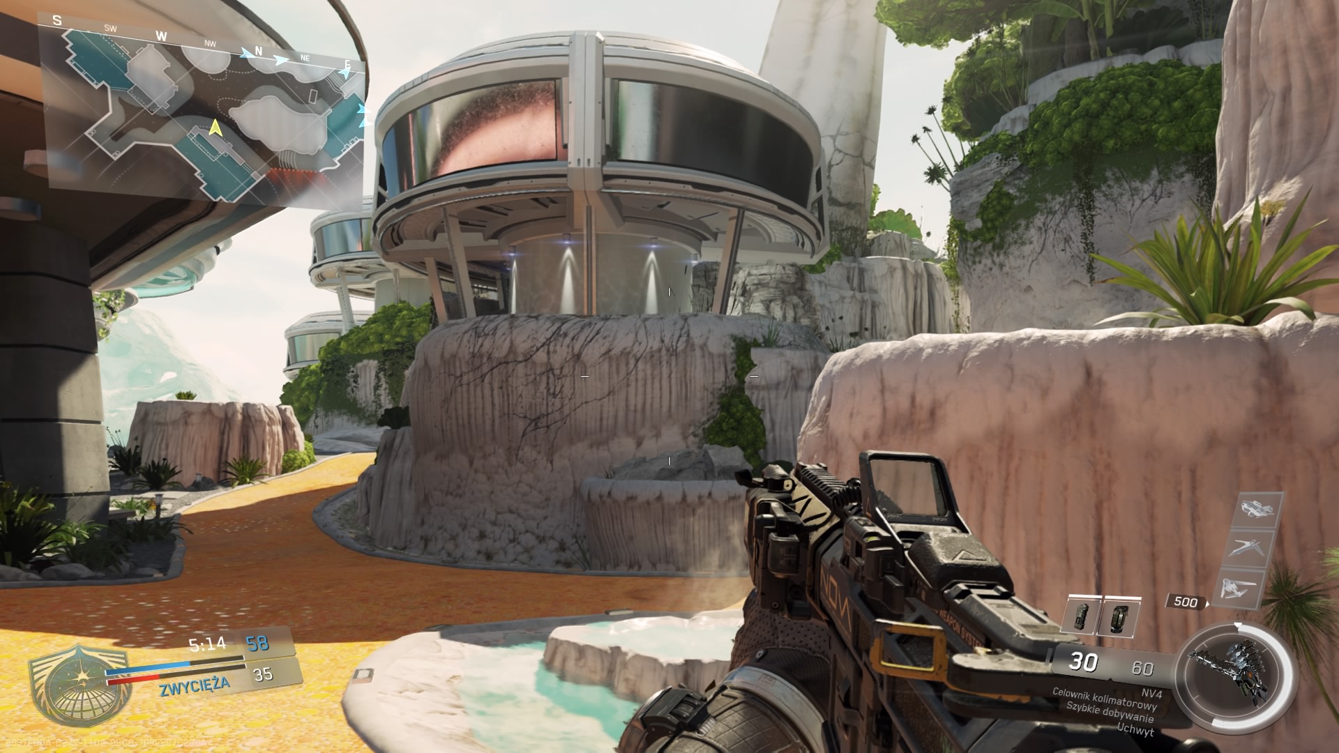 Na drugi ogień idzie kolejna mapa: Turista. Akcja rozgrywa się w zaawansowanym technologicznie ośrodku, który mieści się w szkielecie obcego stwora. Mapa jest bardzo wyrazista, dominuje biel, możemy podziwiać piękne widoczki zarówno te poza mapą jak i w jej centrum. Ośrodek otaczają skały porośnięte dziką roślinnością, a gdzieś po środku płynie potok u szczytu którego znajduje się wodospad. Turista to chyba jedna z przyjemniejszych map, które znajdują się w bibliotece Infinite Warfare zarówno pod względem estetycznym jak i gameplayowym. Jej trójliniowy układ pozwala na grę na kilka różnych sposobów.