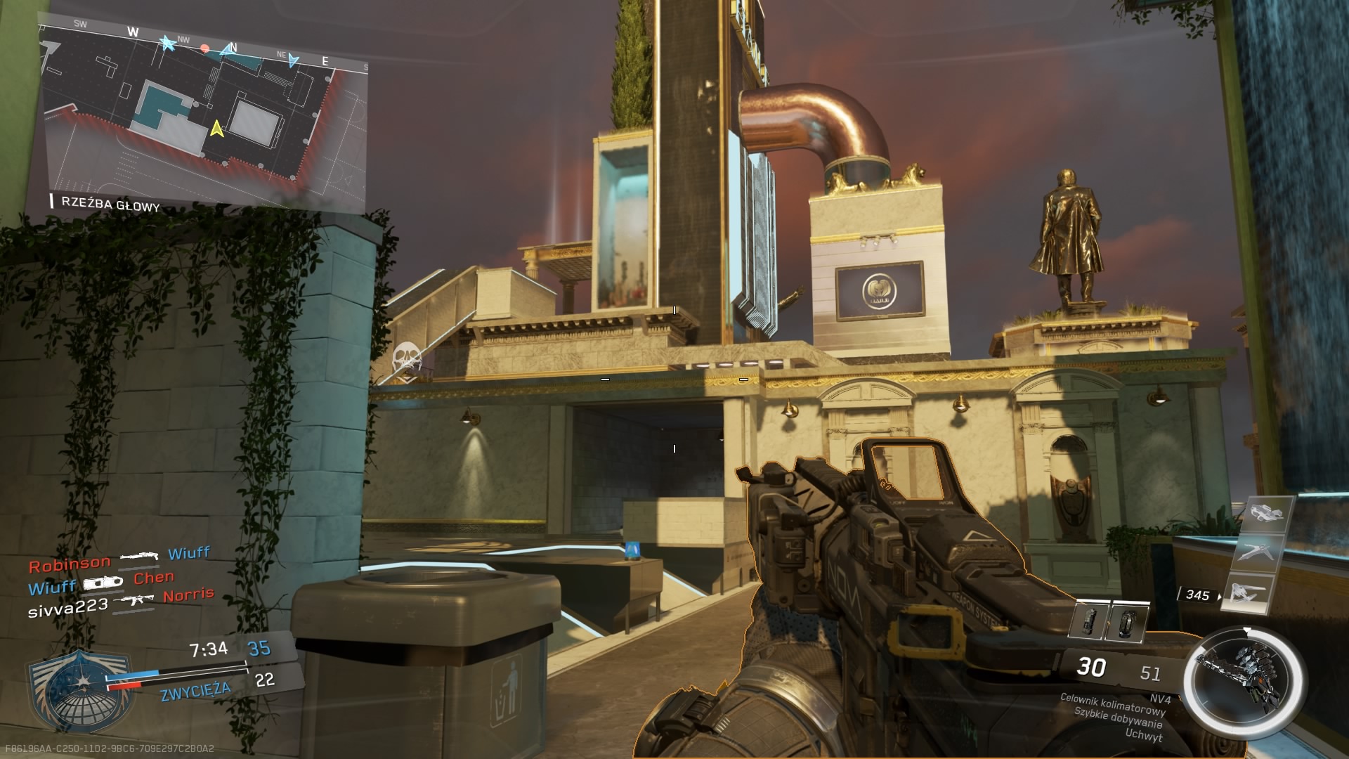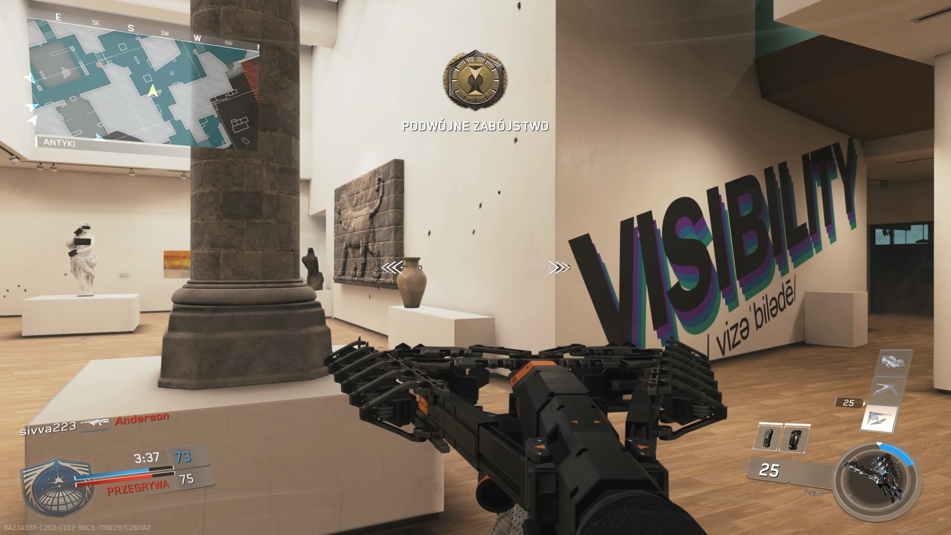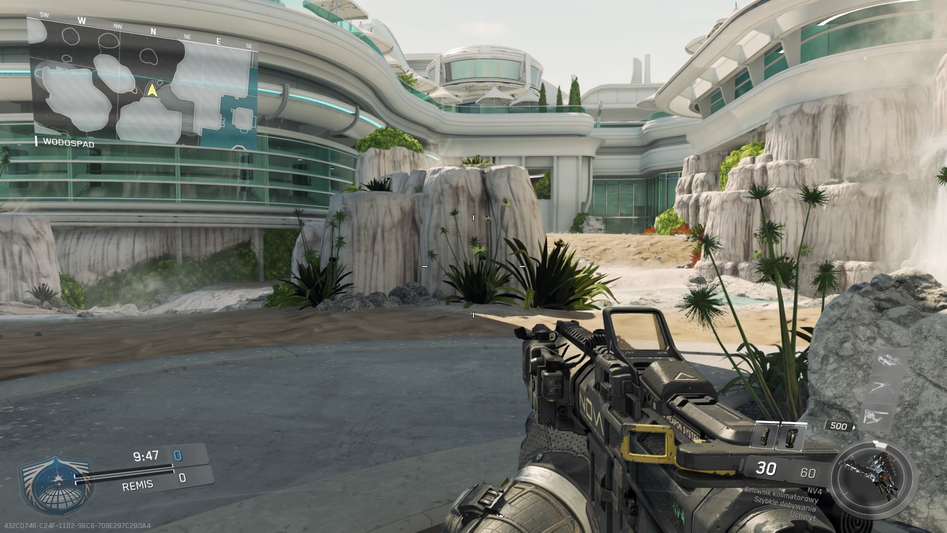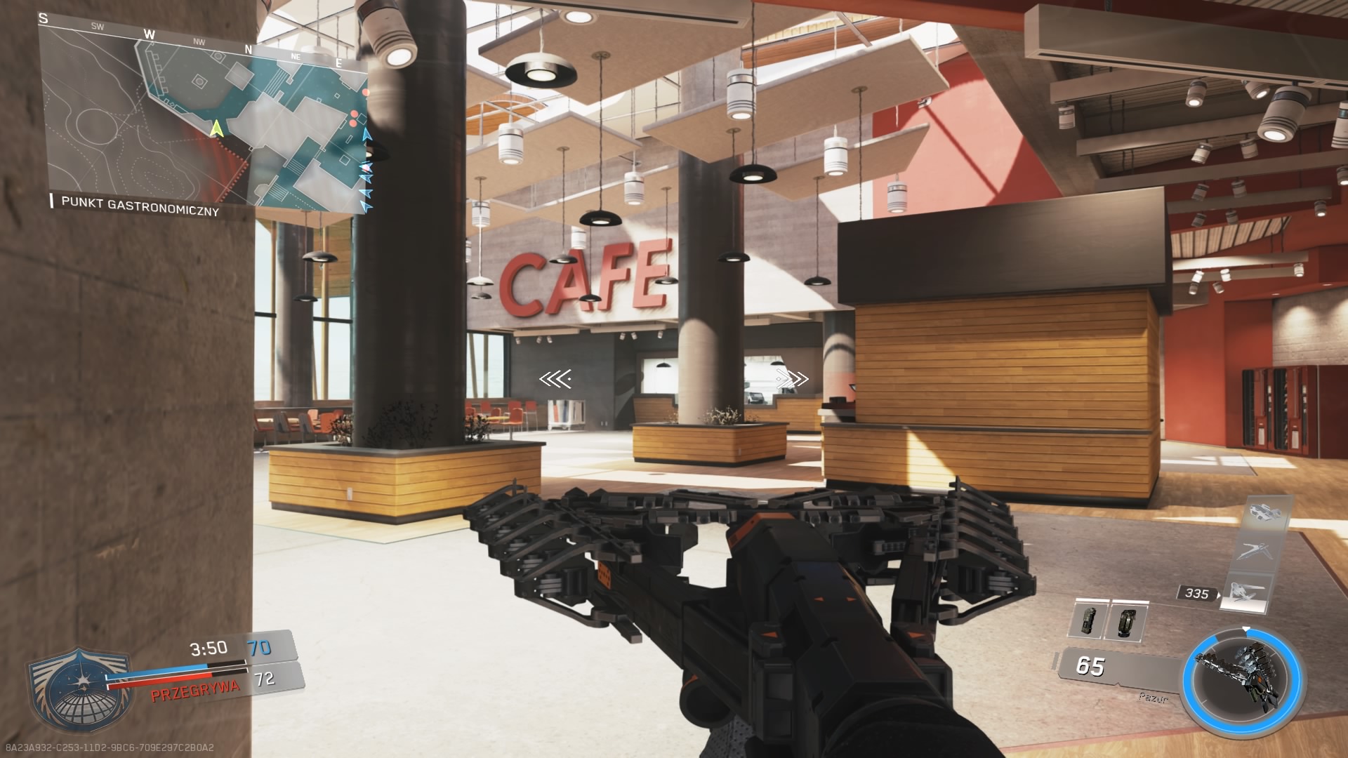 Trzecia mapa z dodatku Continuum, to Archive. Mnie osobiście średnio przypadła do gustu. Akcja rozgrywa się w post – futurystycznej galerii sztuki. Z jednej strony mamy tutaj sporo ciasnych korytarzy umożliwiających ostrzał na krótki i średni dystans, a z drugiej dużą otwartą przestrzeń wokół galerii, gdzie pole do popisu mają dalekodystansowcy. Zdecydowanie brakuje tutaj elementu wykończeniowego. Obszar wokół budynku przepełnia pustka, o której ciężko nie wspomnieć. W budynku mamy kawiarnię, jest kasa biletowa no i oczywiście dzieła sztuki. Elementem rozpoznawczym mapy jest głowa rekina znajdująca się zaraz na wejściu.