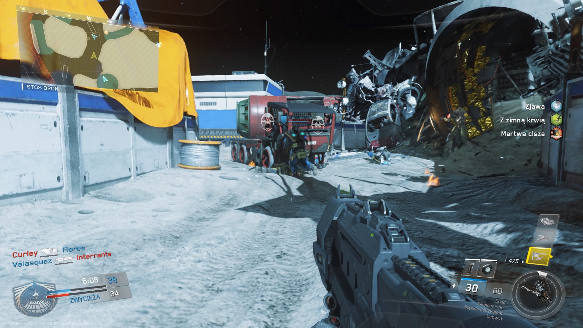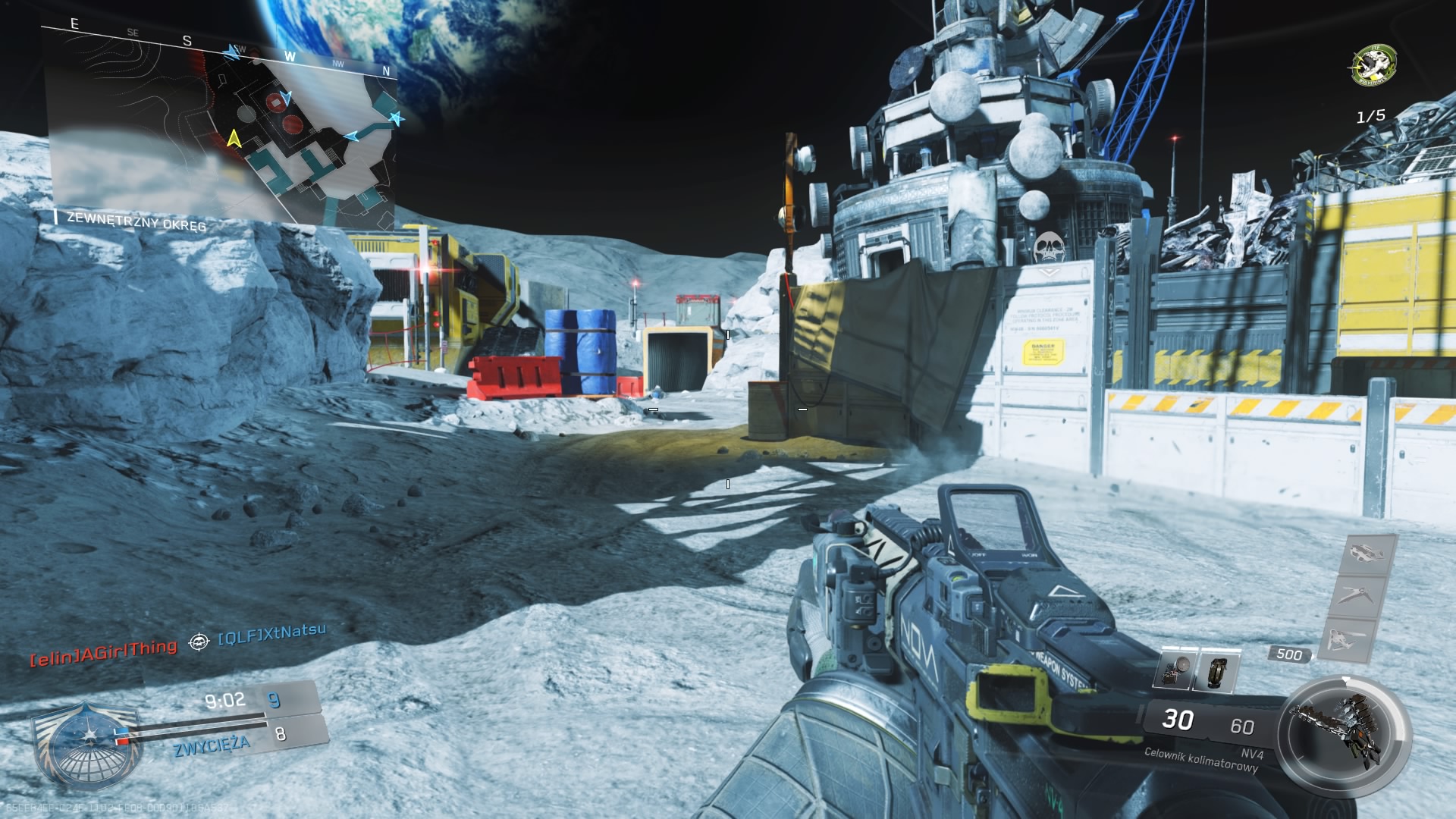 Ostatnia już mapa DLC, to Scrap. Miejscem zabawy jest porzucone księżycowe złomowisko. Mamy tutaj różne ciężkie sprzęty, dźwigi, koparki, jakieś wysięgniki, a nawet urządzenie mielące. Trzeba uważać, aby przypadkowo tam nie wskoczyć, bo można w głupi sposób stracić życie. Mamy tutaj miejsca umożliwiające bieganie po ścianach a właściwie po suficie, głową w dół. To chyba jedyny element charakterystyczny dla tej mapy. Ogólnie nie ma tutaj niczego ciekawego. Duża otwarta przestrzeń, każdy skok trzeba dwa razy przemyśleć zanim się go wykona. Delikatne wzniesienie się ponad niewielkie przeszkody może oznaczać wysunięcie się wprost pod celownik przeciwnika.