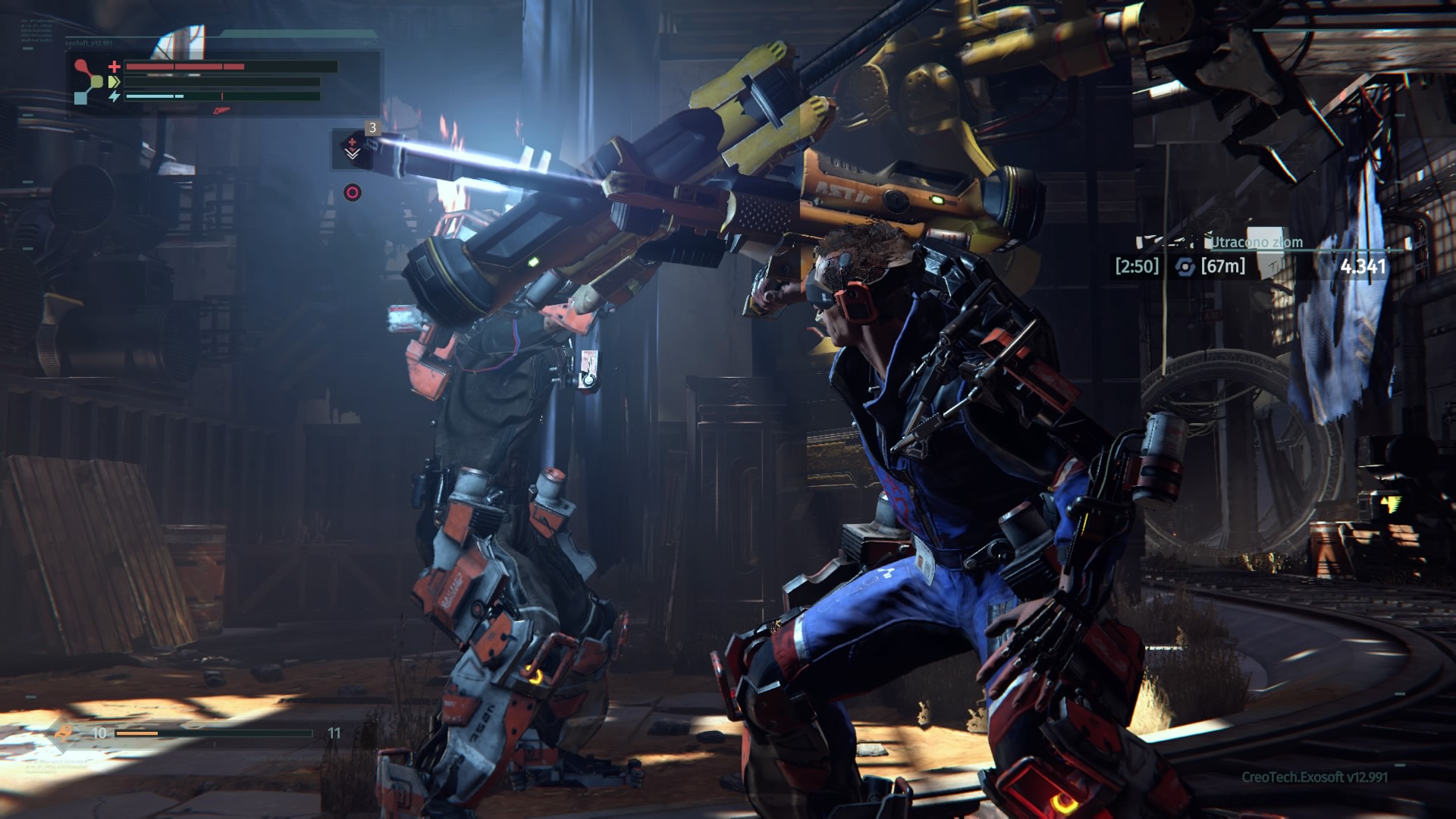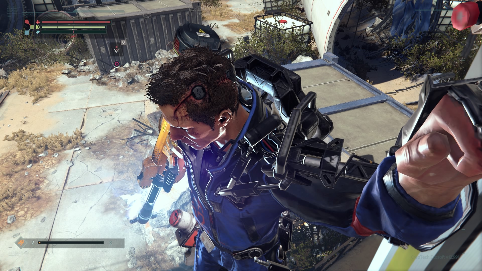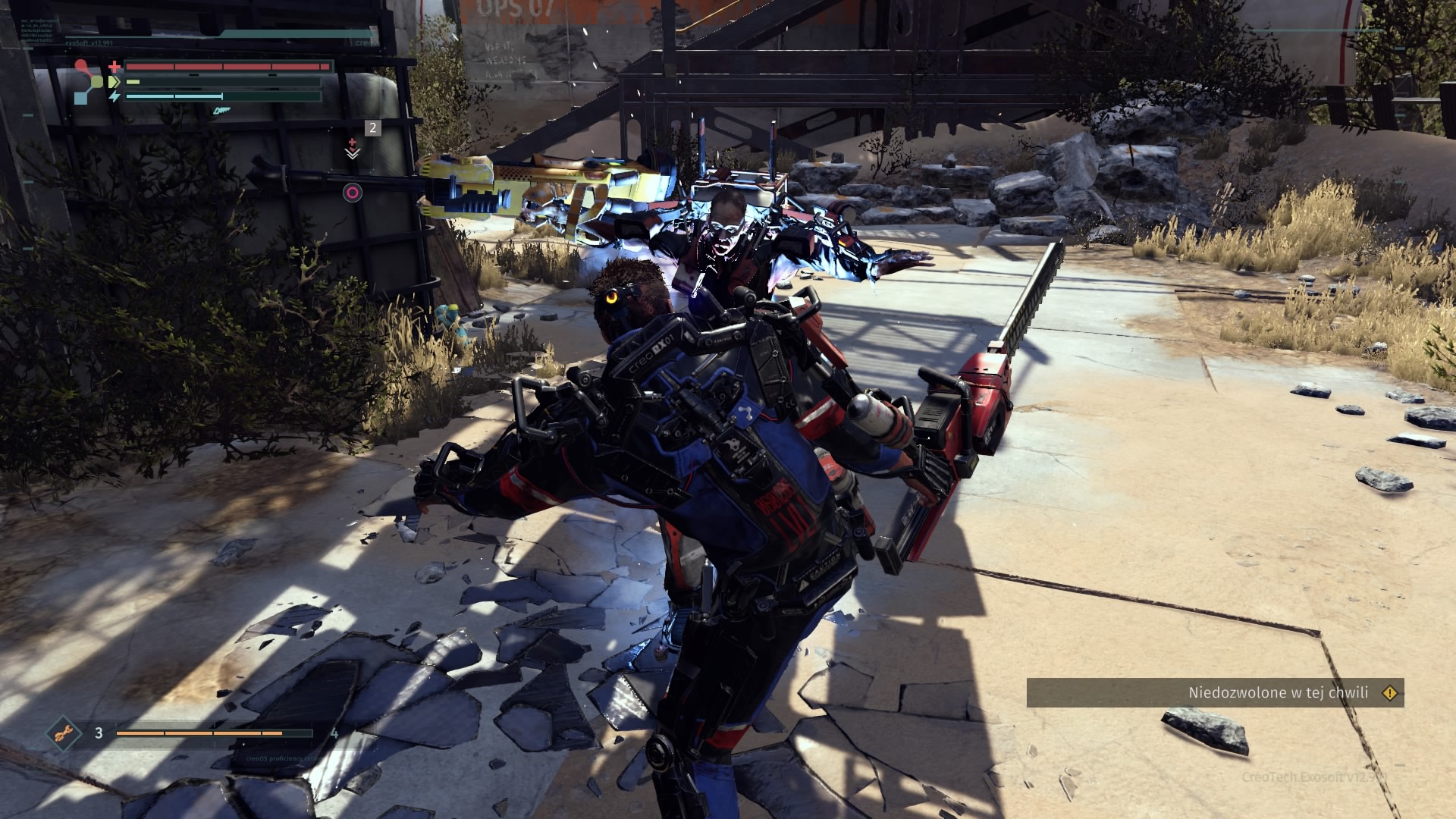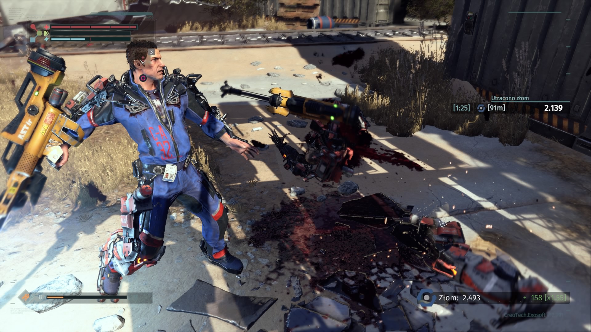 Wspominałem już, że na naszej drodze co i rusz stają przeciwnicy. Warren jest sobie w stanie z nimi bardzo efektowanie, a także efektywnie, poradzić. Walcząc z oponentami nieodzowne jest namierzanie naszego celu (blokujemy się na nim, naciskając prawą gałkę analogową). Otwiera nam to dostęp do mierzenia w poszczególne części przeciwnika. Jest to tym istotniejsze, że odpowiednio częste i mocne uderzanie nóg, ręki trzymającej broń, czy głowy zwiększa szanse na odcięcie danego elementu (po przytrzymaniu kwadratu na padzie). Nie dostarcza to przyjemności jedynie wizualnej, ale odciętą część (jeśli jest w dobrym stanie) możemy sami wyekwipować. Jest to podstawa zwiększania statystyk głównego bohatera. Bronie i osłony zdobywa się na przeciwnikach, stąd walki będziecie toczyć często. Co nieraz sprawia, że porywamy się z motyką na słońce – lepszy przeciwnik oznacza lepszy łup i lepsze statystyki, ale i zdecydowanie większe prawdopodobieństwa śmierci. The Surge jednak jak mało która inna gra wywołuje u gracza podejście na zasadzie „JA nie dam rady?”. I często nie dajesz. Ale i tak próbujesz. Bo „JA nie dam rady?”.